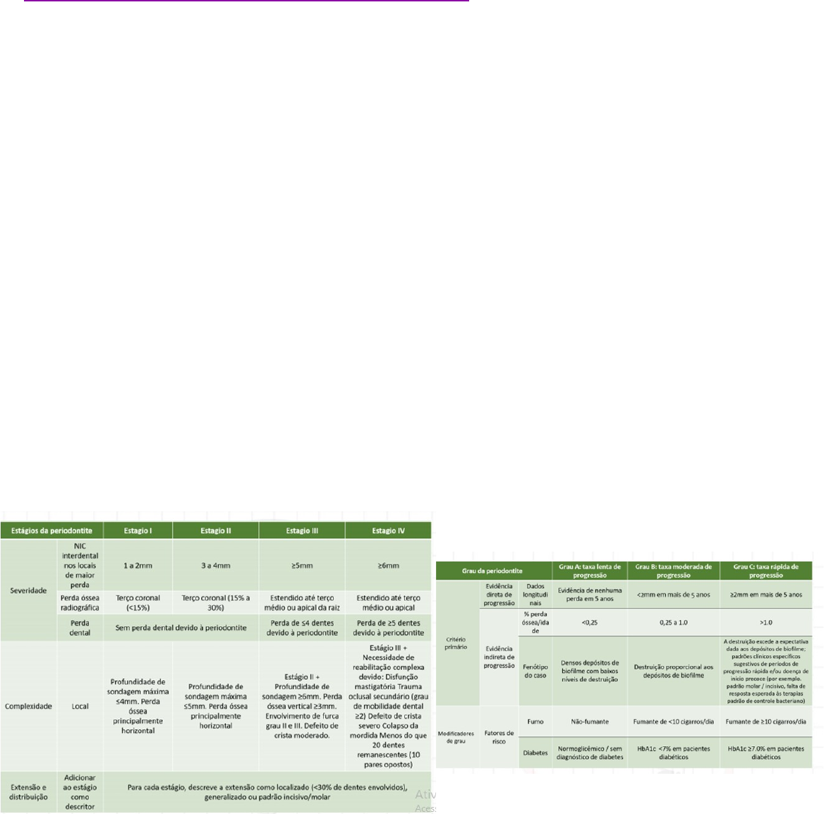 Resumo - PERIODONTIA Ana Karoline Fossá Classificação e Diagnóstico das Doenças Periodontais · Gengivite: Inflamação da gengiva sem perda de inserção. É reversível com controle adequado. · Periodontite: Doença inflamatória crônica que leva à destruição dos tecidos de suporte dos dentes, incluindo o osso alveolar. A progressão da periodontite pode levar à mobilidade dental e até perda de dentes. · Evolução da periodontite: 1. Gengivite; 2. Perda de inserção conjuntiva; 3. Perda do osso periodontal; 4. Formação de bolsa periodontal; 5. Retração gengival; 6. Mobilidade dental Doenças gengivais induzidas por biofilme dental → Se for maior que 30% e gengivite generalizada; Entre 10 e 30% e localizada Doenças gengivais não induzidas por biofilme dental → Gengivite Medicamentosa; Gengivite Alérgica Gengivite Hormonal; Gengivite Viral; Gengivite Neoplásica; Mobilidade dentária - Miller · Grau 0: mobilidade fisiológica, de 0,1 a 0,2mm da direção horizontal do alvéolo · Grau 1: aumento da mobilidade da coroa do dente de, no máximo, 1mm na direção horizontal · Grau 2: aumento da mobilidade da coroa do dente em mais de 1mm na direção horizontal · Grau 3: grave mobilidade da coroa do dente tanto na direção horizontal quanto na vertical Evolução da lesão de furca: Sondar a região interradicular · Classe I: profundidade à sondagem horizontal menor ou igual a 3mm a partir de uma ou duas entradas · Classe II: profundidade à sondagem horizontal menor que 3mm a partir, no máximo, de uma entrada e/ou combinado com a Classe I · Classe III: profundidade à sondagem horizontal menor que 3mm a partir de duas ou mais entradas Tratamento periodontal 1º → Envolve mudança de comportamento e motivação do paciente; instruções de higiene oral, terapias para inflamação gengival, e remoção mecânica profissional de placa bacteriana. O controle dos fatores de risco é essencial. 2º → Controle do biofilme e cálculo subgengival por instrumentação. Utilização de adjuvantes químicos, antimicrobianos locais ou sistêmicos. Avaliação periódica para verificar se os objetivos foram alcançados. 3º → Indicada para áreas que não responderam adequadamente às etapas anteriores. Inclui procedimentos cirúrgicos como: Cirurgia de retalho. Cirurgias ressectivas ou regenerativas para tratar lesões complexas. Controle Mecânico e Químico da Doença Periodontal Controle mecânico: Envolve a remoção de biofilme por meio da escovação dental e uso de fio dental. Instrumentação profissional, como raspagem e alisamento radicular, também faz parte desse controle. Controle químico: Uso de agentes antimicrobianos como: · Clorexidina: Considerada o padrão-ouro no controle químico, pode ser usada na forma de enxaguante bucal ou gel. · Óleos essenciais: Como no enxaguante Listerine. · Triclosan: Um agente antimicrobiano presente em algumas pastas de dentes. Abscesso Abscesso periodontal (na gengiva) local com bolsa periodontal, e o abscesso periapical (na raiz). O tratamento envolve a drenagem e a eliminação da infecção na área. · Abscesso periodontal: Se forma no tecido periodontal, que envolve o dente (gengiva, osso alveolar e ligamento periodontal), e é uma resposta inflamatória aguda causada por uma infecção bacteriana que geralmente se origina no biofilme subgengival. A principal causa não está relacionada diretamente à cárie, mas ao acúmulo de biofilme e cálculo nas bolsas periodontais, que leva à infecção e formação de pus. · Abscesso endodôntico ou periapical: é causado pela necrose pulpar, que é a morte do tecido nervoso dentro do dente, geralmente devido à cárie profunda que atinge a polpa. Quando a polpa se infecta e necrosa, as bactérias migram pelos canais radiculares até o ápice do dente, resultando em um abscesso periapical. · Abscesso gengival: Apresenta rubor (vermelhidão) localizado na gengiva. Características: Não há presença de fístula ou bolsa periodontal. Causa: Geralmente ocorre devido à presença de um corpo estranho, como uma casca de pipoca ou partículas de alimentos presas na gengiva. Tratamento: Remoção cuidadosa do corpo estranho e higienização local. Tratamento: Drenagem do abscesso; Raspagem alisamento radicular (Abscesso periodontal); Pode ser prescrito antibióticos; Cirurgia periodontal Antes da cirurgia devemos fazer o controle do cálculo, placa e tecido inflamados para para ter uma melhor cirurgia sem contaminação); Posicionamento das margens das restaurações/próteses e seu impacto periodontal: 1. Margem Supragengival: - Impacta menos o periodonto, sendo ideal em áreas não estéticas. - Com materiais mais translúcidos e técnicas adesivas modernas, tornou-se possível utilizar essa margem também em zonas estéticas. - Preferível sempre que possível, pois combina vantagens estéticas e periodontais. 2. Margem a Nível Gengival: - Antes, era evitada por receios de retenção de biofilme e exposição em casos de recessão gengival. - Hoje, essas preocupações são menores, pois as margens podem ser harmonizadas esteticamente e finalizadas com precisão na interface gengival. 3. Margem Subgengival: - É de difícil acesso para acabamento e polimento. - Se posicionada muito abaixo da crista gengival, pode violar o espaço biológico, prejudicando o aparato de inserção gengival. Consequentemente, é recomendado que haja pelo menos 3mm entre a margem gengival e a crista óssea. EBP adequado quando a restauração é posicionada a 0,5mm no interior do sulco gengival. Terapia ortodôntica Pode ser um importante auxílio na terapia periodontal, devendo ser aplicada apenas após o controle da doença periodontal ativa. Violações do espaço biológico periodontal (EBP) podem ser corrigidas com a remoção cirúrgica do osso próximo às margens da restauração ou pela extrusão ortodôntica. Aplica-se uma força de extrusão lenta, erupcionando vagarosame