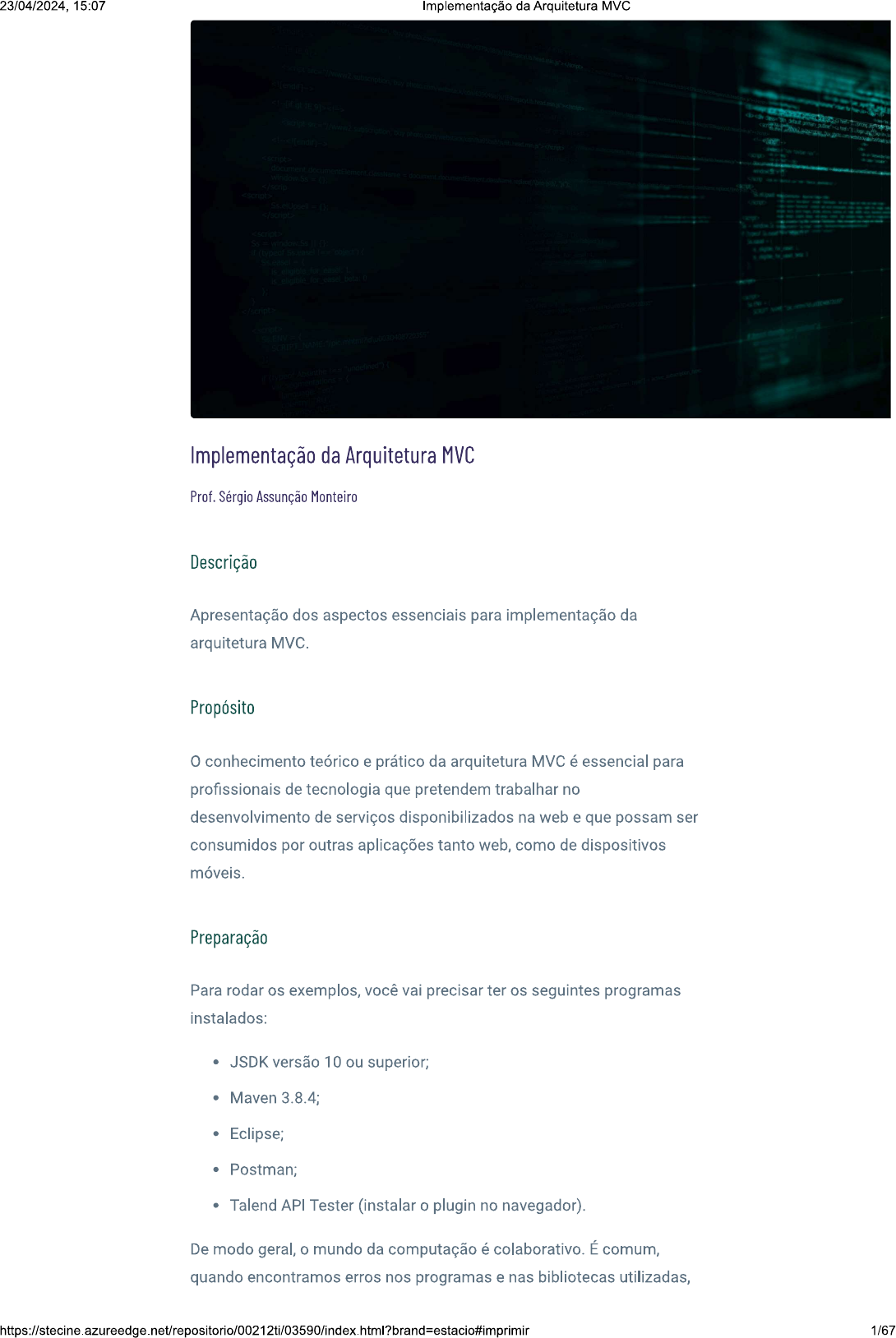 23/04/2024, 15:07 Implementação da Arquitetura MVC Implementação da Arquitetura MVC Prof. Sérgio Assunção Monteiro Descrição Apresentação dos aspectos essenciais para implementação da arquitetura MVC Propósito o conhecimento teórico e prático da arquitetura MVC é essencial para profissionais de tecnologia que pretendem trabalhar no desenvolvimento de serviços disponibilizados na web e que possam ser consumidos por outras aplicações tanto web, como de dispositivos móveis. Preparação Para rodar os exemplos, você vai precisar ter os seguintes programas instalados: JSDK versão 10 ou superior; Maven 3.8.4; Eclipse; Postman; Talend API Tester (instalar o plugin no navegador). De modo geral, o mundo da computação é colaborativo. É comum, quando encontramos erros nos programas e nas bibliotecas utilizadas, 1/6723/04/2024, 15:07 Implementação da Arquitetura MVC copiarmos o log de erro e procurarmos em qualquer motor de busca. Provavelmente, alguma resposta será retornada em algum fórum de discussão, como StackOverflow, Github, Reddit, entre outros. Não só isso é uma prática comum na comunidade de desenvolvimento de software e computação, como também nos possibilita aprender cada vez mais. Objetivos Módulo 1 Compreendendo e utilizando 0 gerenciador de dependências Maven Reconhecer o gerenciador de dependências Maven. Módulo 2 Criação de um projeto Spring Boot Analisar a criação de um projeto Spring Boot. Módulo 3 Criação dos pacotes segundo 0 modelo MVC Identificar os aspectos para a criação dos pacotes segundo o modelo MVC. Introdução Vivemos em uma época com demandas em todas as áreas: econômica, social, entretenimento, notícias, política, educação, ciências, entre muitas outras. Em especial, no ambiente web, essas 2/6723/04/2024, 15:07 Implementação da Arquitetura MVC demandas são atendidas por aplicações que seguem um modelo de computação distribuída no qual as diversas partes envolvidas se comunicam por meio de protocolos, mas são independentes umas das outras. Nesse cenário, a própria construção das aplicações exigiu compartimentar as unidades dos sistemas de modo que pudessem ter ciclos evolutivos diferentes que não prejudicassem o objetivo principal deles. A arquitetura MVC trata exatamente da separação dos módulos de uma aplicação como modelo, visão e controle. Além disso, o uso de ferramentas como o Maven e de frameworks como o Spring Boot auxilia e padroniza o processo de desenvolvimento. Ao longo deste conteúdo, vamos abordar esses assuntos e implementaremos algumas aplicações práticas que nos ajudarão a entender como usar esses recursos no dia a dia. 1 - Compreendendo e utilizando 0 gerenciador de dependências Maven Ao final deste módulo, você será capaz de reconhecer 0 gerenciador de dependências Maven. Introdução ao gerenciador de dependências Maven 3/6723/04/2024, 15:07 Implementação da Arquitetura MVC Aspectos básicos da arquitetura MVC padrão de arquitetura MVC - abreviatura de Model-View-Controller - faz a separação de uma aplicação em três componentes principais (SPÄTH, 2021): Modelo É a parte responsável pelo domínio de dados, ou seja, pelas operações de recuperação e armazenamento de dados de um banco de dados. De forma mais objetiva, é nessa camada que fazemos o mapeamento das tabelas do banco de dados e de suas respectivas colunas, com classes que serão gerenciadas pela aplicação. Visão É o componente responsável pela interface do usuário com a aplicação. Exemplos de aplicações da camada de visão são: Telas para operações de cadastro, consulta e edição de tabelas. Exibição de relatórios. Controlador É o componente que trata da interação do usuário com o modelo. Isso significa que o controlador é quem faz tratamentos de dados, como conversões, consultas e quaisquer procedimentos associados à manipulação lógica dos dados, de modo que a camada de visão receba esses resultados em um formato que possa ser exibido sem a necessidade de outras operações. padrão MVC nos ajuda a segmentar as diferentes partes de uma aplicação em lógica de acesso a dados, lógica de negócios e lógica da 4/6723/04/2024, 15:07 Implementação da Arquitetura MVC interface do usuário, e nos dá ao mesmo tempo um mecanismo para realizar um acoplamento fraco entre esses elementos. Essas características são muito úteis para desenvolvimento de grandes projetos em equipe. Mas o MVC é apenas uma arquitetura. Para utilizá-la na prática, precisamos de ferramentas que nos auxiliem nesse processo. Aqui, vamos estudar o Maven. 0 gerenciador de dependências Maven Apache Maven é uma ferramenta de automação para construção e gerenciamento de projetos baseados em Java. Entre as aplicações do Maven, podemos destacar: Disponibilidade de muitas dependências que podem ser adicionadas para o projeto; Padronização da configuração do projeto; Gerenciamento de dependências com atualização automática; Compatível com versões anteriores; Disponibilização de relatório de erros; Garantia do uso consistente em todos os projetos; Facilidade de integração do projeto com o sistema de controle de versões. Agora que tivemos uma visão geral do Maven, vamos entender seus aspectos fundamentais e como fazer a sua instalação e configuração. Conceitos básicos Maven é formado pelos seguintes componentes: Arquivos POM São arquivos XML que contêm informações sobre o projeto e informações de configuração, como dependências, por exemplo, que são usadas pelo Maven para construir o projeto. Dependências e repositórios 5/6723/04/2024, 15:07 Implementação da Arquitetura MVC As dependências são bibliotecas externas necessárias para o projeto; já os repositórios são diretórios de arquivos JAR empacotados. Ciclos de vida de construção, fases e metas Um ciclo de vida de construção é uma sequência de fases, sendo que uma fase consiste em u