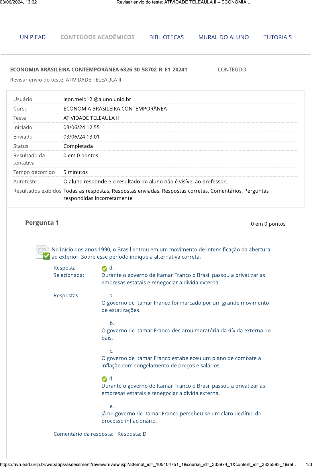 03/06/2024, 13:02 Revisar envio do teste: ATIVIDADE TELEAULA - UNIP EAD CONTEÚDOS ACADÊMICOS BIBLIOTECAS MURAL DO ALUNO TUTORIAIS ECONOMIA BRASILEIRA CONTEMPORÂNEA 6826-30_58702_R_E1_20241 CONTEÚDO Revisar envio do teste: ATIVIDADE TELEAULA Usuário igor.melo12@aluno.unip.br Curso ECONOMIA BRASILEIRA CONTEMPORÂNEA Teste ATIVIDADE TELEAULA Iniciado 03/06/24 12:55 Enviado 03/06/24 13:01 Status Completada Resultado da 0 em 0 pontos tentativa Tempo decorrido 5 minutos Autoteste aluno responde e o resultado do aluno não é visível ao professor. Resultados exibidos Todas as respostas, Respostas enviadas, Respostas corretas, Comentários, Perguntas respondidas incorretamente Pergunta 1 0 em 0 pontos No Início dos anos 1990, o Brasil entrou em um movimento de intensificação da abertura ao exterior. Sobre esse período indique a alternativa correta: Resposta d. Selecionada: Durante o governo de Itamar Franco o Brasil passou a privatizar as empresas estatais e renegociar a dívida externa. Respostas: a. governo de Itamar Franco foi marcado por um grande movimento de estatizações. b. governo de Itamar Franco declarou moratória da dívida externa do país. C. governo de Itamar Franco estabeleceu um plano de combate a inflação com congelamento de preços e salários. d. Durante o governo de Itamar Franco o Brasil passou a privatizar as empresas estatais e renegociar a dívida externa. e. no governo de Itamar Franco percebeu-se um claro do processo inflacionário. Comentário da resposta: Resposta: D 1/303/06/2024, 13:02 Revisar envio do teste: ATIVIDADE TELEAULA ECONOMIA... Pergunta 2 0 em 0 pontos No final de 1993, Fernando Henrique Cardoso anunciou um processo de estabilização econômica que se estenderia pelos próximos meses. Sobre esse período indique a alternativa incorreta. Resposta b. Selecionada: No Plano Real foi adotado um gatilho inflacionário para garantir os salários reais. Respostas: No Plano Real não houve congelamento de preços e salários. a. b. No Plano Real foi adotado um gatilho inflacionário para garantir os salários reais. O Plano Real contava com superávit primário. C. d. No Plano Real a política monetária foi empregada em companhia de altas taxas de juros reais. e. No Plano Real as altas taxas de juros foram empregadas para combater a demanda excessiva. Comentário da resposta: Resposta: B Pergunta 3 0 em 0 pontos No começo de 2002, Lula, uma vez mais candidato do PT (Partido dos Trabalhadores) pareceu ter fortes probabilidades de vencer a eleição presidencial. Leia as afirmativas abaixo e depois assinale a alternativa correta. I. Com a possibilidade da eleição de Lula para Presidente em 2002, os mercados financeiros internacionais reagiram de maneira positiva e a moeda nacional valorizou-se. II. medo generalizado que havia surgido em 1989 depois da vitória de Collor não se repetiu com a candidatura de Lula em 2001 e diversos empresários expressaram apoio ao candidato. III. Em 2002 a meta do superávit anual foi elevada e o Banco Central elevou a taxa Selic. IV. O governo Lula em 2002 rompeu com o FMI. É correto o que se afirma em: Resposta Selecionada: d. e III, apenas. Respostas: | e II, apenas. a. b. e III, apenas. I e IV, apenas. C. d. e III, apenas. 2/303/06/2024, 13:02 Revisar envio do teste: ATIVIDADE TELEAULA - ECONOMIA... e IV, apenas. Comentário da resposta: Resposta: D Pergunta 4 0 em 0 pontos Dilma Roussef assumuiu a presidencia do Brasil em Janeiro de 2011, sendo a primeira Presidenta mulher do país. Sobre os primeiros meses de seu governo indique a alternaitva incorreta. Resposta a. Selecionada: Existe claramente uma decisão de governo de aumentar os juros nominais da economia em que a mensagem é a de realizar a estabilidade definitiva do Real. Respostas: a. Existe claramente uma decisão de governo de aumentar os juros nominais da economia em que a mensagem é a de realizar a estabilidade definitiva do Real. b. Uma mudança do governo Dilma foi a adoção de medidas protecionistas para proteger a indústria em função dos crescentes aumentos de seus custos internos em dólares. C. A Presidenta Dilma mudou a política cambial, deixando de lado o que se chama de flutuação suja e se fixando na busca de uma taxa de câmbio mais desvalorizada com a utilização de medidas de intervenção como o IOF. d. No governo de Dilma um dos objetivos da política de aumento da proteção da indústria é claramente o de permitir aumentos salariais superiores ao de nossos concorrentes externos em que o caso do IPI dos carros e caminhões é exemplar. e. Em janeiro de 2011, primeiro mês do governo Dilma, o índice de inflação registrou uma alta maior desde 2005. Comentário da resposta: Resposta: A OK Segunda-feira, 3 de Junho de 2024 13h01 min 16s GMT-03:00 3/3