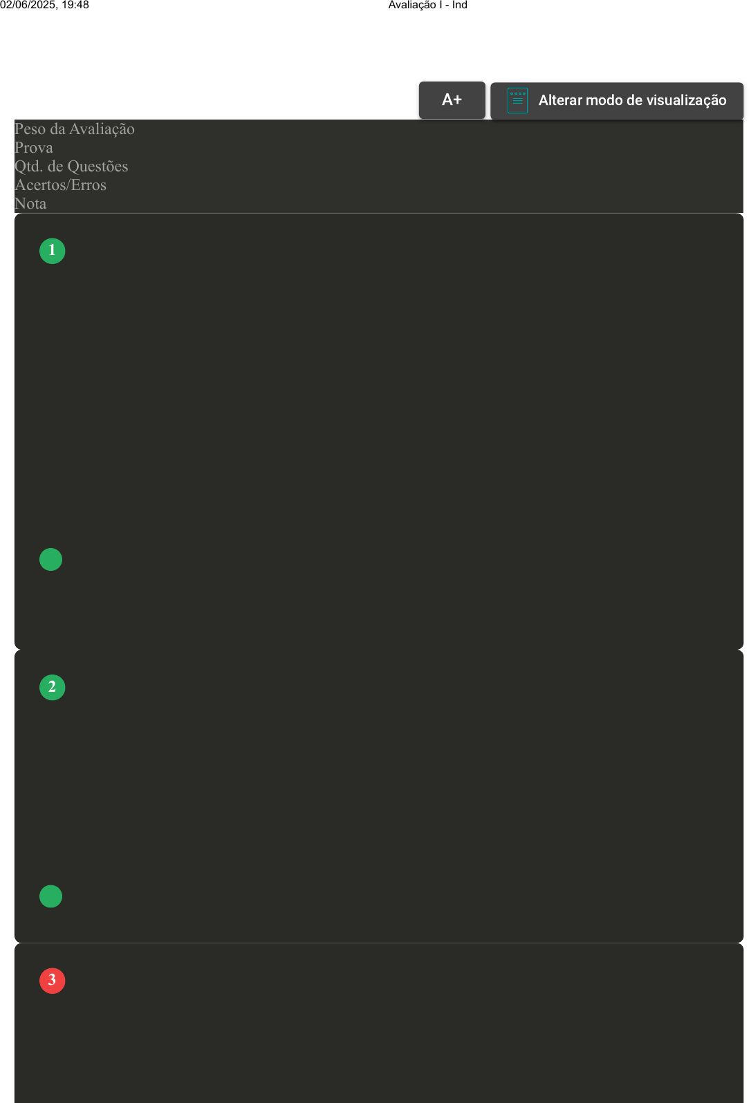 Prova Impressa GABARITO | Avaliação I - Individual (Cod.:828305) Peso da Avaliação 1,50 Prova 66877386 Qtd. de Questões 10 Acertos/Erros 9/1 Nota 9,00 No movimento do pêndulo, nota-se que quando afastado da sua posição de equilíbrio estável e liberado, este se movimenta ao redor da posição de equilíbrio. Sobre o pêndulo simples, classifique V para as sentenças verdadeiras e F para as falsas: ( ) O modelo do pêndulo simples funciona apenas para pequenas oscilações. ( ) O pêndulo simples é constituído por um fio simples de comprimento L, com uma esfera de massa m em sua extremidade. ( ) O período não depende da massa da esfera. ( ) O movimento é periódico, pois considera qualquer tipo de atrito e resistência do ar. Assinale a alternativa que apresenta a sequência CORRETA: A F - V - V - V. B F - V - F - V. C V - V - V - F. D V - F - F - F. Os instrumentos de medição possuem, na sua maioria, finalidades específicas de medição e utilização. Por exemplo, uma balança analítica tem como função determinar a massa de corpos quaisquer. Sobre o sistema de medição com mostrador analógico, assinale a alternativa CORRETA: A Possui um mostrador com os algarismos da medição já apresentados nele. B O algarismo duvidoso é o último digito da tela. C Os algarismos do mostrador constituem o resultado da medição e, portanto, são todos algarismos significativos. D É aquele que possui uma escala que será lida pelo operador do experimento. Os instrumentos de medida possuem uma certa capacidade de medição, ou seja, dependendo da divisão da escala adotada nesse equipamento há uma maior ou menor capacidade de medida, sendo que essa propriedade determina os desvios com relação a uma média de medição de amostras. Sobre a amostra de um experimento, assinale a alternativa CORRETA: A A amostra é definida como o erro produzido pela leitura do valor de medição no mostrador do sistema de medição. VOLTAR A+ Alterar modo de visualização 1 2 3 02/06/2025, 19:48 Avaliação I - Individual about:blank 1/5 B A amostra está relacionada ao quanto o valor de uma medida se encontra longe do valor real. C A amostra é uma pequena quantidade de dados que deve representar a população. D A amostra é definida como a soma de todas as medições realizadas divididas pelo número de medições. Foram realizadas 6 medidas da resistência à flexão em três pontos em um corpo de prova. Os resultados obtidos foram (em MPa): 20, 23, 19, 22, 21, 24. Sobre a resistência média e o desvio padrão, classifique V para as sentenças verdadeiras e F para as falsas: ( ) 22 ± 1,9 MPa. ( ) 21,5 ± 1,87 MPa. ( ) 22,7 ± 1,52 MPa. ( ) 23 ± 2 MPa. Assinale a alternativa que apresenta a sequência CORRETA: A V - V - F - F. B V - F - F - F. C F - F - V - V. D F - V - F - V. Quando um sistema é levemente afastado da situação de equilíbrio estável, passa a executar um movimento periódico ou oscilatório em torno da posição de equilíbrio. Assim, qualquer corpo rígido capaz de oscilar verticalmente ao redor de um eixo perpendicular ao seu plano de movimento é denominado pêndulo físico. Sobre o pêndulo físico, classifique V para as sentenças verdadeiras e F para as falsas: ( ) O período de oscilação de um pêndulo físico pode ser calculado pela seguinte Tf= 2pi (I/mgh)^1/2. ( ) O pêndulo físico é um objeto extenso posto para oscilar em torno de um ponto P, por onde passa o eixo de suspensão. ( ) O pêndulo físico é aquele cujas propriedades mais se assemelham aos pêndulos que vemos no cotidiano. ( ) O centro de gravidade G é o ponto que determina o comprimento do pêndulo simples. Assinale a alternativa que apresenta a sequência CORRETA: A F - V - V - V. B V - V - F - V. C V - F - V - V. Revisar Conteúdo do Livro 4 5 02/06/2025, 19:48 Avaliação I - Individual about:blank 2/5 D V - V - V - F. Nenhuma medida de qualquer grandeza física é exata. A acurácia e a precisão de um certo dado medido estarão sempre limitadas tanto pela sofisticação do equipamento utilizado quanto pela habilidade do operador que realiza a medida. Sendo assim, usam-se os termos erro ou desvio para expressar a variação do dado medido em relação a um valor de referência. Sobre a classificação dos erros experimentais, analise as sentenças a seguir: I- Os erros de escala são produzidos pela leitura do valor de medição no mostrador do sistema de medição. II- Os erros sistemáticos são fruto de perturbações imprevisíveis durante a medição. Seu valor oscila em cada medição. III- Os erros aleatórios estão associados aos erros constantes incluídos em todas as medições realizadas por um mesmo aparelho. IV- Os erros comuns são flutuações positivas e negativas que produzem cerca de metade das medidas com valores mais baixos e metade mais altos. Assinale a alternativa CORRETA: A Somente a sentença I está correta. B As sentenças I e IV estão corretas. C As sentenças I e III estão corretas. D As sentenças I, II e III estão corretas. No âmbito da Metrologia Legal, os instrumentos de medição são utilizados no comércio, nas áreas de saúde, segurança e meio ambiente e na definição ou aplicação de penalidades (efeito fiscal). A leitura dos instrumentos de medição é essencial para o entendimento dos procedimentos experimentais. Sobre o exposto, classifique V para as sentenças verdadeiras e F para as falsas: ( ) Todos os algorismos apresentados com resultados de uma medição têm o mesmo grau de importância. ( ) Equipamentos com mostrador digital não possui algorismo duvidoso. ( ) O algarismo duvidoso em equipamentos com mostrador analógico é definido a partir da menor divisão da escala do instrumento. ( ) Nos instrumentos analógicos, há preferência em se fazer as leituras do instrumento no primeiro 1/3 da escala. ( ) São necessários cuidados tanto para com os equipamentos analógicos quanto para os equipamentos digitais, quando da leitura d