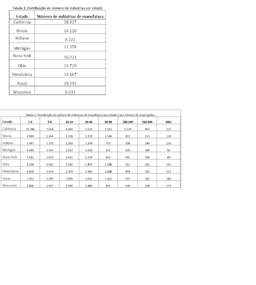 Caro(a) Aluno(a), Chegamos à Avaliação denominada Atividade Contextualizada! Espero que você aproveite cada informação disponibilizada em nosso material didático e não esqueça de que o seu Tutor também pode auxiliar você na avaliação, caso tenha dúvida, procure-o no Fale com o Tutor. Lembre-se: sua opinião precisa ser baseada e justificada, respaldando cientificamente seu conhecimento e pensamento, pois não serão aceitos trechos e/ou postagens sem as devidas referências. Então vamos lá? O número de empregados nas empresas pode variar. Uma empresa pode ter qualquer quantidade, desde um único empregado até mais de 1.000. Os dados mostrados nas tabelas 1 e 2 são os números de indústrias de manufatura, de diversos estados, em um ano recente. (Fonte: U.S. Census Bureau.). Com base nos dados, responda: 1. Qual estado tem o maior número de empregados na indústria? Explique seu raciocínio. 2. Estime o número médio de empregados em uma indústria da manufatura para cada estado. Use 1.000 como o ponto médio para “500+”. 3. Qual estado tem o maior número de empregados por indústria de manufatura? Explique seu raciocínio. 4. Estime o desvio padrão para o número de empregados em uma indústria de manufatura para cada estado. Use 1.000 como o ponto médio para “500+”. 5. Qual estado tem o maior desvio padrão? Explique seu raciocínio. 6. Descreva a distribuição do número de empregados em indústrias de manufatura para cada estado. Após realizar suas reflexões, elabore um pequeno texto, contendo o máximo de 20 a 30 linhas, expondo sua argumentação, acerca do solicitado. image1.png image2.png