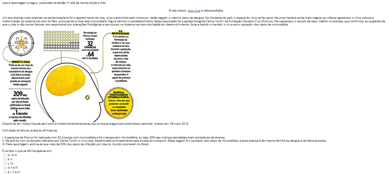 Leia a reportagem a seguir, publicada na edição n° 428 da revista Saúde é elo entre zika virus e microcefalla Um dos dramas mais recentes na saúde brasileira foi aparecimento do zika, virus transmitido pelo mosquito Aedes mesmo vetor da dengue. No Nordeste do ataque do virus se fez sentir de uma maneira ainda mais trágica: ao infectar vírus induzia a malformação do sistema nervoso do feto, provocando a chamada microcefalia. Figura central no estabelecimento dessa associação foi a epidemiologista Celina Turchi, da Fundação Oswaldo Cruz (Fiocruz). Ela capitaneou estudo de inédito no planeta, que confirmou as suspeitas de que e não outros fatores, era responsável por alterações e estruturais no sistema nervoso dos bebês em Estava batido martelo: virus era causador dos casos de EA No estude da MICROCEFALIA? foram E um defeito na formação do 32 cérebro da caixa CRIANÇAS craniana do feto com microcefalla durante gestação, .64 que traz sérias repercussões sem condição. durante vida QUEM ZIKA? da criança. Trata-se de um virus da A infecção por zika, mesma dos especialmente no causadores da dengue primeiro trimestre da febre da disseminado pela de provocar picada do mosquito Aedes 209 MIL casos de infecção por zika foram Outras infecções que notificados no poderiam confundir Estima-se em mais resultados foram analisadas de MILHÃO descartadas de afetados pelo Disponível em: 08 maio 2018. Com base na leitura, avalie as A pesquisa da Fiocruz foi realizada com 32 crianças com microcefalia e 64 crianças sem microcefalia, ou 50% das crianças estudadas eram portadoras da doença. II. De acordo com os estudos liderados por Celina Turchi, virus zika, disseminado principalmente pela picada do mosquito Aedes é causador dos casos de e essa doença é da mesma família da dengue e da febre amarela. III. Pela estima-se que mais de 20% dos casos de infecção por zika no mundo ocorreram no Brasil correto que se afirma apenas em: III. III.