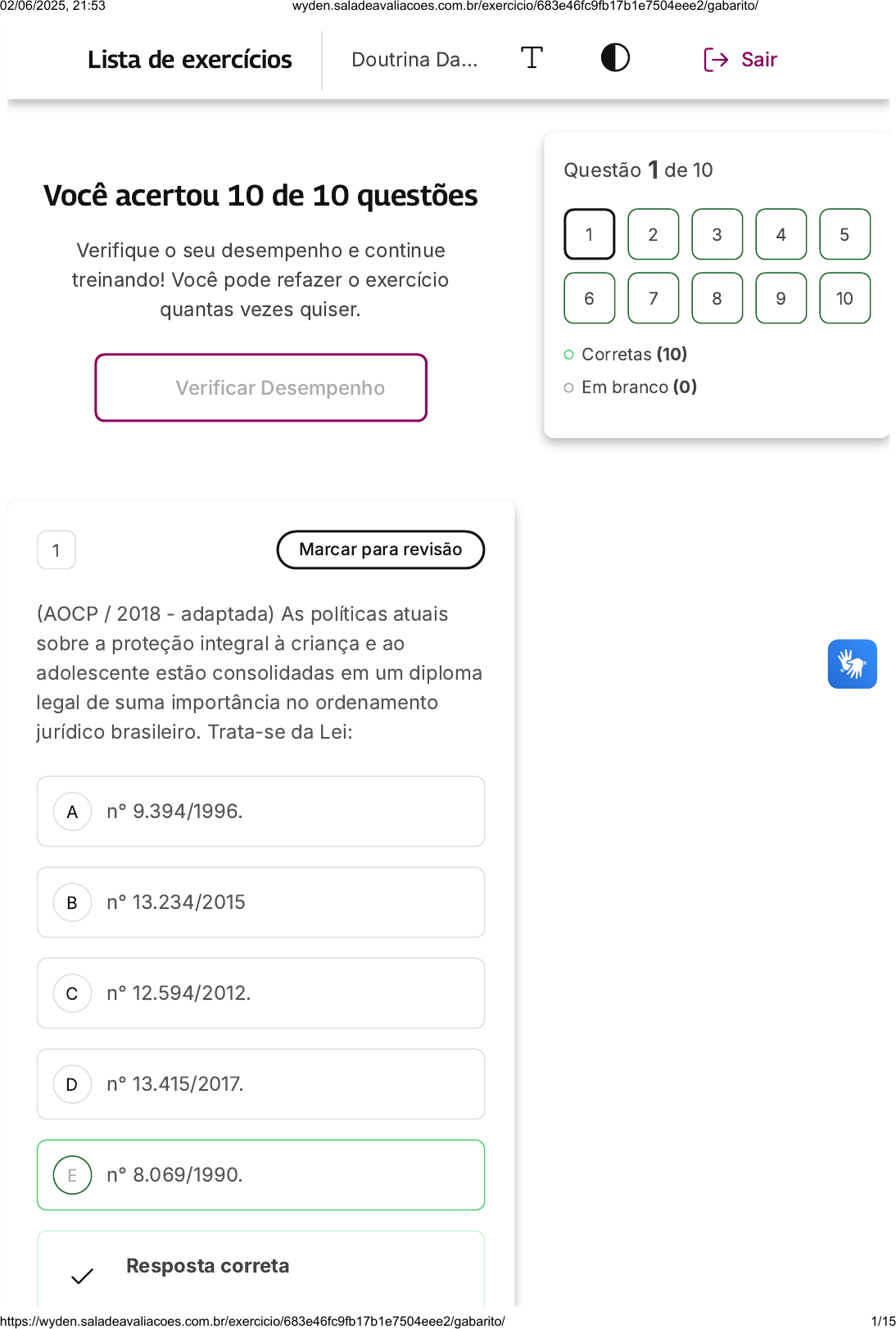 Você acertou 10 de 10 questões Verifique o seu desempenho e continue treinando! Você pode refazer o exercício quantas vezes quiser. Verificar Desempenho A B C D E 1 Marcar para revisão (AOCP / 2018 - adaptada) As políticas atuais sobre a proteção integral à criança e ao adolescente estão consolidadas em um diploma legal de suma importância no ordenamento jurídico brasileiro. Trata-se da Lei: n° 9.394/1996. n° 13.234/2015 n° 12.594/2012. n° 13.415/2017. n° 8.069/1990. Resposta correta Questão 1 de 10 Corretas (10) Em branco (0) 1 2 3 4 5 6 7 8 9 10 Lista de exercícios Doutrina Da… Sair 02/06/2025, 21:53 wyden.saladeavaliacoes.com.br/exercicio/683e46fc9fb17b1e7504eee2/gabarito/ https://wyden.saladeavaliacoes.com.br/exercicio/683e46fc9fb17b1e7504eee2/gabarito/ 1/15 Parabéns, você selecionou a alternativa correta. Confira o gabarito comentado! Gabarito Comentado A alternativa correta é a letra E, que se refere à Lei n° 8.069/1990. Esta lei é de extrema importância no contexto jurídico brasileiro, pois estabelece as diretrizes para a proteção integral de crianças e adolescentes. Ela é conhecida como Estatuto da Criança e do Adolescente (ECA), um marco legal que assegura os direitos fundamentais de crianças e adolescentes no Brasil, garantindo a eles proteção integral e prioridade absoluta, conforme preconizado na Constituição Federal de 1988. 2 Marcar para revisão (Avança SP / 2021 - adaptada) O direito à liberdade consagrado na Constituição Federal também tem sua previsão no Estatuto da Criança e do Adolescente. No que se refere ao tema previsto no Estatuto da Criança e do Adolescente, analise os itens a seguir e, ao final, assinale a alternativa que apresenta corretamente os aspectos abrangidos pelo direito à liberdade. I - Opinião e expressão. II - Brincar, praticar esportes e trabalhar. III - Participar da vida política, na forma da lei. 02/06/2025, 21:53 wyden.saladeavaliacoes.com.br/exercicio/683e46fc9fb17b1e7504eee2/gabarito/ https://wyden.saladeavaliacoes.com.br/exercicio/683e46fc9fb17b1e7504eee2/gabarito/ 2/15 A B C D E Apenas o item I é verdadeiro. Apenas o item II é verdadeiro. Apenas o item III é verdadeiro. Apenas os itens I e III são verdadeiros. Apenas o item II e III são verdadeiros. Resposta correta Parabéns, você selecionou a alternativa correta. Confira o gabarito comentado! Gabarito Comentado Os itens I e III estão corretos, conforme o artigo 16 do Estatuto da Criança e do Adolescente (ECA). Este artigo estabelece que o direito à liberdade inclui os seguintes aspectos: I - ir, vir e estar nos logradouros públicos e espaços comunitários, ressalvadas as restrições legais; II - opinião e expressão; III - crença e culto religioso; IV - brincar, praticar esportes e divertir-se; V - participar da vida familiar e comunitária, sem discriminação; VI - participar da vida política, na forma da lei; VII - buscar refúgio, auxílio e orientação. Portanto, o item II está incorreto, pois o ECA não inclui o trabalho como um aspecto do direito à liberdade para crianças e adolescentes. 02/06/2025, 21:53 wyden.saladeavaliacoes.com.br/exercicio/683e46fc9fb17b1e7504eee2/gabarito/ https://wyden.saladeavaliacoes.com.br/exercicio/683e46fc9fb17b1e7504eee2/gabarito/ 3/15 A B C D E 3 Marcar para revisão (Objetiva / 2021 - adaptada) O Estatuto da Criança e do Adolescente dispõe sobre a proteção integral da criança e do adolescente. Sobre o diploma legal, assinale a alternativa que preenche as lacunas abaixo CORRETAMENTE. Para os efeitos da Lei nº 8.069/1990 - ECA, considera-se adolescente a pessoa entre _______________ e _______________ anos de idade. onze | dezenove onze | dezoito doze | dezoito doze | dezenove treze | dezenove Resposta correta Parabéns, você selecionou a alternativa correta. Confira o gabarito comentado! Gabarito Comentado Gabarito: doze | dezoito Justificativa: a questão trata do teor do artigo 2º do ECA: considera-se criança, para os efeitos desta Lei, a pessoa até doze anos de idade incompletos, e 02/06/2025, 21:53 wyden.saladeavaliacoes.com.br/exercicio/683e46fc9fb17b1e7504eee2/gabarito/ https://wyden.saladeavaliacoes.com.br/exercicio/683e46fc9fb17b1e7504eee2/gabarito/ 4/15 A B C D E adolescente aquela entre doze e dezoito anos de idade. 4 Marcar para revisão (VUNESP / 2021 - adaptada) A Lei 8.069/90 prevê direitos fundamentais voltados à crianças e adolescentes. Assinale quais se relacionam mais diretamente à importância do papel do núcleo familiar na formação e criação dos filhos menores. Princípio da responsabilidade parental e da prevalência da família. Princípio da prevalência da família e princípio da obrigatoriedade da informação. Princípio da obrigatoriedade da informação e princípio da responsabilidade parental. Princípio do interesse superior da criança e do adolescente e princípio da intervenção mínima. Princípio da municipalidade e princípio da proteção integral. Resposta correta Parabéns, você selecionou a alternativa correta. Confira o gabarito comentado! 02/06/2025, 21:53 wyden.saladeavaliacoes.com.br/exercicio/683e46fc9fb17b1e7504eee2/gabarito/ https://wyden.saladeavaliacoes.com.br/exercicio/683e46fc9fb17b1e7504eee2/gabarito/ 5/15 Gabarito Comentado Gabarito: Princípio da responsabilidade parental e da prevalência da família. Justificativa: A questão aborda os princípios estabelecidos pela Lei 8.069/90, que são voltados para a proteção integral de crianças e adolescentes. Dentre os princípios apresentados nas alternativas, os que mais se relacionam com a importância do papel do núcleo familiar na formação e criação dos filhos menores são o princípio da responsabilidade parental e o princípio da prevalência da família. O princípio da responsabilidade parental enfatiza a responsabilidade dos pais ou responsáveis na criação e educação dos filhos, enquanto o princípio da prevalência da família destaca a impor