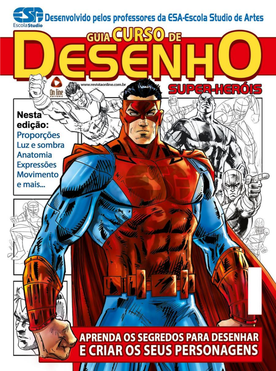 CIP-BRASIL. CATALOGAÇÃO-NA-FONTE SINDICATO NACIONAL DOS EDITORES DE LIVROS, RJ G971 Guia curso de desenho super-heróis / [João Costa]. - São Paulo : OnLine, 2015. il. ISBN 978-85-432-0216-7 1. Desenho - Estudo e ensino. 2. Desenho - Técnica. I. Costa, João. 15-22249 CDD: 741.2 CDU: 741.02 29/04/2015 06/05/2015 PRESIDENTE: Paulo Roberto Houch • VICE-PRESIDENTE EDITORIAL: Andrea Calmon (redacao@editoraonline.com.br) • JORNALISTA RESPONSÁVEL: Andrea Calmon (MTB 47714) • EDITORA: Priscilla Sipans • REDATORA: Paloma Ayala • COORDENADOR DE ARTE: Renato Marcel (diagramacao@editoraonline.com.br) • SUPERVISOR DE MARKETING: Marcelo Rodrigues • ASSISTENTE DE MARKETING: Nathalia Lima • CANAIS ALTERNATIVOS: Luiz Carlos Sarra • DEP. VENDAS: (11) 3687-0099 (vendaatacado@editoraonline.com.br) • DIRETORA ADMINISTRATIVA: Jacy Regina Dalle Lucca • ASSINATURAS: assinatura@editoraonline.com. br • COLABORARAM NESTA EDIÇÃO: PRODUÇÃO: Esa Studio de Artes • DIRETOR EDITORIAL: João Costa • DIRETOR DE ARTE: Fausto Lopes COLABORARAM NESTA EDIÇÃO: TEXTOS: Fabiano Moura • ILUSTRAÇÕES: Bruno Paiva e Henrique Lima DIAGRAMAÇÃO: Fabiano Moura Impresso por LOG&PRINT S.A. • Distribuição no Brasil por DINAP • GUIA CURSO DE DESENHO - SUPER-HERÓIS é uma publicação do IBC Instituto Brasileiro de Cultura Ltda. – Caixa Postal 61085 – CEP 05001-970 – São Paulo – SP – Tel.: (0**11) 3393-7777 • A reprodução total ou parcial desta obra é proibida sem a prévia autorização do editor. Números atrasados com o IBC ou por intermédio do seu jornaleiro ao preço da última edição acrescido das despesas de envio. Para adquirir com o IBC: www. revistaonline.com.br; Tel.: (0**11) 3512-9477; ou Caixa Postal 61085 – CEP 05001-970 – São Paulo – SP. Índice Boca -------------------------------------------------- 16 Frontal ------------------------------------------------ 16 3/4 ----------------------------------------------------- 17 Perfil -------------------------------------------------- 17 Exemplos bocas ------------------------------------- 17 Nariz -------------------------------------------------- 18 Frontal ------------------------------------------------ 18 3/4 ----------------------------------------------------- 19 Perfil -------------------------------------------------- 19 Exemplos Narizes------------------------------------ 19 Orelhas ----------------------------------------------- 20 Frontal ------------------------------------------------ 20 3/4 ----------------------------------------------------- 21 Perfil -------------------------------------------------- 21 Exemplos orelhas ------------------------------------ 21 Cabelos ----------------------------------------------- 22 Cabelos Compridos --------------------------------- 23 Exemplos cabelos ----------------------------------- 23 Rosto frontal ----------------------------------------- 24 Rosto 3/4 --------------------------------------------- 26 Rosto Perfil ------------------------------------------- 28 Crânio ------------------------------------------------- 30 Músculos --------------------------------------------- 31 Esfolado ---------------------------------------------- 32 Planos Faciais ---------------------------------------- 34 Ângulos da cabeça ---------------------------------- 36 A origem dos super-heróis --------- 8 O Surgimento ---------------------------------------- 8 Explosão de Criatividade --------------------------- 9 Materiais de desenho Os papéis -------------------------------------------- 10 Lápis e lapiseiras ------------------------------------ 10 Borrachas -------------------------------------------- 11 Pincéis ------------------------------------------------ 11 Tinta nanquim ---------------------------------------- 11 Caneta-borracha ------------------------------------- 11 Bico de pena ----------------------------------------- 11 Curva francesa, ------------------------------------- 11 gabaritos e régua ----------------------------------- 11 Canetas descartáveis ------------------------------- 11 Utilizando o lápis ------------------------------------ 12 Exercícios -------------------------------------------- 12 Anatomia - Cabeça ------------------ 13 Elementos ------------------------------------------- 13 e Rosto ----------------------------------------------- 13 Olhos -------------------------------------------------- 14 Frontal ------------------------------------------------ 14 3/4 ----------------------------------------------------- 15 Perfil -------------------------------------------------- 15 Exemplos de olhos variados ------------------------ 15 Luz e sombra ----------------------------------------- 38 Origem da Luz --------------------------------------- 38 Sombreando o rosto --------------------------------- 40 Exemplos --------------------------------------------- 40 Perspactiva da cabeça ------------------------------ 42 Expressões ------------------------------------------- 43 Olhos -------------------------------------------------- 43 Exemplos de expressões --------------------------- 43 Bocas ------------------------------------------------- 43 Anatomia - Proporções do corpo 45 Corpo frontal ----------------------------------------- 46 Corpo 3/4 --------------------------------------------- 48 Corpo perfil ------------------------------------------- 50 Corpo Aramado -------------------------------------- 52 Movimentos ------------------------------------------ 52 Como Movimentar ----------------------------------- 53 Aramado - Preenchimento -------------------------- 54 Torso ossos ------------------------------------------ 56 Torso músculos -------------------------------------- 57 Exemplos de torsos definidos ---------------------- 57 Mãos -------------------------------------------------- 58 Vista Palmar ------------------------------------------ 58 Vista Lateral ------------------------------------------ 58 Estrutura ós