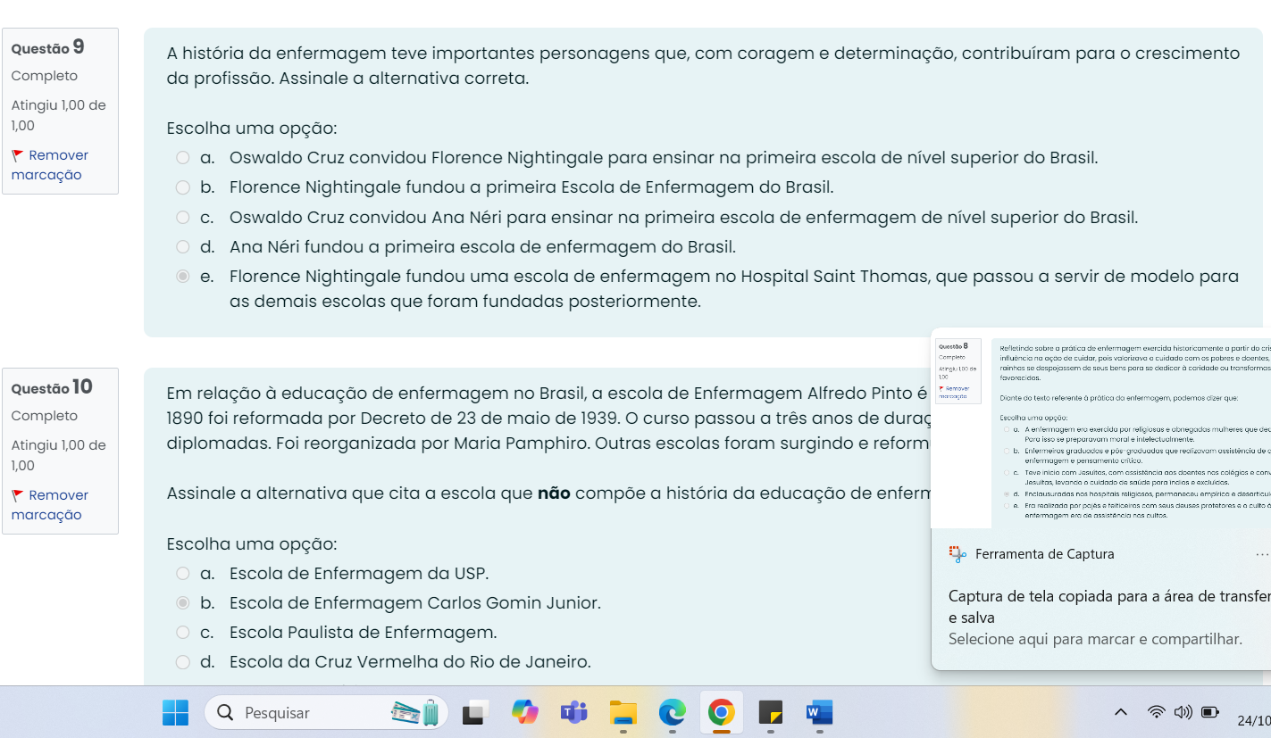 Questão 9 A história da enfermagem teve importantes personagens que, com coragem e determinação, contribuíram para crescimento Completo da profissão. Assinale a alternativa correta. Atingiu 1,00 de 1,00 Escolha uma opção: Remover a. Oswaldo Cruz convidou Florence Nightingale para ensinar na primeira escola de nível superior do Brasil. marcação b. Florence Nightingale fundou a primeira Escola de Enfermagem do Brasil. C. Oswaldo Cruz convidou Ana Néri para ensinar na primeira escola de enfermagem de nível superior do Brasil. d. Ana Néri fundou a primeira escola de enfermagem do Brasil. e. Florence Nightingale fundou uma escola de enfermagem no Hospital Saint Thomas, que passou a servir de modelo para as demais escolas que foram fundadas posteriormente. 8 sobre de enfermagem exercido historicamente partir cri no de cuidor pois a cuidado com pobres doentes de despojassem de dedicar transformas 100 Questão 10 Remove Em relação à educação de enfermagem no Brasil, a escola de Enfermagem Alfredo Pinto é texto referente do podemos dizer que Completo 1890 foi reformada por Decreto de 23 de maio de 1939. curso passou a três anos de A ero exercido por e mulheres que Atingiu 1,00 de diplomadas. Foi reorganizada por Maria Pamphiro. Outras escolas foram surgindo e reform isso b. que assistência de e pensamento 1,00 com doentes colégios e de Remover a alternativa que cita a escola que não compõe a história da educação de enferm nos hospitals e por com marcação de nos cultos Escolha uma opção: Ferramenta de Captura a. Escola de Enfermagem da USP. b. Escola de Enfermagem Carlos Gomin Junior. Captura de tela copiada para a área de transfer e salva C. Escola Paulista de Enfermagem. Selecione aqui para marcar e compartilhar. d. Escola da Cruz Vermelha do Rio de Pesquisar W 24/10