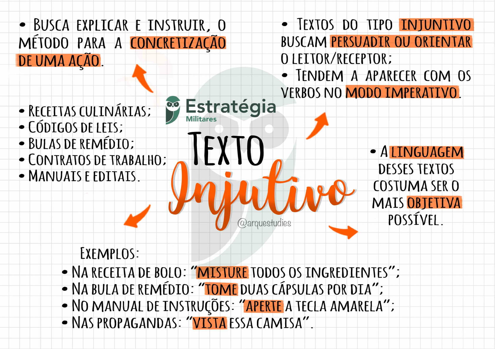 BUSCA EXPLICAR E INSTRUIR, 0 TEXTOS DO TIPO INJUNTIVO MÉTODO PARA A BUSCAM PERSUADIR OU ORIENTAR DE UMA AÇÃO. 0 TENDEM A APARECER COM VERBOS NO MODO IMPERATIVO. RECEITAS Estratégia Militares CÓDIGOS DE LEIS; BULAS DE CONTRATOS DE TRABALHO; TEXTO A LINGUAGEM MANUAIS E EDITAIS. DESSES TEXTOS Injutivo COSTUMA SER 0 MAIS OBJETIVA @arquestudies EXEMPLOS: NA RECEITA DE BOLO: "MISTURE TODOS INGREDIENTES"; NA BULA DE REMÉDIO: "TOME DUAS CÁPSULAS POR DIA"; NO MANUAL DE INSTRUÇÕES: "APERTE A TECLA AMARELA"; NAS PROP AGANDAS: "VISTA ESSA CAMISA".