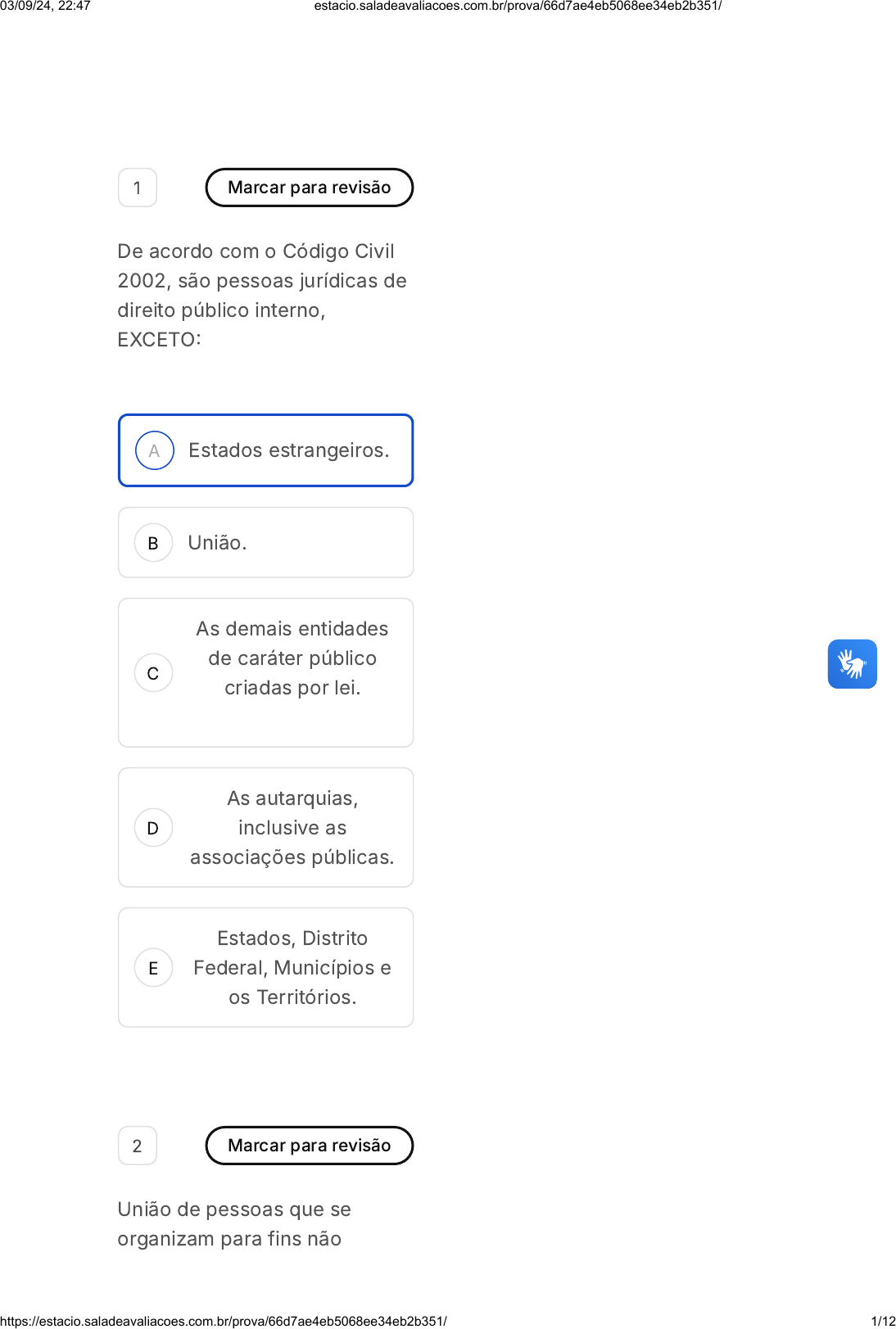 A B C D E 1 Marcar para revisão De acordo com o Código Civil 2002, são pessoas jurídicas de direito público interno, EXCETO� Estados estrangeiros. União. As demais entidades de caráter público criadas por lei. As autarquias, inclusive as associações públicas. Estados, Distrito Federal, Municípios e os Territórios. 2 Marcar para revisão União de pessoas que se organizam para fins não 03/09/24, 22:47 estacio.saladeavaliacoes.com.br/prova/66d7ae4eb5068ee34eb2b351/ https://estacio.saladeavaliacoes.com.br/prova/66d7ae4eb5068ee34eb2b351/ 1/12 A B C D E A B econômicos é conceito que se aplica às: Associações. Fundações. Sociedades empresariais. Sociedades anônimas. Sociedades simples. 3 Marcar para revisão A respeito das pessoas jurídicas no Direito Civil, é correto afirmar que: É inaplicável às pessoas jurídicas a proteção dos direitos da personalidade. O Código Civil não contém previsão acerca da desconsideração inversa da personalidade jurídica. 03/09/24, 22:47 estacio.saladeavaliacoes.com.br/prova/66d7ae4eb5068ee34eb2b351/ https://estacio.saladeavaliacoes.com.br/prova/66d7ae4eb5068ee34eb2b351/ 2/12 C D E A cassação da autorização para funcionamento da pessoa jurídica implica a sua extinção imediata. Constitui desvio de finalidade, para efeito de desconsideração da personalidade jurídica, a expansão ou a alteração da finalidade original da atividade econômica específica da pessoa jurídica. Se a administração da pessoa jurídica vier a faltar, o juiz, a requerimento de qualquer interessado, nomear-lhe-á administrador provisório. 4 Marcar para revisão Acerca do uso do nome ou da imagem da pessoa por terceiros, é CORRETO afirmar: 00 hora : 17 min : 00 seg Ocultar Questão 5 de 10 Respondidas �5� Em branco �5� Finalizar prova 1 2 3 4 5 6 7 8 9 10 SM1 Direito Civil - Parte Geral 03/09/24, 22:47 estacio.saladeavaliacoes.com.br/prova/66d7ae4eb5068ee34eb2b351/ https://estacio.saladeavaliacoes.com.br/prova/66d7ae4eb5068ee34eb2b351/ 3/12 A B C D E O pseudônimo não goza de proteção no âmbito dos direitos de personalidade. O nome da pessoa não pode ser empregado por outrem em publicações ou representações que a exponham ao desprezo público, se houver intenção difamatória. A pessoa jurídica não tem proteção jurídica quanto ao seu nome. Sem autorização, não se pode usar o nome alheio em propaganda comercial. A possibilidade de proteção ao nome e à imagem se extingue com a morte de seu titular. 5 Marcar para revisão A constitucionalização do direito civil promoveu, em realidade, uma transformação 03/09/24, 22:47 estacio.saladeavaliacoes.com.br/prova/66d7ae4eb5068ee34eb2b351/ https://estacio.saladeavaliacoes.com.br/prova/66d7ae4eb5068ee34eb2b351/ 4/12 A B C da hermenêutica jurídica. Acerca do tema, analise as proposições abaixo e a relação entre elas. I. A autonomia privada guarda relação com o direito de cada indivíduo de gerir sua própria vida, conforme suas próprias convicções, em homenagem ao princípio da liberdade. PORQUE II. A autonomia privada compreende a liberdade a partir de uma ótica liberal individual. A respeito dessas asserções, assinale a opção correta. A asserção I é uma proposição falsa, e a II é uma proposição verdadeira. As asserções I e II são proposições verdadeiras, e a II é uma justificativa correta da I. As asserções I e II são proposições falsas. 03/09/24, 22:47 estacio.saladeavaliacoes.com.br/prova/66d7ae4eb5068ee34eb2b351/ https://estacio.saladeavaliacoes.com.br/prova/66d7ae4eb5068ee34eb2b351/ 5/12 D E As asserções I e II são proposições verdadeiras, mas a II não é uma justificativa correta da I. A asserção I é uma proposição verdadeira, e a II é uma proposição falsa. 6 Marcar para revisão �UECE�CEV/2018 � Adaptada) O Decreto Presidencial nº 8727, de 28 de abril de 2016, estabelece normas sobre o uso do nome social, bem como o reconhecimento da identidade de gênero de pessoas travestis ou transexuais no âmbito das instituições, órgãos da administração pública federal direta, autarquias e fundações. Esse decreto define como nome social: 03/09/24, 22:47 estacio.saladeavaliacoes.com.br/prova/66d7ae4eb5068ee34eb2b351/ https://estacio.saladeavaliacoes.com.br/prova/66d7ae4eb5068ee34eb2b351/ 6/12 A B C A designação que a pessoa transexual ou travesti indica para si, desde que seja autorizado por ambos os pais. A designação que a pessoa transexual ou travesti, mediante processo judicial, obteve direito de usar, estando tão-somente no aguardo das alterações nos documentos oficiais. O apelido pelo qual a pessoa transexual ou travesti deseja ser chamada e desde que este nome sempre venha associado ao nome que traz em seus documentos oficiais. 03/09/24, 22:47 estacio.saladeavaliacoes.com.br/prova/66d7ae4eb5068ee34eb2b351/ https://estacio.saladeavaliacoes.com.br/prova/66d7ae4eb5068ee34eb2b351/ 7/12 D E O nome com que a pessoa transexual ou travesti se identifica e através do qual é reconhecida socialmente. A designação que a pessoa transexual ou travesti indica para si e com a qual pretende ser reconhecida, desde que já se encontre em curso processo judicial requerendo a alteração de nome. 7 Marcar para revisão Os direitos da personalidade estão previstos entre os arts. 11 e 21 do Código Civil e possuem relação de próxima afinidade com o princípio da dignidade humana. Sobre as características dos direitos da personalidade, assinale a alternativa correta. 03/09/24, 22:47 estacio.saladeavaliacoes.com.br/prova/66d7ae4eb5068ee34eb2b351/ https://estacio.saladeavaliacoes.com.br/prova/66d7ae4eb5068ee34eb2b351/ 8/12 A B C D E Podem ser transmissíveis, desde que não seja a título oneroso. Integram o patrimônio material dos indivíduos. Não são oponíveis erga omnes. Gozam de prescritibilidade, isto é, há hipóteses em que podem ser extintos pelo não uso. Possuem generalidade, na medida em que aplicáv