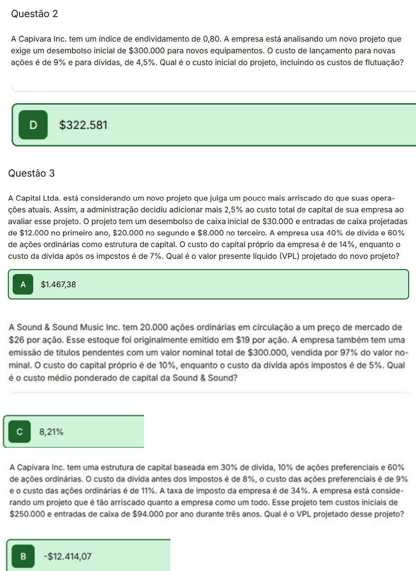 Questão 2 A Capivara Inc. tem um índice de endividamento de 0,80. A empresa está analisando um novo projeto que exige um desembolso inicial de $300.000 para novos equipamentos. o custo de lançamento para novas ações é de 9% e para dívidas, de Qual é o custo inicial do projeto, incluindo os custos de flutuação? D $322.581 Questão 3 A Capital Ltda. está considerando um novo projeto que julga um pouco mais arriscado do que suas opera- ções atuais. Assim, a administração decidiu adicionar mais 2,5% ao custo total de capital de sua empresa ao avaliar esse projeto. o projeto tem um desembolso de caixa inicial de $30.000 e entradas de caixa projetadas de $12.000 no primeiro ano, $20.000 no segundo e $8.000 no terceiro. A empresa usa 40% de dívida e 60% de ações ordinárias como estrutura de capital. custo do capital próprio da empresa é de 14%, enquanto o custo da dívida após os impostos é de 7%. Qual é o valor presente líquido (VPL) projetado do novo projeto? A $1.467,38 A Sound & Sound Music Inc. tem 20.000 ações ordinárias em circulação a um preço de mercado de $26 por ação. Esse estoque foi originalmente emitido em $19 por ação. A empresa também tem uma emissão de títulos pendentes com um valor nominal total de $300.000, vendida por 97% do valor no- minal. custo do capital próprio é de enquanto custo da dívida após impostos é de Qual é custo médio ponderado de capital da Sound & Sound? C 8,21% A Capivara Inc. tem uma estrutura de capital baseada em 30% de 10% de ações preferenciais e 60% de ações custo da antes dos impostos é de 8%, custo das ações preferenciais é de 9% e custo das ações ordinárias é de A taxa de imposto da empresa é de A empresa está conside- rando um projeto que é tão arriscado quanto a empresa como um todo. Esse projeto tem custos iniciais de $250.000 e entradas de caixa de $94.000 por ano durante três anos. Qual é VPL projetado desse projeto? B -$12.414,07Questão 6 Uma empresa tem 10.000.000 de ações em circulação com um preço de mercado atual de $40 por ação. A empresa também tem 400.000 títulos em circulação. Esses títulos têm prazo de quinze anos, pagam juros se- mestralmente, têm rendimento até o vencimento de 7% e taxa de cupom de 6%. A empresa acabou de pagar um dividendo de $3,00 por ação. A taxa de imposto para a empresa é de Qual é o custo médio ponde- rado de capital para essa empresa? A 7,26% Uma empresa tem 10.000.000 de ações em circulação com um preço de mercado atual de $ 40 por ação. A empresa também tem 400.000 títulos em circulação. Esses títulos têm prazo de 15 anos, pagam juros semestralmente, têm rendimento até o vencimento de 7% e taxa de cupom de 6%. A empresa acabou de pagar um dividendo de $ 3,00 por ação. A taxa de imposto para a empresa é de Qual é o custo médio ponderado de capital para esta empresa? A. 7,26% B. 7,28% C. 7,00% D. 7,50% E. 7,14% A 7,26% Teoria na prática A Basket Weavers Company tem 100.000 títulos em circulação que estão sendo vendidos pelo valor nominal. Títulos com características semelhantes estão rendendo 7,5%. A empresa também tem em circulação 1 mi- de ações preferenciais a 10,5% e 5 milhões de ações ordinárias a 13,8%. As ações preferenciais são vendidas por $56 por ação. A ação ordinária é vendida por $38 por ação. A letra do Tesouro dos Estados Unidos está rendendo 3%, e o retorno no mercado é de 12%. A alíquota do imposto corporativo é de 34%. Qual é o custo médio ponderado de capital da Basket Weaver? Débito = 000 1.000 = 100m Preferencial = = 56m Ordinária = = 190m Total = 100 + 56 + 190 = 346m 100 190 56 WACC + 0,138 + 0,105 = 0,1057 = 10,57% 346 346 346 capital próprioA Highpark Industrial tem uma emissão de títulos de $500.000 pendentes que está sendo vendida a 96% do valor de face. A Highpark também possui 6.500 ações preferenciais e 22.000 ações ordinárias em circulação. A ação preferencial tem um preço de mercado de $50 por ação comparado ao preço de $35 por ação das ações ordinárias. Qual é o peso das ações preferenciais em relação ao custo médio ponderado de capital da empresa? D 21% A Antonio's Pizzaria tem 8% de ações preferenciais em circulação que são vendidas por US$71 por Esse estoque foi originalmente emitido em $58 por ação. Qual é custo das ações preferenciais da pizzaria? C 11,27% Qual das opções a seguir aumentará o custo médio ponderado de capital se a empresa tiver um custo de capital próprio de 13%, um custo de preferência de 11% e um custo de dívida após impostos de 6%? D Aumentar risco da empresa. Fernando Constantia, engenheiro da Brandy River Vineyards, tem um orçamento de US$100.000 para melhorias na Ele identificou quatro investimentos mutuamente exclusivos, todos com duração de cinco anos, que possuem os fluxos de caixa mostrados na tabela a seguir: Alternativa 0 1 2 3 4 5 A -100.000 25.000 25.000 25.000 25.000 B -100.000 10.000 20.000 40.000 80.000 C -100.000 50.000 50.000 100.000 0 0 D -100.000 0 0 0 0 1.000.000 Tabela: Fluxo de caixa no final de cada ano. Mauro Rezende Filho. Para cada alternativa, engenheiro quer determinar período de retorno e valor presente. Para seu relatório de recomendação, ele ordenará as alternativas da mais preferida para a menos preferida em cada caso. A Brandy River usa uma TMA de 8% para tais decisões. Qual será a sequência correta se considerarmos payback simples para a tomada de decisão?B C, B, A, D. Carlos está pensando em comprar uma casa enquanto estiver na universidade. A casa custa $200.000 hoje. Alugar parte da casa e morar no restante durante seus cinco anos na escola renderá, após as despesas, $2.000 por mês. Ele estima que venderá a casa depois de cinco anos por $210.000. Se a TMR de Carlos for de 6% capitalizado mensalmente, se ele deveria comprar a casa, qual valor presente do negócio? C 329.594,56 Um novo aparelho custa $10.000. A manute