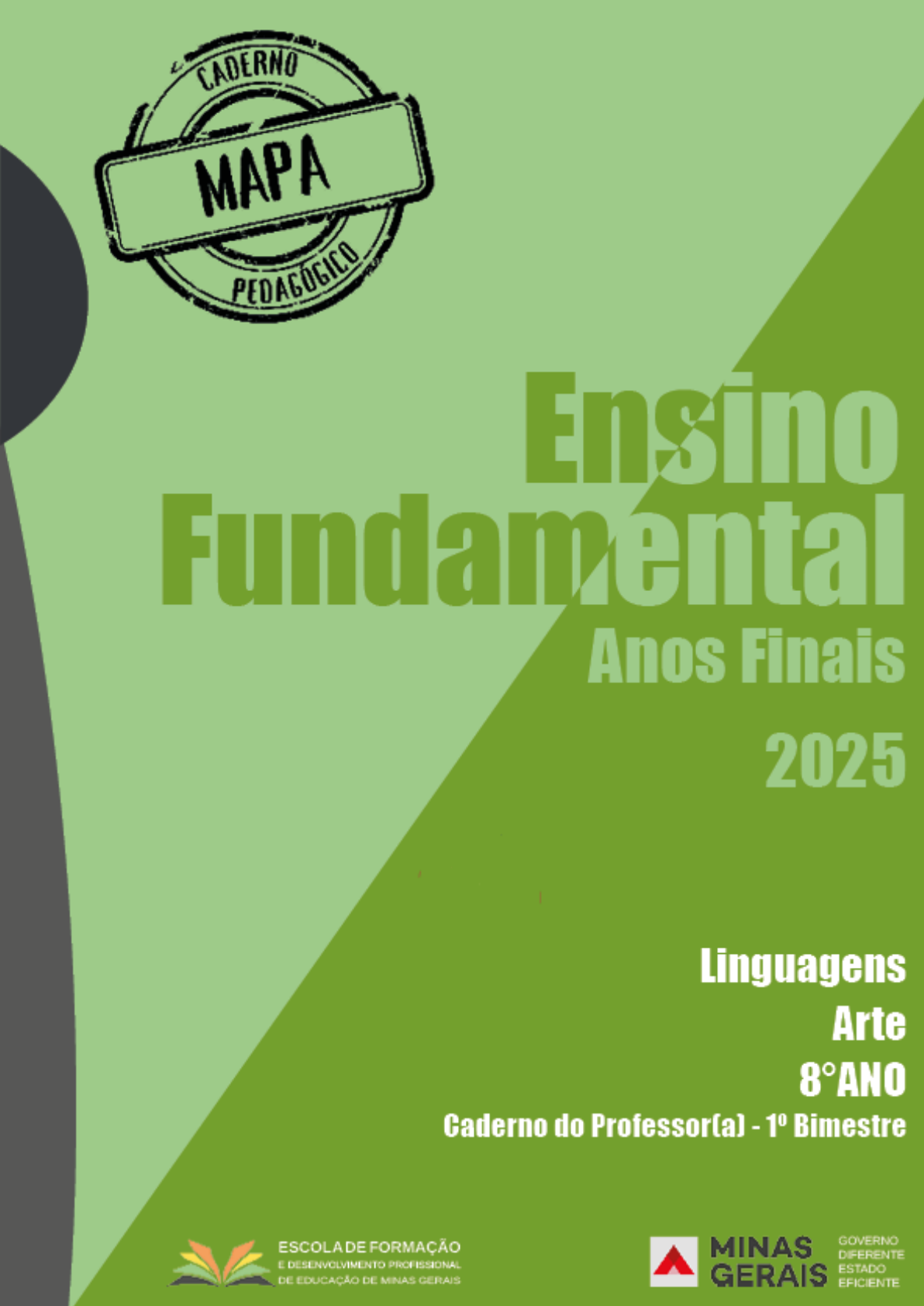1 Governador do Estado de Minas Gerais Romeu Zema Neto Vice-Governador do Estado de Minas Gerais Mateus Simões de Almeida Secretário de Estado de Educação Igor de Alvarenga Oliveira Icassatti Rojas Secretária Adjunta Fernanda de Siqueira Neves Subsecretaria de Desenvolvimento da Educação Básica Kellen Silva Senra Superintendente da Escola de Formação e Desenvolvimento Profissional de Educadores Graziela Santos Trindade Diretor da Coordenadoria de Ensino da EFE Tiago Vieira Lima Produção de Conteúdo Professores Formadores da Escola de Formação e Desenvolvimento Profissional de Educadores Revisão Equipe Pedagógica e Professores Formadores da Escola de Formação e Desenvolvimento Profissional de Educadores Escola de Formação e Desenvolvimento Profissional de Educadores Av. Amazonas, 5855 - Gameleira, Belo Horizonte - MG 2 Prezado(a) Professor(a), No intuito de contribuir com o seu trabalho em sala de aula, preparamos este caderno. Por meio dele, você terá a oportunidade de ampliar o trabalho já previsto em seu planejamento. O presente caderno foi construído tendo por base as competências e habilidades estabelecidas na BNCC, no CRMG e no Plano de Curso 2025 a serem desenvolvidas e trabalhadas por todas as unidades escolares da rede pública de Minas Gerais. Aborda os diversos componentes curriculares e para facilitar a leitura e manuseio foi organizado de forma linear. Contudo, ao implementá-lo em sala de aula, você poderá recorrer aos planejamentos de forma não sequencial, atendendo às necessidades pedagógicas dos estudantes. É preciso atentar-se, apenas, para os conhecimentos que são pré-requisitos, ou seja, aqueles que foram trabalhados nos planejamentos anteriores e que precisam ser retomados com os estudantes para a construção do novo conhecimento em questão. Como o principal objetivo deste material é o trabalho com o desenvolvimento de habilidades, este caderno vem com o propósito de dialogar com sua prática e com o seu planejamento dentro das habilidades básicas - aquelas que devemos assegurar que todos os nossos estudantes aprendam. Destacamos ainda, que o livro didático continua sendo um instrumento eficiente e necessário, principalmente por não anular o papel do professor de mediador insubstituível dentro dos processos de ensino e de aprendizagem. Coracini (1999) nos diz que “o livro didático já se encontra internalizado no professor (...) o professor continua no controle do conteúdo e da forma (...)”, reafirmando que, o que torna o livro didático e o que torna os Cadernos MAPA eficientes, é justamente a maneira como o professor utiliza-os junto aos estudantes. Desejamos a você, professor(a), um bom trabalho! Equipe da Escola de Formação e Desenvolvimento Profissional e de Educadores 3 SUMÁRIO TEMA DA SEQUÊNCIA DIDÁTICA: Brasil: as Artes visuais e o teatro em seus contextos. 6 TEMA DA SEQUÊNCIA DIDÁTICA: Se há música, há dança. 16 4 APRESENTAÇÃO DA SEQUÊNCIA DO(A) PROFESSOR(A) Olá, professor(a), Conhecer as produções de artes visuais e teatrais da cultura brasileira, a partir das produções tradicionais até as contemporâneas, é também uma maneira de se reconhecer como “personagem” atuante na construção histórica e artística do país. As habilidades propostas neste trabalho pressupõe reconhecer as produções visuais e alguns grupos de teatro em diferentes épocas em território brasileiro, envolvendo o conhecimento histórico-cultural, a apreciação e a valorização da diversidade cultural e artística. Além de reconhecer as produções nacionais, fazer paralelos com os movimentos de Artes visuais e teatrais pelo mundo, é relevante na formação artística de cada estudante. Para Cintra (2018), as artes visuais e o teatro constroem ainda outras relações que ainda não fomos capazes de decifrar, entretanto, já é possível perceber que a aproximação entre essas duas vertentes da Arte marcou muitas mudanças na Arte do século XX, trazendo muitos avanços tanto para apreciação como para os estudos das duas linhas. É possível perceber, ainda na atualidade, que a conexão entre os dois gêneros possibilita uma criação visual mais instigante e completa. Para o autor, o teatro visual é um exemplo de tal proposição. Como práticas de estudo, conhecer e relacionar o teatro e as artes visuais contribui no desenvolvimento da visão mais sensível e ampla das produções artísticas ao longo da história. O artigo do professor Caio Cesar Silva Nascimento (2022), usado na construção desse material, enfatiza o valor da Arte, sobretudo do teatro, na formação humana. Em seu texto, Nascimento cita a escritora Ingrid Koudela dizendo: “o teatro, enquanto proposta de educação, trabalha com o potencial que todas as pessoas possuem, transformando esse recurso natural em um processo consciente” (Ingrid Koudela. 2006, p. 78). Assim, a proposta é fazer relações entre as artes visuais e o teatro, buscando explorar ao máximo as potencialidades de tais gêneros para a formação artística dos(as) estudantes. 5 Teatro e Artes visuais Fonte: (Colaboradores, 2024) TEMA DA SEQUÊNCIA DIDÁTICA: Brasil: as Artes visuais e o teatro em seus contextos. TEMPO DE EXECUÇÃO DA SEQUÊNCIA DIDÁTICA: 5 AULAS OBJETOS DE CONHECIMENTO: Contextos e práticas. HABILIDADES: F69AR01P8) Pesquisar, apreciar e analisar formas distintas das artes visuais tradicionais e contemporâneas, em obras de artistas brasileiros de diferentes épocas e em diferentes matrizes estéticas e culturais, de modo a ampliar a experiência com diferentes contextos e práticas artístico-visuais e cultivar a percepção, o imaginário, a capacidade de simbolizar e o repertório imagético. F69AR24P8) Reconhecer e apreciar artistas e grupos de teatro brasileiros (locais e regionais) e estrangeiros de diferentes épocas, investigando os modos de criação e produção em teatro. 6 1ª AULA – TEMA: Brasil: as Artes visuais e o teatro e
