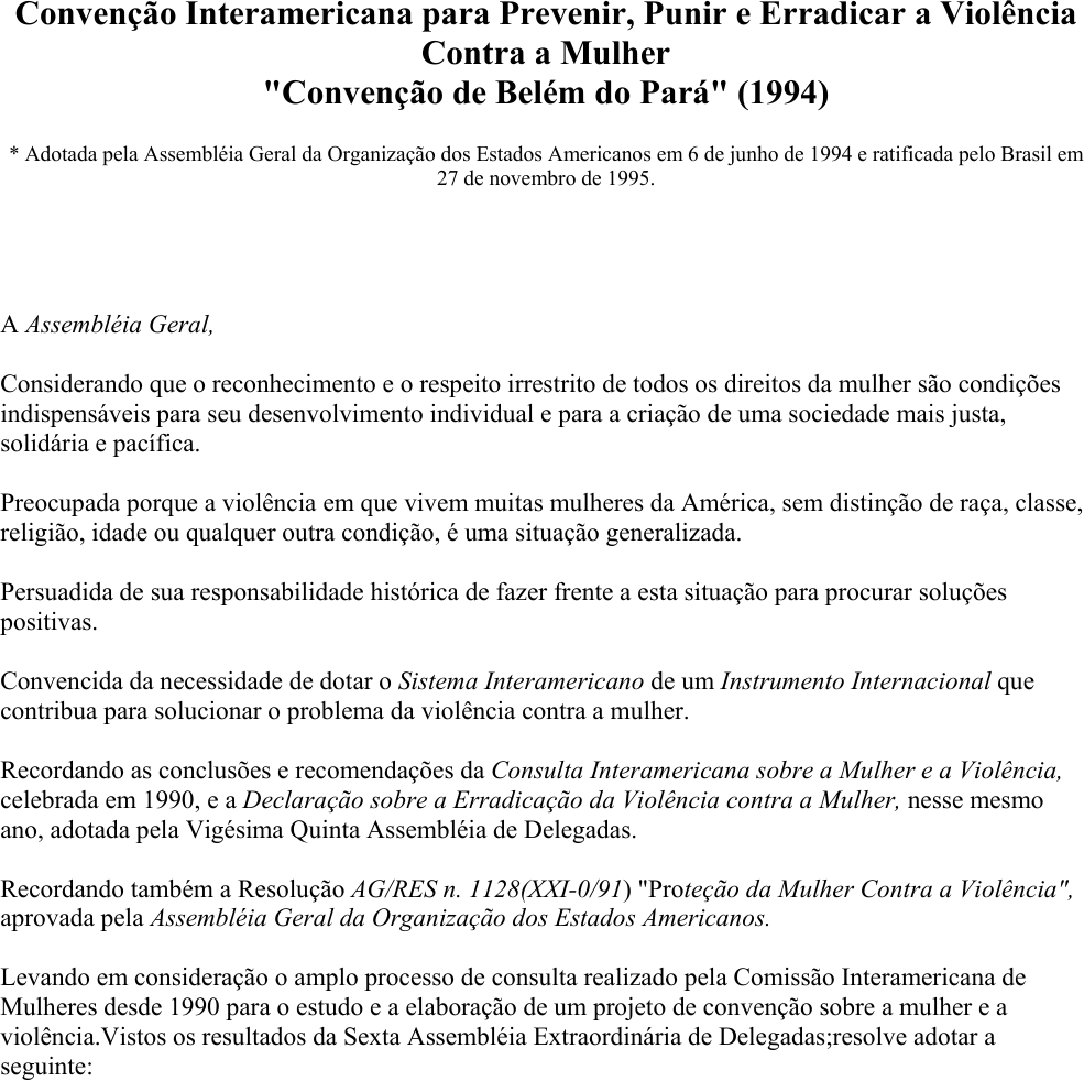 Convenção Interamericana para Prevenir, Punir e Erradicar a Violência Contra a Mulher "Convenção de Belém do Pará" (1994) * Adotada pela Assembléia Geral da Organização dos Estados Americanos em 6 de junho de 1994 e ratificada pelo Brasil em 27 de novembro de 1995. A Assembléia Geral, Considerando que o reconhecimento e o respeito irrestrito de todos os direitos da mulher são condições indispensáveis para seu desenvolvimento individual e para a criação de uma sociedade mais justa, solidária e pacífica. Preocupada porque a violência em que vivem muitas mulheres da América, sem distinção de raça, classe, religião, idade ou qualquer outra condição, é uma situação generalizada. Persuadida de sua responsabilidade histórica de fazer frente a esta situação para procurar soluções positivas. Convencida da necessidade de dotar o Sistema Interamericano de um Instrumento Internacional que contribua para solucionar o problema da violência contra a mulher. Recordando as conclusões e recomendações da Consulta Interamericana sobre a Mulher e a Violência, celebrada em 1990, e a Declaração sobre a Erradicação da Violência contra a Mulher, nesse mesmo ano, adotada pela Vigésima Quinta Assembléia de Delegadas. Recordando também a Resolução AG/RES n. 1128(XXI-0/91) "Proteção da Mulher Contra a Violência", aprovada pela Assembléia Geral da Organização dos Estados Americanos. Levando em consideração o amplo processo de consulta realizado pela Comissão Interamericana de Mulheres desde 1990 para o estudo e a elaboração de um projeto de convenção sobre a mulher e a violência.Vistos os resultados da Sexta Assembléia Extraordinária de Delegadas;resolve adotar a seguinte: Convenção Interamericana para Prevenir, Punir e Erradicar a Violência Contra a Mulher – "Convenção de Belém do Pará" Os Estados Membros da presente Convenção: Reconhecendo que o respeito irrestrito aos Direitos Humanos foi consagrado na Declaração Americana dos Direitos e Deveres do Homem e na Declaração Universal dos Direitos Humanos e reafirmado em outros instrumentos internacionais e regionais. Afirmando que a violência contra a mulher constitui uma violação dos direitos humanos e das liberdades fundamentais e limita total ou parcialmente à mulher o reconhecimento, gozo e exercício de tais direitos e liberdades. Preocupados porque a violência contra a mulher é uma ofensa à dignidade humana e uma manifestação de relações de poder historicamente desiguais entre mulheres e homens. Recordando a Declaração sobre a Erradicação da Violência contra a Mulher, adotada pela Vigésima Quinta Assembléia de Delegadas da Comissão Interamericana de Mulheres, e afirmando que a violência contra a mulher transcende todos os setores da sociedade, independentemente de sua classe, raça ou grupo étnico, níveis de salário, cultura, nível educacional, idade ou religião, e afeta negativamente suas próprias bases. Convencidos de que a eliminação da violência contra a mulher é condição indispensável para seu desenvolvimento individual e social e sua plena igualitária participação em todas as esferas da vida. Convencidos de que a adoção de uma convenção para prevenir, punir e erradicar toda forma de violência contra a mulher, no âmbito da Organização dos Estados Americanos, constitui uma contribuição positiva para proteger os direitos da mulher e eliminar as situações de violência que possam afetá-las. Convieram o seguinte: Capítulo I Definição e âmbito de Aplicação Artigo 1º Para os efeitos desta Convenção deve-se entender por violência contra a mulher qualquer ação ou conduta, baseada no gênero, que cause morte, dano ou sofrimento físico, sexual ou psicológico à mulher, tanto no âmbito público como no privado. Artigo 2º Entender-se-á que violência contra a mulher inclui violência física, sexual e psicológica: §1. Que tenha ocorrido dentro da família ou unidade doméstica ou em qualquer outra relação interpessoal, em que o agressor conviva ou haja convivido no mesmo domicílio que a mulher e que compreende, entre outros, estupro, violação, maus-tratos e abuso sexual: §2. Que tenha ocorrido na comunidade e seja perpetrada por qualquer pessoa e que compreende, entre outros, violação, abuso sexual, tortura, maus tratos de pessoas, tráfico de mulheres, prostituição forçada, seqüestro e assédio sexual no lugar de trabalho, bem como em instituições educacionais, estabelecimentos de saúde ou qualquer outro lugar, e §3. Que seja perpetrada ou tolerada pelo Estado ou seus agentes, onde quer que ocorra. CapítuloII Direitos Protegidos Artigo 3º Toda mulher tem direito a uma vida livre de violência, tanto no âmbito público como no privado. Artigo 4º Toda mulher tem direito ao reconhecimento, gozo, exercícios e proteção de todos os direitos humanos e às liberdades consagradas pelos instrumentos regionais e internacionais sobre Direitos Humanos. Estes direitos compreendem , entre outros: a) O direito a que se respeite sua vida. b) O direito a que se respeite sua integridade física, psíquica e moral. c) O direito à liberdade e à segurança pessoais. d) O direito a não ser submetida a torturas. e) O direito a que se refere a dignidade inerente a sua pessoa e que se proteja sua família. d) O direito à igualdade de proteção perante a lei e da lei; e) O direito a um recurso simples e rápido diante dos tribunais competentes, que a ampare contra atos que violem seus direitos. f) O direito à liberdade de associação. g) O direito à liberdade de professar a religião e as próprias crenças, de acordo com a lei. h) O direito de ter igualdade de acesso às funções públicas de seu país e a participar nos assuntos públicos, incluindo a tomada de decisões. Artigo 5º Toda mulher poderá exercer livre r plenamente seus direitos civis, políticos, econômicos, sociais e culturais e contará com a tota