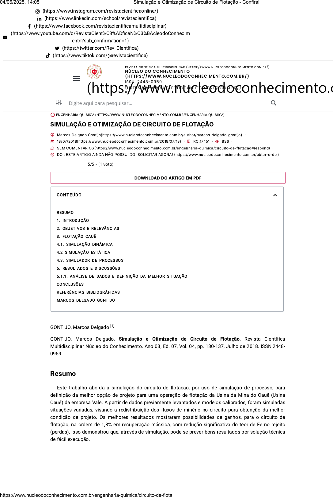 ENGENHARIA QUÍMICA (HTTPS://WWW.NUCLEODOCONHECIMENTO.COM.BR/ENGENHARIA-QUIMICA) SIMULAÇÃO E OTIMIZAÇÃO DE CIRCUITO DE FLOTAÇÃO Marcos Delgado Gontijo(https://www.nucleodoconhecimento.com.br/author/marcos-delgado-gontijo) 18/07/2018(https://www.nucleodoconhecimento.com.br/2018/07/18) RC:17451 836 SEM COMENTÁRIOS(https://www.nucleodoconhecimento.com.br/engenharia-quimica/circuito-de-flotacao#respond) DOI: ESTE ARTIGO AINDA NÃO POSSUI DOI SOLICITAR AGORA! (https://www.nucleodoconhecimento.com.br/obter-o-doi) 5/5 - (1 voto) DOWNLOAD DO ARTIGO EM PDF CONTEÚDO RESUMO 1. INTRODUÇÃO 2. OBJETIVOS E RELEVÂNCIAS 3. FLOTAÇÃO CAUÊ 4.1. SIMULAÇÃO DINÂMICA 4.2 SIMULAÇÃO ESTÁTICA 4.3. SIMULADOR DE PROCESSOS 5. RESULTADOS E DISCUSSÕES 5.1.1. ANÁLISE DE DADOS E DEFINIÇÃO DA MELHOR SITUAÇÃO CONCLUSÕES REFERÊNCIAS BIBLIOGRÁFICAS MARCOS DELGADO GONTIJO GONTIJO, Marcos Delgado GONTIJO, Marcos Delgado. Simulação e Otimização de Circuito de Flotação. Revista Científica Multidisciplinar Núcleo do Conhecimento. Ano 03, Ed. 07, Vol. 04, pp. 130-137, Julho de 2018. ISSN:2448- 0959 Resumo Este trabalho aborda a simulação do circuito de flotação, por uso de simulação de processo, para definição da melhor opção de projeto para uma operação de flotação da Usina da Mina do Cauê (Usina Cauê) da empresa Vale. A partir de dados previamente levantados e modelos calibrados, foram simuladas situações variadas, visando a redistribuição dos fluxos de minério no circuito para obtenção da melhor condição de projeto. Os melhores resultados mostraram possibilidades de ganhos, para o circuito de flotação, na ordem de 1,8% em recuperação mássica, com redução significativa do teor de Fe no rejeito (perdas). isso demonstrou que, através de simulação, pode-se prever bons resultados por solução técnica de fácil execução. [1] (https://www.instagram.com/revistacientificaonline/) (https://www.linkedin.com/school/revistacientifica) (https://www.facebook.com/revistacientificamultidisciplinar) (https://www.youtube.com/c/RevistaCient%C3%ADficaN%C3%BAcleodoConhecim ento?sub_confirmation=1) (https://twitter.com/Rev_Cientifica) (https://www.tiktok.com/@revistacientifica) (https://www.nucleodoconhecimento.c R E V IS TA C IE N TI FI CA MU LTI DISC IPLINAR NUCLEO DO C ONH E C IM E N TO REVISTA CIENTÍFICA MULTIDISCIPLINAR (HTTPS://WWW.NUCLEODOCONHECIMENTO.COM.BR/) NÚCLEO DO CONHECIMENTO (HTTPS://WWW.NUCLEODOCONHECIMENTO.COM.BR/) ISSN: 2448-0959 (HTTPS://WWW.NUCLEODOCONHECIMENTO.COM.BR/) Digite aqui para pesquisar… 04/06/2025, 14:05 Simulação e Otimização de Circuito de Flotação - Confira! https://www.nucleodoconhecimento.com.br/engenharia-quimica/circuito-de-flotacao 1/19 https://www.nucleodoconhecimento.com.br/engenharia-quimica https://www.nucleodoconhecimento.com.br/engenharia-quimica https://www.nucleodoconhecimento.com.br/author/marcos-delgado-gontijo https://www.nucleodoconhecimento.com.br/2018/07/18 https://www.nucleodoconhecimento.com.br/obter-o-doi https://www.nucleodoconhecimento.com.br/obter-o-doi https://www.instagram.com/revistacientificaonline/ https://www.linkedin.com/school/revistacientifica https://www.facebook.com/revistacientificamultidisciplinar https://www.youtube.com/c/RevistaCient%C3%ADficaN%C3%BAcleodoConhecimento?sub_confirmation=1 https://twitter.com/Rev_Cientifica https://www.tiktok.com/@revistacientifica https://www.nucleodoconhecimento.com.br/ https://www.nucleodoconhecimento.com.br/ https://www.nucleodoconhecimento.com.br/ https://www.nucleodoconhecimento.com.br/ https://www.nucleodoconhecimento.com.br/ https://www.nucleodoconhecimento.com.br/ https://www.nucleodoconhecimento.com.br/ 1. Introdução A flotação de minério de ferro da Usina Cauê (Vale) é do tipo catiônica, reversa e em células mecânicas convencionais, essa importante operação unitária produz o pellet-feed, usado nas usinas de produção de pelotas para alto-forno e redução direta. O bom controle da dosagem de reagentes, dos tempos de residência, aeração, níveis de espuma e outros parâmetros são importantes para assegurar a qualidade dos produtos, com menor custo possível. A simulação matemática traz resultados orientativos e próximos à realidade, especialmente porque as análises estão sustentadas em dados reais amostrados e dados empíricos. Daí a importância de uma amostra representativa, de tratar os dados criteriosamente, de obter um balanço de massa adequado e trabalhar com modelos devidamente calibrados. 2. Objetivos e relevâncias Este estudo envolve simular, via programa de computador, possibilidades de melhorias no circuito de flotação de minério de ferro da Usina Cauê, tendo por objetivo: reduzir o teor de Fe no rejeito, aumento dos ganhos de rendimento em massa e melhoria nas condições de previsibilidade e qualidade do pellet-feed. Além de avaliar as possibilidades de melhorias para o circuito de flotação da Usina Cauê, agrega-se: conhecimento de parâmetros importantes da flotação (como constantes cinéticas), aprimoramento de metodologia de trabalho com modelos matemáticos, melhorias operacionais, bem como auxílio no desenvolvimento de controles otimizantes por modelos matemáticos, dentre outros benefícios. 3. Flotação cauê O fluxograma a seguir mostra o circuito da flotação alimentado pelo do underflow do ciclone da deslamagem e do concentrado dos separadores magnéticos de alta intensidade, com vazão de cerca de 700 t/h de cada uma das usinas. (https://www.nucleodoconhecimento.com.br/wp-content/uploads/2018/07/f1-fluxograma-da-usina- caue.png) Figura 1 – Fluxograma da Usina Cauê Na flotação de minério de ferro, a amina tem a função de tornar hidrofóbicas as partículas que se deseja flotar. Porém, sua ação não é seletiva. Ou seja, tende a tornar hidrofóbicas todas as partículas presentes. Por isso, é necessário que se adicione um reagente depressor que possa inibir a ação desse coleto