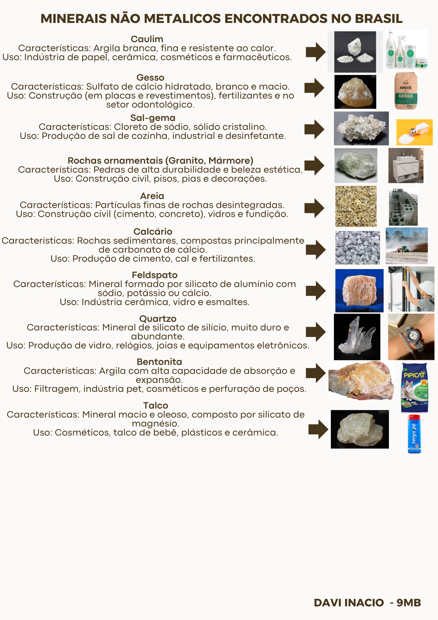 MINERAIS NÃO METALICOS ENCONTRADOS NO BRASIL Caulim Características: Argila branca, fina e resistente ao calor. Uso: Indústria de papel, cerâmica, cosméticos e farmacêuticos. Gesso Características: Sulfato de cálcio hidratado, branco e macio. ARGOS Uso: Construção (em placas e revestimentos), fertilizantes e no GESSO setor odontológico. Sal-gema Cloreto de sódio, sólido cristalino. Uso: Produção de sal de cozinha, industrial e desinfetante. Rochas ornamentais (Granito, Mármore) Características: Pedras de alta durabilidade e beleza estética. Uso: Construção civil, pisos, pias e decorações. Areia Características: Partículas finas de rochas desintegradas. Uso: Construção civil (cimento, concreto), vidros e fundição. Calcário Características: Rochas sedimentares, compostas principalmente de carbonato de cálcio. Uso: Produção de cimento, cal e fertilizantes. Feldspato Mineral formado por silicato de alumínio com sódio, potássio ou cálcio. Uso: Indústria cerâmica, vidro e esmaltes. Quartzo Características: Mineral de silicato de silício, muito duro e abundante. Uso: Produção de vidro, relógios, joias e equipamentos eletrônicos. Bentonita Características: Argila com alta capacidade de absorção e PIPICAT expansão. Uso: Filtragem, indústria pet, cosméticos e perfuração de poços. Classi Talco Mineral macio e oleoso, composto por silicato de magnésio. Uso: Cosméticos, talco de bebê, plásticos e cerâmica. DAVI INACIO - 9MB