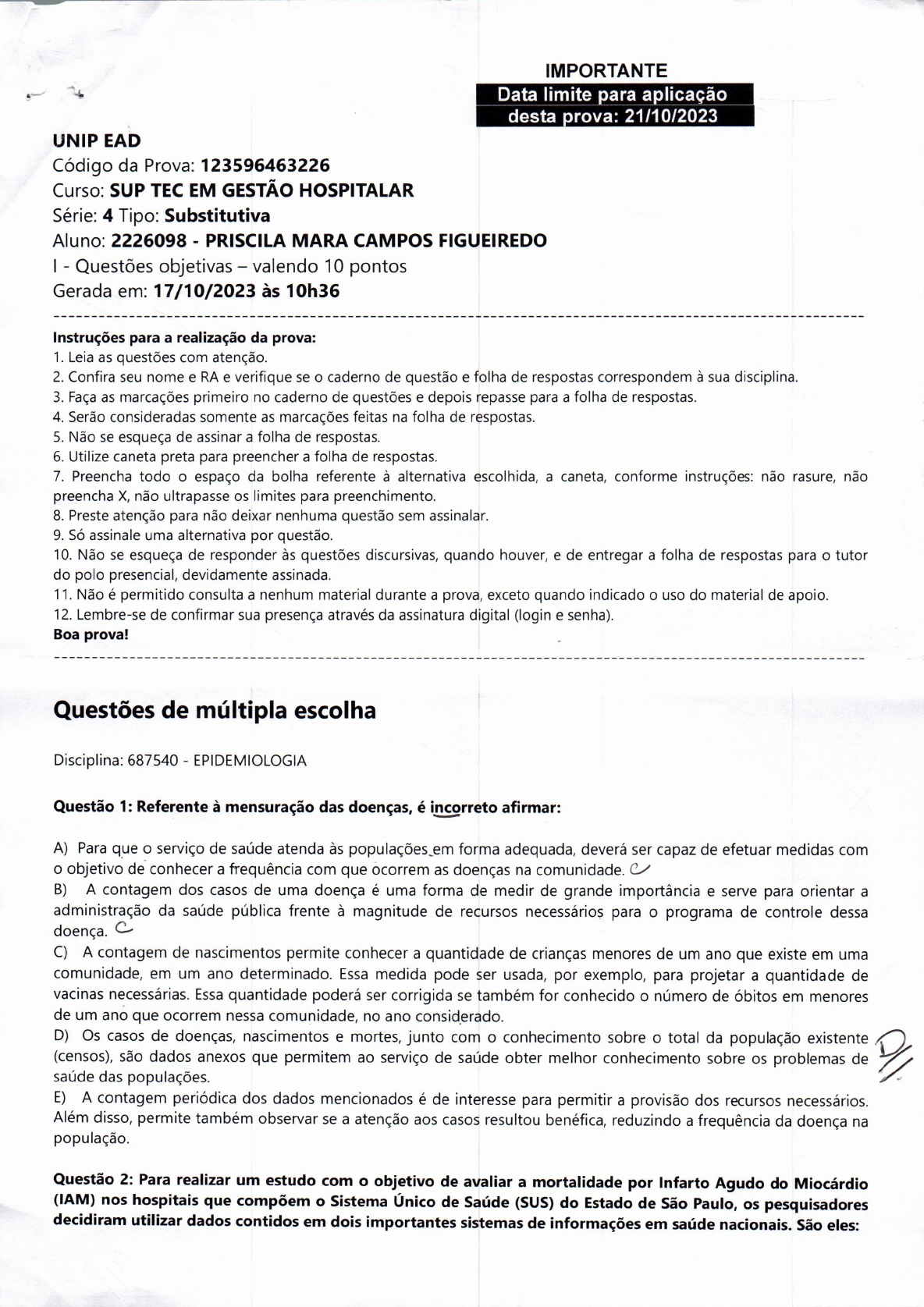 IMPORTANTE Data limite para aplicação desta prova: 21/10/2023 UNIP EAD Código da Prova: 123596463226 Curso: SUP TEC EM GESTÃO HOSPITALAR Série: 4 Tipo: Substitutiva Aluno: 2226098 PRISCILA MARA CAMPOS FIGUEIREDO I - Questões objetivas valendo 10 pontos Gerada em: 17/10/2023 às 10h36 Instruções para a realização da prova: 1. Leia as questões com atenção. 2. Confira seu nome e RA e verifique se o caderno de questão e folha de respostas correspondem à sua disciplina. 3. Faça as marcações primeiro no caderno de questões e depois repasse para a folha de respostas. 4. Serão consideradas somente as marcações feitas na folha de respostas. 5. Não se esqueça de assinar a folha de respostas. 6. Utilize caneta preta para preencher a folha de respostas. 7. Preencha todo o espaço da bolha referente à alternativa escolhida, a caneta, conforme instruções: não rasure, não preencha X, não ultrapasse os limites para preenchimento. 8. Preste atenção para não deixar nenhuma questão sem assinalar. 9. Só assinale uma alternativa por questão. 10. Não se esqueça de responder às questões discursivas, quando houver, e de entregar a folha de respostas para o tutor do polo presencial, devidamente assinada. 11. Não é permitido consulta a nenhum material durante a prova, exceto quando indicado o uso do material de apoio. 12. Lembre-se de confirmar sua presença através da assinatura digital (login e senha) Boa prova! Questões de múltipla escolha Disciplina: 687540 EPIDEMIOLOGIA Questão 1: Referente à mensuração das doenças, é incorreto afirmar: A) Para que o serviço de saúde atenda às forma adequada, deverá ser capaz de efetuar medidas com o objetivo de conhecer a frequência com que ocorrem as doenças na comunidade. B) A contagem dos casos de uma doença é uma forma de medir de grande importância e serve para orientar a administração da saúde pública frente à magnitude de recursos necessários para o programa de controle dessa doença. C C) A contagem de nascimentos permite conhecer a quantidade de crianças menores de um ano que existe em uma comunidade, em um ano determinado. Essa medida pode ser usada, por exemplo, para projetar a quantidade de vacinas necessárias. Essa quantidade poderá ser corrigida se também for conhecido o número de óbitos em menores de um ano que ocorrem nessa comunidade, no ano considerado. D) Os casos de doenças, nascimentos e mortes, junto com o conhecimento sobre o total da população existente (censos), são dados anexos que permitem ao serviço de saúde obter melhor conhecimento sobre os problemas de saúde das populações. E) A contagem periódica dos dados mencionados é de interesse para permitir a provisão dos recursos necessários. Além disso, permite também observar se a atenção aos casos resultou benéfica, reduzindo a frequência da doença na população. Questão 2: Para realizar um estudo com o objetivo de avaliar a mortalidade por Infarto Agudo do Miocárdio (IAM) nos hospitais que compõem o Sistema Único de Saúde (SUS) do Estado de São Paulo, os pesquisadores decidiram utilizar dados contidos em dois importantes sistemas de informações em saúde nacionais. São eles:A) e SIH. Sinan e SIM. ltra C) SIH e SIM. D) SIM e Sinasc. E) SIAB e Sinan. Questão 3: Sobre endemia, é incorreto afirmar: Endemia é uma alteração espacial e cronologicamente delimitada, do estado de saúde/doença de uma população, caracterizada por uma evolução progressivamente crescente e inesperada dos coeficientes de incidência de determinada doença, ultrapassando valores acima do limiar epidêmico preestabelecido B) Endemia refere-se à doença habitualmente presente entre uma determinada população. A C) Doenças endêmicas têm como determinantes o ambiente físico e social em que D) Doenças endêmicas afetam quase sempre grupos populacionais de menor poder aquisitivo, sujeitos a más condições de habitação, desnutrição e desinformação. E) Doenças endêmicas afetam por muitos anos populações, predominantemente rurais, apesar da tendência de urbanização que vem sendo observada, produto não só da migração campo cidade, mas do crescente empobrecimento das populações já residentes nos centros urbanos. Questão 4: Leia as assertivas a seguir: I. A mortalidade por doenças infecciosas e parasitárias era predominante no Brasil até meados da década de II. Fatores ambientais, sociais, econômicos e biológicos interagem de forma constante e têm papéis essenciais na gênese das enfermidades humanas. III. A urbanização não contribuiu para a mudança do padrão de mortalidade em nosso país. IV. As doenças crônicas degenerativas são enfermidades com história natural prolongada, existindo de forma assintomática por curto intervalo de tempo. V. As doenças crônicas degenerativas têm fatores de risco múltiplos e complexos. Assinale a alternativa que correta: A) Somente I é verdadeira. B) Somente I e são verdadeiras. C) Somente I, II e III são verdadeiras. D) Somente I, II e IV são verdadeiras. Somente I, e V são verdadeiras. Questão 5: Em meados do século XIX, a teoria sobre as condições de saúde e como acontecia o processo saúde-doença determinante era a teoria miasmática. Sobre a Teoria dos Miasmas, podemos afirmar corretamente: A) A teoria determinava que as doenças aconteciam exclusivamente decorrente da decomposição de plantas. B) A teoria determinava que as doenças aconteciam exclusivamente decorrente da decomposição de animais. C) Na teoria miasmática, a origem das doenças se situava na má qualidade do ar, proveniente de decomposições de animais e plantas. D) A teoria miasmática determinava que o processo saúde-doença acontecia pela diferença nas patologias das áreas rurais e urbanas. A teoria miasmática esclarecia que as doenças aconteciam por questões religiosas e que a doença era considerada um castigo ou carma. Questão 6: Entende-se por letal