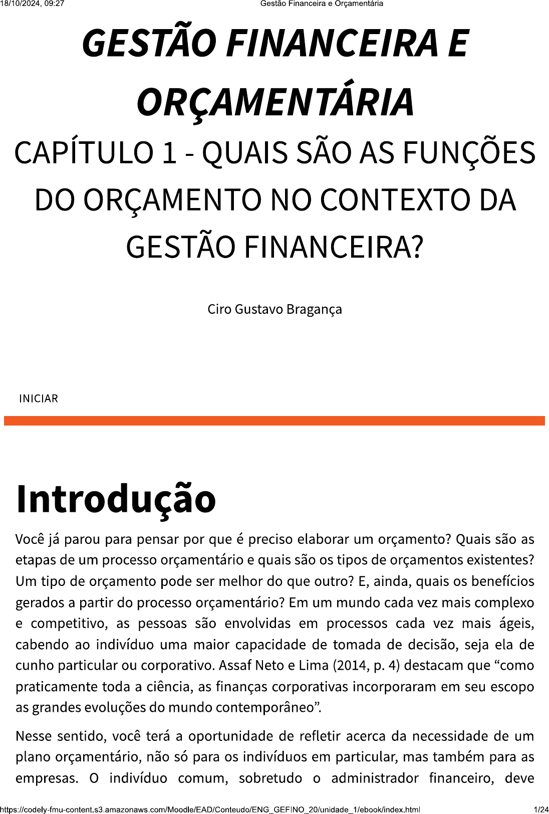 18/10/2024, 09:27 Gestão Financeira e Orçamentária GESTÃO FINANCEIRA E ORÇAMENTÁRIA CAPÍTULO 1 - QUAIS SÃO AS FUNÇÕES DO ORÇAMENTO NO CONTEXTO DA GESTÃO FINANCEIRA? Ciro Gustavo Bragança INICIAR Introdução Você já parou para pensar por que é preciso elaborar um orçamento? Quais são as etapas de um processo orçamentário e quais são os tipos de orçamentos existentes? Um tipo de orçamento pode ser melhor do que outro? E, ainda, quais os benefícios gerados a partir do processo orçamentário? Em um mundo cada vez mais complexo e competitivo, as pessoas são envolvidas em processos cada vez mais ágeis, cabendo ao indivíduo uma maior capacidade de tomada de decisão, seja ela de cunho particular ou corporativo. Assaf Neto e Lima (2014, p. 4) destacam que "como praticamente toda a ciência, as finanças corporativas incorporaram em seu escopo as grandes evoluções do mundo contemporâneo". Nesse sentido, você terá a oportunidade de refletir acerca da necessidade de um plano orçamentário, não só para os indivíduos em particular, mas também para as empresas. indivíduo comum, sobretudo o administrador financeiro, deve 1/2418/10/2024, 09:27 Gestão Financeira e Orçamentária constantemente estar atento às mudanças globais para responder prontamente às demandas, bem como utilizar-se de ferramentas empresariais que possam auxiliar suas decisões. A compreensão das técnicas de gestão orçamentária é necessária, ainda, a fim de que as empresas possam minimizar erros de suas operações, gerando qualidade em seus processos, qualidade dos produtos e dos serviços prestados, bem como a minimização de riscos à sua sobrevivência no mercado. Dessa forma, este capítulo ajudará você a compreender essas e outras questões ligadas ao processo orçamentário, como: funções do orçamento, etapas e princípios do planejamento e controle orçamentário, informações gerenciais por meio do processo orçamentário e outros. Os conceitos discutidos ajudarão você a compreender os processos formais da elaboração de um orçamento e os benefícios gerados a partir dessa ferramenta. Sendo assim, vamos começar, pois teremos muito trabalho a partir de agora. Bons estudos! 1.1 Visão geral do orçamento O orçamento possui uma função extremamente importante na vida das pessoas. Em uma visão geral, contribui para controlar e avaliar o desempenho de colaboradores e, por sua vez, o desempenho empresarial. Informações úteis para decisões gerenciais são obtidas por meio da utilização de tipos de orçamentos que variam de um indivíduo para outro ou de empresa para empresa, conforme a necessidade gerencial. O orçamento direciona e coordena as atividades empresariais e pode ser utilizado até mesmo em âmbito pessoal, para as finanças domésticas. Para as empresas em geral, serve para coordenar atividades em prol de se cumprirem os objetivos traçados pela alta administração. Desse modo, é comum que se diga que o orçamento tem funções de controle e de avaliação. Ressalta-se, portanto, a importância dessa ferramenta gerencial no ambiente corporativo, auxiliando as atividades empresariais de ordem operacional, administrativa e financeira. E quanto a você, sabe quais são as funções de controle e de avaliação? O que é importante saber acerca desses conceitos? Ao estudar os próximos itens, você será capaz de responder a esses questionamentos. Vamos lá! 2/2418/10/2024, 09:27 Gestão Financeira e Orçamentária 1.1.1 Função de controle Você sabe por que a função de controle é tão importante no âmbito do processo orçamentário? Considera-se que "controlar" seja o exercício de uma certa autoridade sobre algo ou sobre alguém. Entretanto, quando se fala em orçamentos, exige-se que seja tratado o contexto do controle financeiro. Por outro lado, um adequado controle financeiro necessita de um planejamento. Para tanto, planejar é antecipar os fatos, e isso requer de um gestor informações acuradas acerca das suas receitas e gastos ou os de uma determinada empresa. Frezatti (2017, p. 16) comenta que "planejar sem controlar é uma falácia e desperdício de tempo e energia". Sendo assim, qual é a função do controle? Você deve ter respondido que é verificar se o que foi planejado está sendo atingido, contribuindo assim para o acompanhamento do desempenho empresarial ou individual por meio do orçamento. VOCÊ SABIA? De que trata o Princípio da Controlabilidade? Ele "prevê que os gestores só devem ser avaliados com base em elementos que podem controlar" (BEUREN; AMARO; SILVA, 2015, p. 380). Isso quer dizer que a avaliação de um gerente, por exemplo, será mais justa considerando o Princípio da Controlabilidade. Compreende-se dessa forma que o controle exercido sobre as ações de um colaborador e sua avaliação sobre isso devem passar pelo crivo do bom senso e da coerência gerencial. Ou seja, um profissional deve ser avaliado de forma justa em relação ao que ele de fato possa intervir para que não ocorra, por exemplo, um desvio orçamentário qualquer. Em certas situações, o colaborador não exerce efetivamente um controle sobre a situação e não deveria ser avaliado por isso. Acrescenta-se ainda que a função de controle pode ser uma forma de manter os profissionais da empresa alertas, no sentido do alcance das metas. Por exemplo, podem-se implantar reuniões periódicas de apresentação do desempenho por setor, como forma de controle orçamentário. 3/2418/10/2024, 09:27 Gestão Financeira e Orçamentária Nesse sentido, a função de controle gera importantes benefícios para o ambiente corporativo, mas deve ser vista como forma de aprimoramento dos processos, dos produtos e serviços, bem como para desenvolvimento profissional dos colaboradores, nunca como forma de punição aos envolvidos no orçamento. 1.1.2 Função de avaliação Você sabe por que é fundamental avaliar o desempenho das ações pelas quais algué