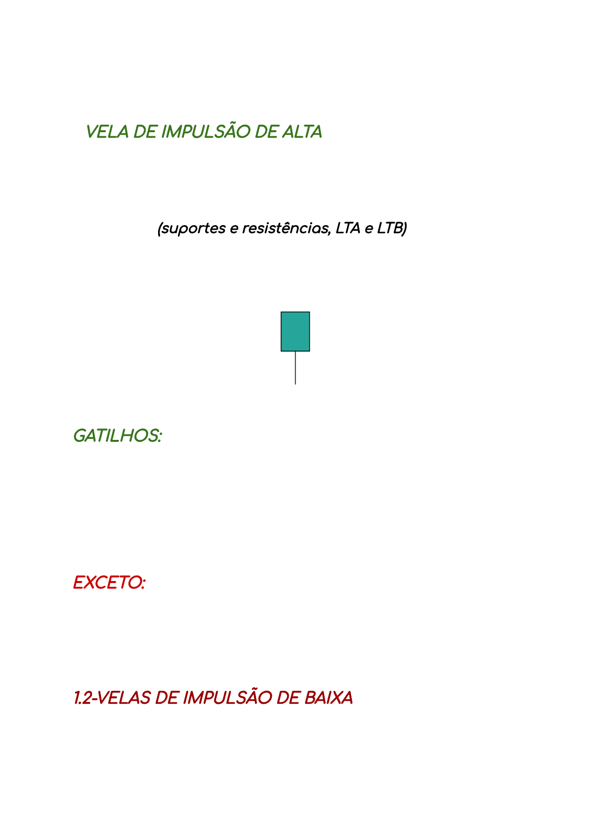 Candles / Referencias 1-VELA DE IMPULSÃO DE ALTA Deixa pavio de alta e um corpo de alta, vale ressaltar que o pavio deve ser menor que o corpo da vela. Opera-se, primeiramente, observar a tendência principal, “LTA”; Marcar referências (suportes e resistências, LTA e LTB) voltando o gráfico. O candle: GATILHOS: O pavio pode estar tocando no suporte ou LTA, entrando comprado logo na abertura; Buscando alcançar uma referência (resistência), no fechamento da vela ALTA, Pode entrar comprando na abertura da próxima vela; No rompimento de uma referência (resistência), esperar a próxima vela voltar na referência que virou suporte e efetuar a compra para a mesma vela, jamais para a próxima vela! EXCETO: Se o fechamento da vela de alta estiver sendo travado (encostando) por uma referência (resistência OU LTA). =============================================================== 1.2-VELAS DE IMPULSÃO DE BAIXA Deixa pavio de BAIXA e um corpo de BAIXA, ressaltando que o pavio deva ser menor que o corpo da vela. Opera-se, primeiramente, observar a tendência principal, “LTB”; Marcar referências (suportes e resistências, LTA e LTB) voltando o mapa; O candle: GATILHOS: O pavio pode estar tocando na resistência ou LTB, entrando VENDIDO logo na abertura; Buscando alcançar uma referência (SUPORTE), no fechamento da vela BAIXA, PODE entrar VENDIDO na abertura da próxima vela; No rompimento de uma referência (SUPORTE), esperar a próxima vela voltar na referência que virou RESISTÊNCIA e efetuar a VENDA para a mesma vela, jamais para a próxima vela! EXCETO: Se o fechamento da vela de BAIXA estiver sendo travado (encostando) por uma referência (SUPORTE OU LTB). 2-VELAS DE FORÇA DE BAIXA E DE ALTA VELA DE FORÇA É MAIS FÁCIL DE OPERAR! Tem-se a obter uma boa assertividade operando em bons horários, por exemplo, de 7 às 11 horas da manhã. Vela de Força de Alta: -Verificar a tendência atual; -Fazer as marcações; Operar a favor da tendência preferencialmente e, também, nas lateralização. O candle: Gatilhos de entrada: Fazer entradas na próxima vela, deixando a vela descer em torno da metade desta vela ou 50% desta vela, preferencialmente, e entrando comprado. Podendo fazer entradas de 30 a 40%, também. Tipo pullback rs :D. =============================================================== 2.1-VELAS DE FORÇA DE BAIXA E DE BAIXA É a mesma coisa do força de alta só converte a lógica para a baixa :D. O candle: EXEMPLO NO GRÁFICO: 3-VELAS DE FRAQUEZA As velas de fraqueza dependem muito da referência em que for usar, podendo dar uma boa assertividade. Elas se caracterizam por ter um corpo pequeno, podendo ter pavios nos dois lados ou até mesmo, num lado apenas. Importante não confundir as velas de fraqueza com velas de descanso! Caracterizam-se, principalmente, por ter uma vela de força anterior a ela, podendo efetuar uma compra ou uma venda. Pois ela é uma vela de reversão e ela deve estar em cima de uma referência. Vela de fraqueza de baixa: Vela de fraqueza de alta: Deve-se, então, observar: Se a vela anterior é de força e da mesma cor; Ela deve estar próxima ou encostando numa referência, se atentar caso ela esteja abaixo da referência (tendência de baixa) ou acima de uma referência (tendência de alta); Fazer entrada logo na abertura da próxima vela, acreditando que o gráfico irá obedecer o sentido da entrada. =============================================================== 4-VELA DE CONTINUAÇÃO DE BAIXA A vela de continuação de baixa, se caracteriza por deixar pavios do mesmo tamanho numa tendência de baixa. Podendo ter duas ou três velas na tendência de baixa, pavios do mesmo tamanho e um corpo aparente. Fazendo a entrada (vendido) na abertura na próxima vela ou deixar ela buscar os 50% da vela de continuação. Dando, assim, uma continuação da tendência de baixa. O candle: COMO E QUANDO NÃO ENTRAR? Quando a vela de continuação estiver sendo travada por uma referência! Exemplo: QUANDO FAZER ENTRADAS NA VELA DE CONTINUAÇÃO? Assim como as velas de impulsão, quando a vela estiver tocando numa referência (LTA, LTB, SUPORTE OU RESISTÊNCIA Quando ela estiver rompendo uma referência, podendo entrar na abertura da próxima vela ou nos 50% da vela anterior e, também, se tiver uma referência mais abaixo, pode-se fazer a entrada (vendido), acreditando que a vela irá buscá-la. Exemplo: 4.1-VELA DE CONTINUAÇÃO DE ALTA: A vela de continuação de ALTA, se caracteriza por deixar pavios do mesmo tamanho numa tendência de alta. Podendo ter duas ou três velas na tendência de ALTA, pavios do mesmo tamanho e um corpo aparente. Fazendo a entrada (COMPRADO) na abertura na próxima vela ou deixá-la buscar os 50% da vela de continuação. Dando, assim, uma continuação da tendência de alta. QUANDO FAZER ENTRADAS NA VELA DE CONTINUAÇÃO DE ALTA? Assim como as velas de impulsão, quando a vela estiver tocando numa referência (LTA, LTB, SUPORTE OU RESISTÊNCIA; Quando ela estiver rompendo uma referência, podendo entrar na abertura da próxima vela ou nos 50% da vela anterior; E, também, se tiver uma referência mais ACIMA, pode-se fazer a entrada (COMPRADO), acreditando que a vela irá buscá-la. Exemplo: =============================================================== 5-VELA DE DESCANSO DE ALTA E DE BAIXA: VELA DE DESCANSO DE BAIXA: É uma vela pequena, que aparece depois de uma sequência de velas vermelhas, numa tendência forte de baixa. Significa que a tendência está descansando. E que após esse descanso, haverá a continuação das velas de baixa. COMO OPERAR AS VELAS DE DESCANSO DE BAIXA? -Observar que está se formando uma tendência de baixa, com topos e fundos descendentes Atentar que essa tendência terá que ter rompido um suporte, ou seja, a vela de descanso de baixa deve estar abaixo do suporte Em seguida, entrar vendido para a próxima vela. Acreditando que o gráfico irá seguir a tendência de baixa para o próximo min