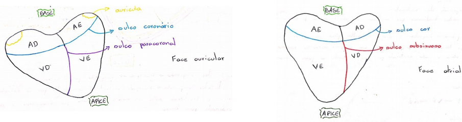 Introdução à esplancnologia A esplancnologia é a parte da anatomia que estuda as vísceras que se relacionam com a manutenção e a persistência da vida. · Tipos de vísceras i. Tubulares Esôfago, intestino, traquéia ii. Cavitárias Coração, estomago iii. Parenquimatosas Fígado, pâncreas iv. Pseudo-parenquimatosas Pulmão, rins, testículos · Cavidades corpóreas i. Cavidade torácica: revestida por pleura, quando reveste vísceras se chama pleura visceral, quando reveste a parede da cavidade se chama pleura parietal. Na cavidade torácica existe o espaço onde se encontra o coração, mediastino, que é revestido por pleura mediastina. ii. Cavidade abdominal: revestida por peritônio, quando reveste vísceras se chama peritônio visceral, quando reveste a parede da cavidade se chama peritônio visceral. Na cavidade abdominal, os rins não são revestidos por peritônio. iii. Cavidade pélvica: também é revestida por peritônio assim como a cavidade abdominal, ela não aloja nenhuma víscera, apenas prolongamentos das mesmas. · Camadas de vísceras i. Serosa- camada mais externa ii. Muscular- camada média iii. Mucosa- camada mais interna Sistema circulatório sanguíneo O coração é o órgão central da circulação e se localiza na cavidade torácica, no mediastino, é envolto pelo pericárdio que é constituído por duas camadas: fibrosa e serosa, a serosa se divide em duas laminas, uma visceral e outra parietal, entre essas laminas se encontra o liquido pericárdico. · Anatomia externa É um órgão muscular, oco, com formato cônico irregular que possui uma base e um ápice, que consiste em duas faces, face esquerda ou auricular e face direita ou atrial, com 3 camadas (epicárdio, miocárdio e endocárdio) e é dividido por 3 sulcos (sulco atrioventricular ou coronário, sulco interventricular paracornal e sulco interventricular subsinuoso). · Anatomia interna O coração internamente possui 4 câmaras (átrio direito, átrio esquerdo, ventrículo direito e ventrículo esquerdo) e 3 septos (septo atrioventricular, septo interventricular e septo atrial). Entre os átrios e ventrículos existem as valvas, a valva atrioventricular direita é tricúspide (formada por 3 válvulas), já a valva atrioventricular esquerda bicúspide (formada por 2 válvulas). A função de ambas é impedir o refluxo do sangue para o átrio. Controlando o movimento destas válvulas existem as cordas tendíneas que são ligadas ao musculo papilar que se encontra na parede do coração. Existe também as valvas semilunares, a aórtica que impede o refluxo do sangue da Aorta para o ventrículo esquerdo, e a pulmonar que impede o refluxo do sangue do tronco pulmonar para o ventrículo direito. Também encontramos no coração a trabécula septomarginal que limita a expansão dos ventrículos. Obs: nodo sinoatrial é um tecido nervoso que emite um impulso nervoso responsável pela sístole de cada átrio e cada ventrículo por todo o septo e pelas fibras de Purkinge. · Circulação sanguínea O sangue chega ao átrio direito pelas veias cavas (cranial e caudal), com a sístole do AD esse sangue passa pela valva tricúspide para o ventrículo direito, que se encontra em diástole. Ao realizar sístole esse sangue é impulsionado para a artéria pulmonar, que leva o sangue para os pulmões onde ocorre a hematose, e volta para o coração rico em o2, pela veia pulmonar para o átrio esquerdo que realiza sístole e impulsiona o sangue pela valva bicúspide para o ventrículo esquerdo que se encontra em diástole, ao realizar a sístole joga o sangue para artéria aorta que irriga o corpo todo até o sangue voltar para o átrio direito pelas veias cavas e recomeçar o processo. · Circulação pulmonar ou pequena circulação Ventrículo direito → Artéria pulmonar → pulmão → veias pulmonares → átrio esquerdo · Circulação sistêmica ou grande circulação Ventrículo esquerdo → artéria aorta → corpo → veias cavas → átrio direito · Ramos da Artéria Aorta 1) Artérias coronárias (direita e esquerda) 2) Aorta ascendente 3) Arco aórtico 4) Aorta descendente (ramo torácico e ramo abdominal) · Artérias coronárias Na face auricular se ramifica em A. circunflexa cardíaca direita e esquerda, sendo que a esquerda desce se tornando A. paraconal. Na face atrial se ramifica em A. circunflexa cardíaca direita e esquerda, sendo que em carnívoros e ruminantes, a esquerda desce se tornando A. subsinuosa e em equinos e suínos, a direita que desce e se torna A. subsinuosa. · Aorta ascendente torácica -Tronco braquicefálico arterial: Artéria subclávia esquerda (em cães e suínos sai direto do arco aórtico); Artéria subclávia direita – A. vertebral – A. axilar – A. braquial – A.cubital – A.radial e A.ulnar – A.digitais ; Artéria carótida comum esquerda – A. carótida interna – A. carótida externa; Artéria carótida comum direita; -Artérias intercostais; · Aorta abdominal – Artéria tronco cefálico: A. gástrica esquerda A. hepática comum A. gastroesplênica – Artéria mesentérica cranial: A. duodenopancreática A. jejunais A. cólica comum –Artérias renais –Artérias duodenais –Artéria circunflexa ilíaca profunda –Artéria mesentérica caudal: A. cólica interna A. cólica média A. retal –A. ilíaca externa (esquerda e direita): A. femoral–A. poplítea–A. safena medial e A. safena lateral–A. digital –A. ilíaca interna (esquerda e direita) –A. sacral medial · Ramos da veia cava · Veia cava cranial – Veia ázigos – Tronco braquicefálico venoso: v.subclávia(dir e esq)–v.jugular externa(dir e esq)–v.jugular interna(dir e esq) · Veia cava caudal –Veia renal –Veia hepática própria –Veia porta hepática –Veia esplênica –Veia mesentérica Obs: a veia gonadal esquerda desemboca na v. renal esquerda Obs: a mesentérica caudal e cranial desembocam na porta hepática, que leva o sangue até a o fígado, pra 