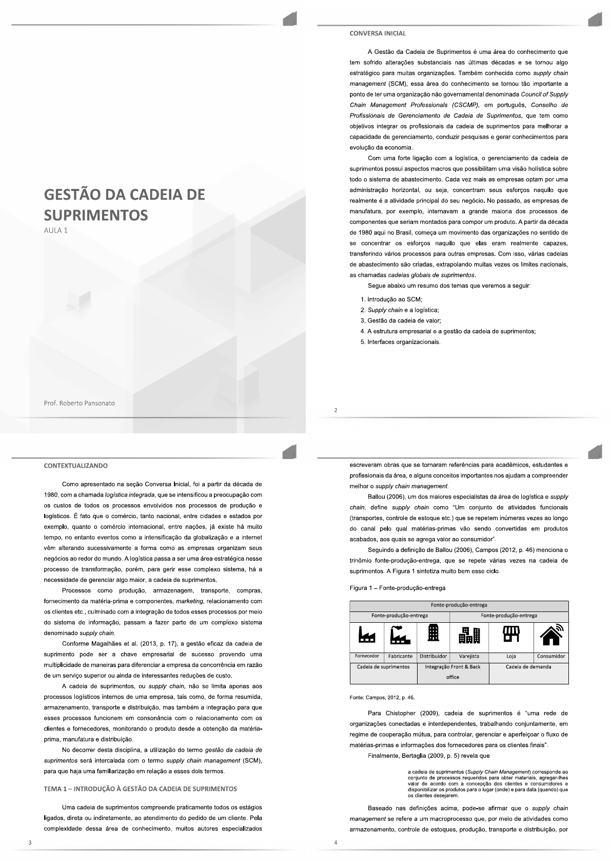 CONVERSA INICIAL A Gestão da Cadeia de Suprimentos é uma área do conhecimento que tem sofrido alterações substanciais nas últimas décadas e se tornou algo estratégico para muitas organizações. Também conhecida como supply chain management (SCM), essa área do conhecimento se tornou tão importante a ponto de ter uma organização não governamental denominada Council of Supply Chain Management Professionals (CSCMP), em português, Conselho de Profissionais de Gerenciamento de Cadeia de Suprimentos, que tem como objetivos integrar os profissionais da cadeia de suprimentos para melhorar a capacidade de gerenciamento, conduzir pesquisas e gerar conhecimentos para evolução da economia. Com uma forte ligação com a logística, o gerenciamento da cadeia de suprimentos possui aspectos macros que possibilitam uma visão holística sobre todo o sistema de abastecimento. Cada vez mais as empresas optam por uma GESTÃO DA CADEIA DE administração horizontal, ou seja, concentram seus esforços naquilo que realmente é a atividade principal do seu negócio. No passado, as empresas de SUPRIMENTOS manufatura, por exemplo, internavam a grande maioria dos processos de componentes que seriam montados para compor um produto. A partir da década AULA 1 de 1980 aqui no Brasil, começa um movimento das organizações no sentido de se concentrar os esforços naquilo que elas eram realmente capazes, transferindo vários processos para outras empresas. Com isso, várias cadeias de abastecimento são criadas, extrapolando muitas vezes os limites nacionais, as chamadas cadeias globais de suprimentos. Segue abaixo um resumo dos temas que veremos a seguir: 1. Introdução ao SCM: 2. Supply chain e a logística; 3. Gestão da cadeia de valor: 4. A estrutura empresarial e a gestão da cadeia de suprimentos; 5. Interfaces organizacionais. Prof. Roberto Pansonato 2 CONTEXTUALIZANDO escreveram obras que se tornaram referências para acadêmicos, estudantes e profissionais da área, e alguns conceitos importantes nos ajudam a compreender Como apresentado na seção Conversa Inicial, foi a partir da década de melhor o supply chain management. 1980, com a chamada logística integrada, que se intensificou a preocupação com Ballou (2006), um dos maiores especialistas da área de logística e supply os custos de todos os processos envolvidos nos processos de produção e chain, define supply chain como "Um conjunto de atividades funcionais logísticos. É fato que o comércio, tanto nacional, entre cidades e estados por (transportes, controle de estoque etc.) que se repetem inúmeras vezes ao longo exemplo, quanto o comércio internacional, entre nações, já existe há muito do canal pelo qual matérias-primas vão sendo convertidas em produtos tempo, no entanto eventos como a intensificação da globalização e a internet acabados, aos quais se agrega valor ao consumidor". vêm alterando sucessivamente a forma como as empresas organizam seus Seguindo a definição de Ballou (2006), Campos (2012, p. 46) menciona o negócios ao redor do mundo. A logística passa a ser uma área estratégica nesse trinômio que se repete várias vezes na cadeia de processo de transformação, porém, para gerir esse complexo sistema, há a suprimentos. A Figura 1 sintetiza muito bem esse ciclo. necessidade de gerenciar algo maior, a cadeia de Processos como produção, armazenagem, transporte, compras, Figura 1 Fonte-produção-entrega fornecimento da matéria-prima e componentes, marketing, relacionamento com os clientes etc. culminado com a integração de todos esses processos por meio Fonte-produção-entrega Fonte-produção-entrega do sistema de informação, passam a fazer parte de um complexo sistema denominado supply chain. Conforme Magalhães et al. (2013, p. 17), a gestão eficaz da cadeia de suprimento pode ser a chave empresarial de sucesso provendo uma Fornecedor Fabricante Distribuidor Varejista Loja Consumidor multiplicidade de maneiras para diferenciar a empresa da concorrência em razão Cadeia de suprimentos Integração Front & Back Cadeia de demanda de um serviço superior ou ainda de interessantes reduções de custo. office A cadeia de suprimentos, ou supply chain, não se limita apenas aos processos logísticos internos de uma empresa, tais como, de forma resumida, Fonte: Campos, 2012, p. 46. armazenamento, transporte e distribuição, mas também a integração para que Para Chistopher (2009), cadeia de suprimentos é "uma rede de esses processos funcionem em consonância com o relacionamento com os organizações conectadas e interdependentes, trabalhando conjuntamente, em clientes e fornecedores, monitorando o produto desde a obtenção da matéria- regime de cooperação mútua, para controlar, gerenciar e aperfeiçoar o fluxo de prima, manufatura e distribuição. matérias-primas e informações dos fornecedores para os clientes finais". No decorrer desta disciplina, a utilização do termo gestão da cadeia de Finalmente, Bertaglia (2009, p. 5) revela que suprimentos será intercalada com o termo supply chain management (SCM), para que haja uma familiarização em relação a esses dois termos. a cadeia de suprimentos (Supply Chain Management) corresponde ao conjunto de processos requeridos para obter materiais, agregar-lhes valor de acordo com a concepção dos clientes e consumidores e TEMA 1 INTRODUÇÃO À GESTÃO DA CADEIA DE SUPRIMENTOS disponibilizar os produtos para lugar (onde) para data (quando) que os clientes desejarem. Uma cadeia de suprimentos compreende praticamente todos os estágios Baseado nas definições acima, pode-se afirmar que o supply chain ligados, direta ou indiretamente, ao atendimento do pedido de um cliente. Pela management se refere a um macroprocesso que, por meio de atividades como complexidade dessa área de conhecimento, muitos autores especializados armazenamento, controle de estoques, produção, transporte e distribuição, por 3 4exemplo, tem como objetivo