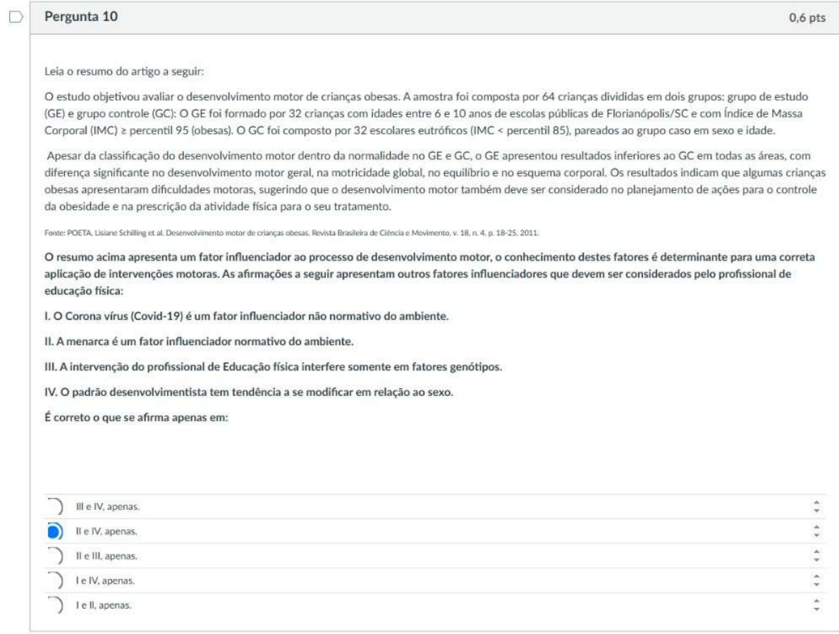 Pergunta 10 0,6 pts Leia o resumo do artigo a seguir: estudo objetivou avaliar desenvolvimento motor de crianças obesas. A amostra foi composta por 64 crianças divididas em dois grupos: grupo de estudo (GE) e grupo controle (GC): o GE foi formado por 32 crianças com idades entre 6 e 10 anos de escolas públicas de Florianópolis/SC e com Índice de Massa Corporal (IMC) percentil 95 (obesas). GC foi composto por 32 escolares eutróficos (IMCPergunta 9 0,6 pts Leia o resumo a seguir: objetivo desta reflexão teórica é buscar o entendimento do processo de aquisição das habilidades de movimentos especializados. Inicialmente devemos entender que desenvolvimento dessas habilidades depende de uma combinação de condições especificas: a exigência da tarefa, a biologia do indivíduo e as condições do meio de aprendizagem. Outro ponto a destacar é que não atingir padrões maduros de movimentos fundamentais tem consequências diretas na habilidade do movimento especializado do Desta forma, entendemos que estágio de transição é caracterizado pelas tentativas do em refinar no estágio de aplicação o indivíduo torna-se consciente de seus dotes e limitações e no estágio de aplicação ao longo da vida, os indivíduos geralmente treinam para competir ou participar de Finalizando, em todas as fases objetivo é o aprimoramento da habilidade, através de três controle do o controle emocional e prazer da aprendizagem. Fonte: GALLAHUE David Conceitos para maximizar o desenvolvimento da habilidade de movimento especializado. Journal of Physical Education 16. 2 Considerando esse contexto e seu conhecimento prévio em relação a teoria de desenvolvimento avalie as seguintes asserções e a relação proposta entre elas. I. A última fase/estágio do processo de desenvolvimento motor ocorre geralmente entre dos 6 aos 12 anos, nesse período ocorre uma progressão para movimentos especializados PORQUE II. Com a progressão para a fase especializada adolescente consegue combinar movimentos e realizar por exemplo movimentos estabilizadores de rolamento para frente ou para trás. A respeito dessas asserções, assinale a opção correta: As asserções I e são proposições e a é uma justificativa da - A asserção I é uma proposição verdadeira, e a é uma proposição falsa As asserções e II são proposições mas a II não é uma justificativa da As asserções e II são proposições A asserção I é uma proposição e a II é uma proposição verdadeira.Pergunta 7 0,6 pts Leia o texto a seguir: o processo de desenvolvimento motor e o processo de desenvolvimento humano apresentam uma série de estágios e fases, conforme os diferentes tipos de Segundo a teoria de desenvolvimento motor de na fase reflexiva os bebês realizam basicamente movimentos primitivos e movimentos posturais. Assinale a alternativa que apresente corretamente as características destes momentos. Os movimentos primitivos se relacionam ao instinto de sobrevivência e prioritariamente com os aspectos e os movimentos posturais são movimentos voluntários. Os movimentos primitivos e posturais apresentam grande ambos se relacionam ao instinto de sobrevivência e prioritariamente com os aspectos Os movimentos primitivos se relacionam ao instinto de sobrevivência e prioritariamente com os aspectos nutricionais, e os movimentos posturais também são entretanto, possuem grande semelhança com movimentos voluntários. Os movimentos posturais se relacionam ao instinto de sobrevivência e prioritariamente com os aspectos e os movimentos primitivos são movimentos voluntários. Os movimentos posturais se relacionam ao instinto de sobrevivência e prioritariamente com os aspectos nutricionais, e os movimentos primitivos também são involuntários, possuem grande semelhança com movimentos voluntários.Pergunta 8 0,6 pts Leia o texto a seguir: Há uma série de questões determinantes para o aumento do desempenho relacionado ao processo de aprendizagem motora. Dentre as alternativas abaixo, escolha a que apresente um fator determinante para o progresso entre os 3 estágios do processo de aprendizagem motora. A maturação. A A AOs anos se passaram enquanto eu dormia E quem eu queria bem me esquecia Será que eu falei o que ninguém ouvia? Será que eu escutei que ninguém dizia? Eu não me adaptar, me adaptar Eu não tenho mais a cara que eu tinha No espelho essa cara já não é minha É que quando eu me toquei achei tão estranho A minha barba estava deste tamanho Será que eu falei o que ninguém ouvia? Será que eu escutei que ninguém dizia? Eu não me adaptar, me adaptar. Fonte: A Não you me Paulos Faixa 6. Disco de Do ponto de vista do desenvolvimento, a retratada na canção de Arnaldo Antunes, pode ser definida como periodo dos 11 aos 12 anos de idade no qual ocorre uma redução na taxa de aumento na força e habilidades sendo ápice do desempenho físico e alta influência das escolhas do estilo de vida em relação à período dos 11 aos 20 anos de no qual ocorre potencial redução das capacidades da destreza e do crescimento alta suscetibilidade à interferência de questões comportamentais no organismo e na período dos 11 aos 20 anos de idade no qual ocorre a maturidade grande crescimento físico, suscetibilidade à interferência de questões comportamentais no organismo (transtornos alimentares e abuso de drogas). período dos 11 aos 20 anos de idade em que ocorre ápice do desempenho com posterior redução aumento de complexidade e sensibilidade ambiental em relação ao grande crescimento físico dos 16 aos 21 anos de idade, no qual ocorre a maturidade reprodutiva, pouco crescimento redução de apetite e aumento do sono, além da alta influência das escolhas do estilo de vida em relação à saúde doPergunta 5 0,6 pts Leia o texto a seguir: processo desenvolvimento humano é continuo e compreende todos os momentos da vida, este processo possui várias concepções segundo uma série de teórico