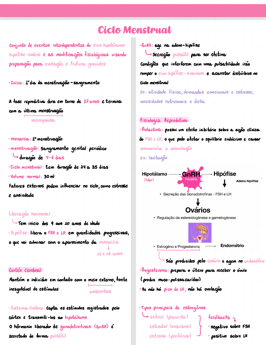 Ciclo Menstrual conjunto de eventos interdependentes do eixo hipotálamo · GnRH : aga na adeno hipófise hipófise-orário e as modificações fisiológicas visando · secreção pulsátil para ser efetiva preparação para ovulação e frutura gravidez condições que interferem com uma pulsatilidade irão romper o eixo hipófise ovariano e acarretar distúrbios no · Início : Lodia da menstruação sangramento ciclo menstrual ex : atividade física, demandas emocionais e estresse, A fase reprodutiva dura em torno de 37 anos e termina necesidades nutricionais e dieta com a última menstruação menopausa Fisiologia Reprodutiva · Prolactina : possui um efeito inibitório sobre a ação clínica · menarca : 1a menstruação do FSH e LH, o que pode afetar o equilibrio endócrino e causar · menstruação : Sangramento genital periódico amenorréia e anovulação · duração de 4-6 dias ex : lactação D · Ciclo menstrual : tem duração de 24 a 35 dias · Volume normal : 30 ml lider fatores externos podem influenciar no ciclo, como estresse e ansiedade Liberação hormonal D · Tem inicio dos 9 aos 10 anos de Idade · Hipófise : libera o FSH e LH em quantidades progressivas, o que vaiculminar com o aparecimento da menarca Y 11 e 16 anos · são produzidos pelo ovário e agem no endométrio Cortex cerebral · Progesterona : prepara o útero para receber o óvulo Mantémo individuo em contato com o meio externo, fonte produz muco-polissacarídeo inesgotável de estímulos ambientais · Se não há pico de LH, não há ovulação ·Sistema límbico : Capta os estímulos registrados pelo · Tipos principais de estrogênios córtex e transmiti-los ao hipotálamo - estriol placenta feedbacks Y O hormonio liberador de gonadotrofinas GRH é estradiol ovariano S · negativo sobre FSH secretado de forma pulsátil estrona periférico positivo sobre LI Ciclo Menstrual · FSHT · Ocorre o TFSH e em média 15 folículos são recrutados - recrutamento dos foliculos 8 13 - proliferação das células granulosas - início da produção de estradiol dando origam a um número maior de camadas de cel ,3 -Lúnico é o folículo dominante, os outros sofrem atresia formando uma massa em torno do ovócito · 14 o dia : o corre um pico de estradiol pico de CH após alguns dias : a massa de cel. granulosas começa hormônioluteinizante produzir um liquido rico em estradiol que cria uma pequena V- ovulação cavidade antro, que depois vai expandir S - formação do corpo lúteo ·↑ produção de progesterona e estrogênio · Corpo lúteo : -se não fecundar o correlise duração de judias a se fecundar produz HCG foliculos antrais : -LH : presente apenas na cel. da teca FSH : presente apenas na cel. granulosa · Cél . teca : sintetizam androstenediona e testosterona estradiol · Cél granulosa : convertem androgênios em estradiol e estrona . A medida que níveis estrogênicos ↑ , os niveis circulantes de FSH t = feedback negativo folículo dominante : cresce sozinho Ciclo Ovariano 1 Fase folicular · Dias 1-4 : menstração ~ O ciclo tem inicio no lodia de sangramento · Dias 5 14 : proliferação recrutamento folicular Ciclo Menstrual 2 Ovulação 3 · 140dia - ruptura do folículo maduro com liberação do ovócito que será colhido pela extremidade dilatada da tuba uterina - pico de LH · Os niveis de TLH é em resposta ao aumento de estrogênio durante o feedback negativo Pico de estrogênio é seguido de um pico de LI responsávelpelo reinicio da meiose do ovócito Esteroidogênese Ovariano docito no ovário fetal maior número 7.000. 000 folículos primordiais 20 % Semanas atresia intra útero · Nascimento : 1 2.000. 000 de folículos . Puberdade : 300.000 tolículos 3 Fase lutea · Menopausa : 25.000 folículos · dura aproximadamente 14 dias 14 28 · Pó-menopausa: 1 .000 folículos · período após a ovulação até a próxima menstruação, -recebe + FSH tempo de duração do corpo litro folículo primordial teca estrutura transitória · folículo primário 3 granulosa oócito folículo secundário" FSH · Corpo lúteo : estrogênio e progesterona causam feedback negativo eH e ↓FSH · folículo terciário : cavidade com antro I sem gravidez : secreção continua Camada teca : receptor LI , transforma colesterol regração do corpo lúteo a cicatrizando ·Camada granulosa : receptor FSH, transforma testosterona em estradio · gravidez : gonadotrotina estimula continuamente o corpo lúteo a secretar progesterona util ate sasemana