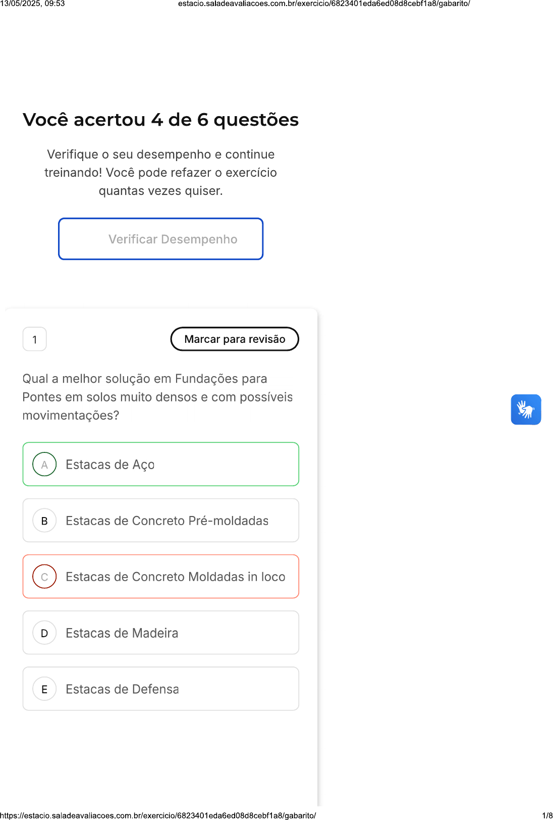 13/05/2025, 09:53 Você acertou 4 de 6 questões Verifique o seu desempenho e continue treinando! Você pode refazer o exercício quantas vezes quiser. Verificar Desempenho 1 Marcar para revisão Qual a melhor solução em Fundações para Pontes em solos muito densos e com possíveis movimentações? A Estacas de Aço B Estacas de Concreto Pré-moldadas C Estacas de Concreto Moldadas in loco D Estacas de Madeira E Estacas de Defensa 1/813/05/2025, 09:53 X Resposta incorreta Opa! A alternativa correta é a letra Lista de exercícios Conteúdo T Sair Gabarito Comentado Em solos muito densos e com possíveis movimentações, as estacas de aço Questão 2 de 6 oferecem, pela sua grande resistência à flexão, a melhor solução em fundação para 1 2 3 4 5 Pontes. 6 Corretas (4) Incorretas (2) Em branco (0) 2 Marcar para revisão Qual a principal restrição quanto ao uso das estacas de madeira em Pontes? Possui pouca resistência a Cargas A Horizontais Possui pouca resistência a variações B excessivas no nível dos corpos hídricos Possui pouca resistência a Cargas C Verticais Possui pouca resistência a Carga de D Vento E Possui pouca resistência a Carga Axial 2/813/05/2025, 09:53 X Resposta incorreta Opa! A alternativa correta é a letra B. Confira o gabarito comentado! Gabarito Comentado As estacas de madeira possuem restrições que tornam desaconselhável a sua utilização na fundação de Pontes devido a sua pouca resistência a variações excessivas no nível dos corpos hídricos. 3 Marcar para revisão Qual a importância das Fundações? Recebem as cargas verticais e A horizontais atuantes na Mesoestrutura, que são provenientes do Tabuleiro recebem as cargas verticais e horizontais atuantes na B Superestrutura, que são provenientes da própria Infraestrutura Recebem as cargas verticais C provenientes apenas da Carga Móvel 3/813/05/2025, 09:53 Recebem as cargas verticais D provenientes apenas do Peso Próprio da Estrutura E Suportam os Aparelhos de Apoio Resposta correta Parabéns, você selecionou a alternativa correta. Confira o gabarito comentado! Gabarito Comentado As Fundações são Importantes, pois recebem as cargas verticais e horizontais atuantes na Mesoestrutura, que são provenientes do Tabuleiro, sendo estas as Cargas Móveis e o peso próprio dos elementos da própria Mesoestrutura. 4 Marcar para revisão que são os Esforços nas Lajes do Tabuleiro? São a combinação de ações previstas A apenas no Projeto de Pontes Rodoviárias. São a combinação de ações previstas B apenas no Projeto de Pontes Ferroviárias 4/813/05/2025, 09:53 São a combinação de ações não C previstas apenas no Projeto de Pontes Ferroviárias São a combinação de ações previstas D no Projeto de Pontes Rodoviárias e Ferroviárias São a combinação de ações não E previstas apenas no Projeto de Pontes Rodoviárias Resposta correta Parabéns, você selecionou a alternativa correta. Confira o gabarito comentado! Gabarito Comentado Os Esforços nas Lajes do Tabuleiro são a combinação de ações previstas no Projeto de Pontes Rodoviárias e Ferroviárias. Os Esforços nas Lajes do Tabuleiro são as ações que atuam sobre as lajes do tabuleiro de uma ponte. Essas ações podem ser de natureza estática ou dinâmica, e podem ser causadas por diversos fatores, como o peso próprio da estrutura, o peso das cargas que trafegam sobre a ponte, o vento, o terremoto, etc. Os Esforços nas Lajes do Tabuleiro são importantes para o projeto de uma ponte, pois eles determinam a resistência necessária da estrutura para suportar as ações que atuarão sobre ela. Os Esforços nas Lajes do Tabuleiro são calculados por meio de métodos de análise estrutural, como o método dos elementos finitos. 5/813/05/2025, 09:53 Os Esforços nas Lajes do Tabuleiro são importantes para garantir a segurança e a estabilidade de uma ponte. 5 Marcar para revisão Podem ser consideradas Ações Excepcionais? A Explosões B Carga dos Veículos C Carga Permanente D Ação do Vento e da Água E Ação do recapeamento asfáltico Resposta correta Parabéns, você selecionou a alternativa correta. Confira o gabarito comentado! Gabarito Comentado As Ações Excepcionais são as que possuem uma curta duração e uma pequena probabilidade da sua ocorrência durante toda vida útil dos elementos construtivos das Lajes do Tabuleiro, mas devem ser previstos no projeto, pois dentre estas ações excepcionais estão o choque 6/813/05/2025, 09:53 stacio.saladeavaliacoes.com.br/exercicio/6823401eda6ed08d8cebf1a8/gabarito/ de objetos móveis, explosões e desastres naturais. 6 Marcar para revisão Quanto aos esforços nas Lajes do Tabuleiro, tratando das Cargas Móveis, os Carros de Passeio pertencem a qual classe? A Classe 12 B Classe 30 C Classe 45 D Classe 60 E Classe 70 Resposta correta Parabéns, você selecionou a alternativa correta. Confira o gabarito comentado! Gabarito Comentado Quanto aos esforços nas Lajes do Tabuleiro, tratando das Cargas Móveis, os Carros de Passeio pertencem à Classe 12? 7/813/05/2025, 09:53 A resposta correta é a alternativa A, pois a Classe 12 é a classe de veículos mais leve, e os Carros de Passeio são veículos leves. 8/8