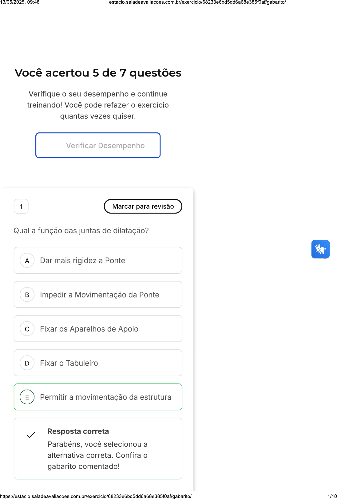 13/05/2025, 09:48 Você acertou 5 de 7 questões Verifique o seu desempenho e continue treinando! Você pode refazer o exercício quantas vezes quiser. Verificar Desempenho 1 Marcar para revisão Qual a função das juntas de dilatação? A Dar mais rigidez a Ponte B Impedir a Movimentação da Ponte C Fixar os Aparelhos de Apoio D Fixar o Tabuleiro E Permitir a movimentação da estrutura Resposta correta Parabéns, você selecionou a alternativa correta. Confira o gabarito comentado! 1/1013/05/2025, 09:48 Gabarito Comentado As juntas de dilatação são aberturas que possuem a função de permitir a movimentação da estrutura, o que reduz tensões indesejáveis que acabam por ocasionar fissuras. 2 Marcar para revisão Em Pontes, adota-se qual peso específico para a Camada de Regularização em Concreto? A B C D E Resposta correta Parabéns, você selecionou a alternativa correta. Confira o gabarito comentado! Gabarito Comentado A Camada de Regularização em Concreto tem peso específico de 2/1013/05/2025, 09:48 3 Marcar para revisão Qual das características apontadas abaixo pertencem as Juntas Denteada? São usadas apenas em pequenas A movimentações com apenas 1 cm Utilizam bloco contínuo e alveolar de B Neoprene Construídas com dois blocos de C concreto de alta resistência Possui Neoprene instalado entre perfis D metálicos Constituída por duas chapas de aço E justapostas instaladas sobre uma organização de encaixe macho-fêmea i Questão não respondida Opa! A alternativa correta é a letra E. Confira o gabarito comentado! Gabarito Comentado As Juntas Denteada são constituídas por duas chapas de aço justapostas instaladas sobre uma organização de encaixe macho- fêmea. As Juntas Denteada são constituídas por duas chapas de aço justapostas instaladas 3/1013/05/2025, 09:48 sobre uma organização de encaixe macho- fêmea. As Juntas Denteada são constituídas por duas chapas de aço justapostas instaladas sobre uma organização de encaixe macho- fêmea. As Juntas Denteada são constituídas por duas chapas de aço justapostas instaladas sobre uma organização de encaixe macho- fêmea. As Juntas Denteada são constituídas por duas chapas de aço justapostas instaladas sobre uma organização de encaixe macho- fêmea. As Juntas Denteada são constituídas por duas chapas de aço justapostas instaladas sobre uma organização de encaixe macho- fêmea. As Juntas Denteada são constituídas por duas chapas de aço justapostas instaladas sobre uma organização de encaixe macho- fêmea. As Juntas Denteada são constituídas por duas chapas de aço justapostas instaladas sobre uma organização de encaixe macho- As Juntas Denteada são constituídas por duas chapas de aço justapostas instaladas sobre uma organização de encaixe macho- fêmea. As Juntas Denteada são constituídas por duas chapas de aço justapostas instaladas sobre uma organização de encaixe macho- fêmea. As Juntas Denteada são constituídas por duas chapas de aço justapostas instaladas sobre uma organização de encaixe macho- fêmea. As Juntas Denteada são constituídas por duas chapas de aço justapostas instaladas 4/1009:48 sobre uma organização de encaixe macho- fêmea. As Juntas Denteada são constituídas por duas chapas de aço justapostas instaladas sobre uma organização de encaixe macho- fêmea. As Juntas Denteada são constituídas por duas chapas de aço justapostas instaladas sobre uma organização de encaixe macho- fêmea. As Juntas Denteada são constituídas por duas chapas de aço justapostas instaladas sobre uma organização de encaixe macho- fêmea. As Juntas Denteada são constituídas por duas chapas de aço justapostas instaladas sobre uma organização de encaixe macho- fêmea. As Juntas Denteada são constituídas por duas chapas de aço justapostas instaladas sobre uma organização de encaixe macho- fêmea. As Juntas Denteada são constituídas por duas chapas de aço justapostas instaladas sobre uma organização de encaixe macho- fêmea. As Juntas Denteada são constituídas por duas chapas de aço justapostas instaladas sobre uma organização de encaixe macho- fêmea. As Juntas Denteada são constituídas por duas chapas de aço justapostas instaladas sobre uma organização de encaixe macho- fêmea. As Juntas Denteada são constituídas por duas chapas de aço justapostas instaladas sobre uma organização de encaixe macho- fêmea As Juntas Denteada são constituídas por duas chapas de aço justapostas instaladas 5/1013/05/2025, 09:48 sobre uma organização de encaixe macho- fêmea. As Juntas Denteada são constituídas por duas chapas de aço justapostas instaladas sobre uma organização de encaixe macho- 4 Marcar para revisão que forma as Ações Permanentes Diretas? Pelo peso próprio dos elementos estruturais e dos elementos A construtivos fixos e outras ações permanentes sobre elas aplicadas Pelo peso próprio dos elementos estruturais e dos elementos B construtivos móveis e outras ações permanentes sobre elas aplicadas Pelo peso próprio dos elementos móveis e dos elementos construtivos C fixos e outras ações permanentes sobre elas aplicadas Pelo peso próprio dos elementos estruturais e dos elementos D construtivos fixos e outras ações variaveis sobre elas aplicadas peso próprio dos elementos estruturais e dos elementos E construtivos móveis e outras ações variaveis sobre elas aplicadas 6/1013/05/2025, 09:48 Resposta correta Parabéns, você selecionou a alternativa correta. Confira o gabarito comentado! Gabarito Comentado As Ações Permanentes Diretas são formadas pelo peso próprio dos elementos estruturais e dos elementos construtivos fixos e outras ações permanentes sobre elas aplicadas. 5 Marcar para revisão Qual a concepção estrutural mais eficiente em Pontes? Lista de exercícios Conteúdo T Sair percurso mais curto sobre a estrutura desde seus pontos de aplicação até a sua fundação Questão 7 de 7 A concepção e