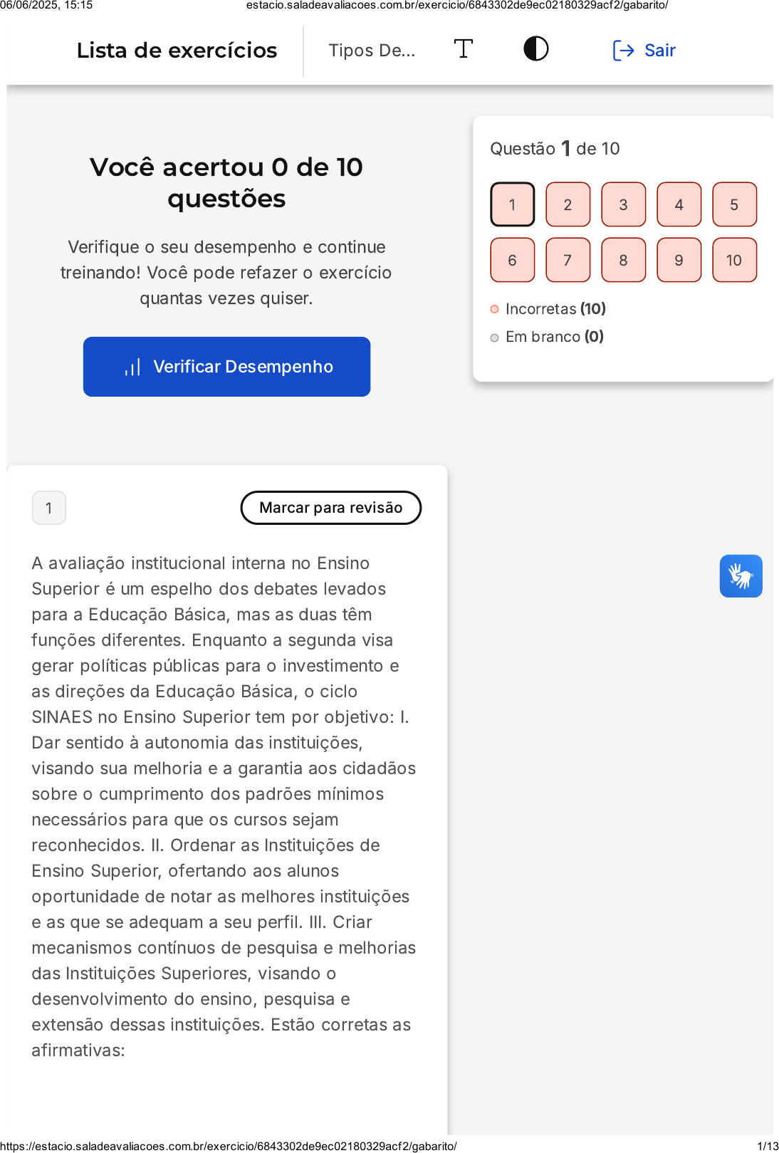Você acertou 0 de 10 questões Verifique o seu desempenho e continue treinando! Você pode refazer o exercício quantas vezes quiser. Verificar Desempenho 1 Marcar para revisão A avaliação institucional interna no Ensino Superior é um espelho dos debates levados para a Educação Básica, mas as duas têm funções diferentes. Enquanto a segunda visa gerar políticas públicas para o investimento e as direções da Educação Básica, o ciclo SINAES no Ensino Superior tem por objetivo: I. Dar sentido à autonomia das instituições, visando sua melhoria e a garantia aos cidadãos sobre o cumprimento dos padrões mínimos necessários para que os cursos sejam reconhecidos. II. Ordenar as Instituições de Ensino Superior, ofertando aos alunos oportunidade de notar as melhores instituições e as que se adequam a seu perfil. III. Criar mecanismos contínuos de pesquisa e melhorias das Instituições Superiores, visando o desenvolvimento do ensino, pesquisa e extensão dessas instituições. Estão corretas as afirmativas: Questão 1 de 10 Incorretas (10) Em branco (0) 1 2 3 4 5 6 7 8 9 10 Lista de exercícios Tipos De… Sair 06/06/2025, 15:15 estacio.saladeavaliacoes.com.br/exercicio/6843302de9ec02180329acf2/gabarito/ https://estacio.saladeavaliacoes.com.br/exercicio/6843302de9ec02180329acf2/gabarito/ 1/13 A B C D E I e II. I e III. II e III. Apenas a afirmativa I. Apenas a afirmativa II. Resposta incorreta Opa! A alternativa correta é a letra B. Confira o gabarito comentado! Gabarito Comentado A resposta certa é: I e III. O ciclo SINAES no Ensino Superior tem por objetivo dar sentido à autonomia das instituições, visando sua melhoria e a garantia aos cidadãos sobre o cumprimento dos padrões mínimos necessários para que os cursos sejam reconhecidos. Além disso, o ciclo SINAES tem por objetivo criar mecanismos contínuos de pesquisa e melhorias das Instituições Superiores, visando o desenvolvimento do ensino, pesquisa e extensão dessas instituições. 2 Marcar para revisão Avaliações de larga escala de desempenho são mecanismos que visam fomentar processos 06/06/2025, 15:15 estacio.saladeavaliacoes.com.br/exercicio/6843302de9ec02180329acf2/gabarito/ https://estacio.saladeavaliacoes.com.br/exercicio/6843302de9ec02180329acf2/gabarito/ 2/13 A B C D E avaliativos para a Educação Nacional, visando: Gerar indicadores que possam ser analisados, comparados e dar base a decisões. Criar um teto de qualidade, apontando que instituições podem ou não continuar, protegendo os brasileiros. Criar um mecanismo de medição e comparação dos estudantes do Brasil e do exterior. Gerar um processo de transformação contínua da educação pelo estudo das fragilidades dos alunos. Criar um mecanismo de fiscalização eficiente das escolas, criando formas de melhoria. Resposta incorreta Opa! A alternativa correta é a letra A. Confira o gabarito comentado! Gabarito Comentado O objetivo das avaliações de larga escala de desempenho é gerar indicadores que possam ser analisados, comparados e que sirvam de base para tomadas de decisões. Essas avaliações são ferramentas importantes para identificar pontos de melhoria, estabelecer metas e direcionar políticas educacionais. Portanto, a alternativa correta é: "Gerar indicadores 06/06/2025, 15:15 estacio.saladeavaliacoes.com.br/exercicio/6843302de9ec02180329acf2/gabarito/ https://estacio.saladeavaliacoes.com.br/exercicio/6843302de9ec02180329acf2/gabarito/ 3/13 A B C D E que possam ser analisados, comparados e dar base a decisões". 3 Marcar para revisão A avaliação institucional interna tem o papel de: Fiscalizar os procedimentos da escola. Organizar a gestão de metas da escola. Autoavaliar os processos em busca de melhorias. Criar ranking de disputas, levando gamificação aos funcionários. Dar suporte às decisões da alta direção. Resposta incorreta Opa! A alternativa correta é a letra C. Confira o gabarito comentado! Gabarito Comentado A avaliação institucional interna é um processo que visa a autoavaliação dos processos da instituição, com o objetivo de identificar pontos de melhoria e implementar ações para aprimorar a qualidade do ensino e da gestão. Portanto, 06/06/2025, 15:15 estacio.saladeavaliacoes.com.br/exercicio/6843302de9ec02180329acf2/gabarito/ https://estacio.saladeavaliacoes.com.br/exercicio/6843302de9ec02180329acf2/gabarito/ 4/13 A B C D E a alternativa correta é a C: "Autoavaliar os processos em busca de melhorias". 4 Marcar para revisão São tipos de avaliação institucional interna: I. Autoavaliação. II. Pesquisas de avaliação institucional. III. Visita de Comissão do MEC. IV. Exames nacionais de desempenho. Estão corretas: I, II e III. I e II. I, III e IV. II, III e IV. Todas as afirmativas. Resposta incorreta Opa! A alternativa correta é a letra B. Confira o gabarito comentado! Gabarito Comentado A resposta certa é: I e II. 06/06/2025, 15:15 estacio.saladeavaliacoes.com.br/exercicio/6843302de9ec02180329acf2/gabarito/ https://estacio.saladeavaliacoes.com.br/exercicio/6843302de9ec02180329acf2/gabarito/ 5/13 A B C D E A autoavaliação e as pesquisas de avaliação institucional são tipos de avaliação institucional interna. 5 Marcar para revisão (Prefeitura de Florianópolis/SC - Supervisor Escolar - 2019) Analise o texto a seguir: A avaliação ___________ apresenta dois objetivos básicos: iluminar o caminho da transformação e permitir que o sujeito, por meio da consciência crítica, imprima uma direção às suas ações nos contextos em que se situa, de acordo com valores que elege e com os quais se compromete no decurso de sua historicidade. Assinale a alternativa que completa corretamente a lacuna do texto: Somatória Meritocrática Emancipatória Classificatória Segregadora Resposta incorreta Opa! A alternativa correta é a letra C. Confira o gabarito comentado! 06/06/2025, 15:15 estacio.saladeavaliacoes.com.br/exercicio/6843302de9ec02180329acf2/gabarito/ https://estaci