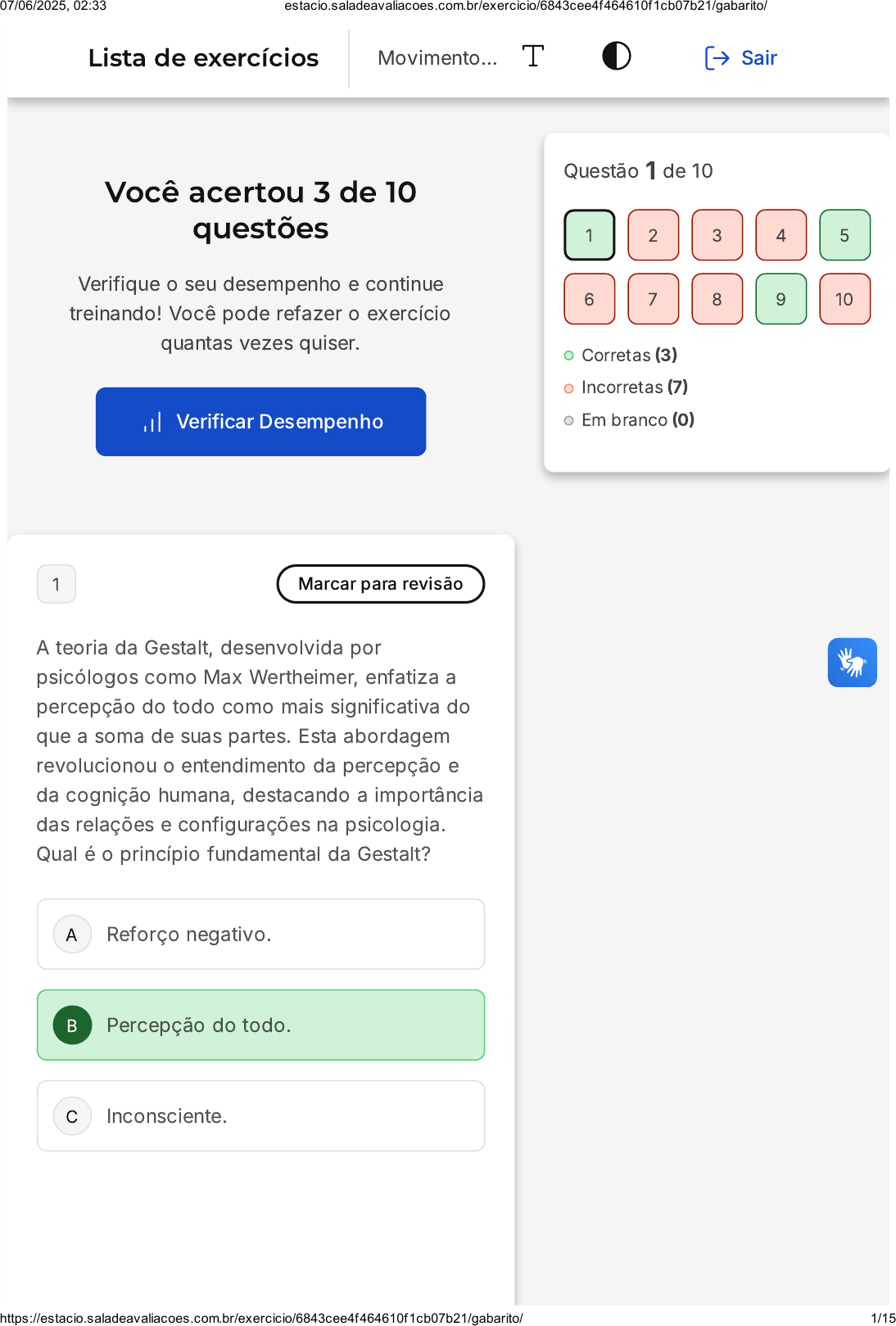 Você acertou 3 de 10 questões Verifique o seu desempenho e continue treinando! Você pode refazer o exercício quantas vezes quiser. Verificar Desempenho A B C 1 Marcar para revisão A teoria da Gestalt, desenvolvida por psicólogos como Max Wertheimer, enfatiza a percepção do todo como mais significativa do que a soma de suas partes. Esta abordagem revolucionou o entendimento da percepção e da cognição humana, destacando a importância das relações e configurações na psicologia. Qual é o princípio fundamental da Gestalt? Reforço negativo. Percepção do todo. Inconsciente. Questão 1 de 10 Corretas (3) Incorretas (7) Em branco (0) 1 2 3 4 5 6 7 8 9 10 Lista de exercícios Movimento… Sair 07/06/2025, 02:33 estacio.saladeavaliacoes.com.br/exercicio/6843cee4f464610f1cb07b21/gabarito/ https://estacio.saladeavaliacoes.com.br/exercicio/6843cee4f464610f1cb07b21/gabarito/ 1/15 D E Condição pré-consciente. Comportamento observável. Resposta correta Parabéns, você selecionou a alternativa correta. Confira o gabarito comentado! Gabarito Comentado A Gestalt, como uma escola de pensamento na psicologia, baseia-se no princípio de que a percepção do todo é mais significativa do que simplesmente a soma de suas partes. Este conceito se diferencia do foco em aspectos como reforço negativo, o inconsciente, condições pré-conscientes ou comportamento observável, todos pertencentes a diferentes teorias ou abordagens psicológicas. 2 Marcar para revisão O Construtivismo, uma abordagem psicológica influente, defende que o conhecimento é construído pelo aprendiz em interação com o ambiente. Esta teoria tem sido fundamental na educação, destacando a importância da experiência ativa do aprendiz na construção do conhecimento. Qual é o princípio chave do Construtivismo na educação? 07/06/2025, 02:33 estacio.saladeavaliacoes.com.br/exercicio/6843cee4f464610f1cb07b21/gabarito/ https://estacio.saladeavaliacoes.com.br/exercicio/6843cee4f464610f1cb07b21/gabarito/ 2/15 A B C D E Aprendizagem passiva. Reforço positivo. Construção ativa do conhecimento. Comportamento observável. Inconsciente. Resposta incorreta Opa! A alternativa correta é a letra C. Confira o gabarito comentado! Gabarito Comentado O Construtivismo se baseia na ideia de que o conhecimento é construído ativamente pelo aprendiz em interação com seu ambiente. Este conceito se diferencia da aprendizagem passiva, reforço positivo, estudo do comportamento observável, ou análise do inconsciente, que são características de outras teorias educacionais ou psicológicas. 3 Marcar para revisão Considerando o contexto do desenvolvimento da inteligência emocional, analise as afirmativas abaixo: 07/06/2025, 02:33 estacio.saladeavaliacoes.com.br/exercicio/6843cee4f464610f1cb07b21/gabarito/ https://estacio.saladeavaliacoes.com.br/exercicio/6843cee4f464610f1cb07b21/gabarito/ 3/15 A B C D E - Afirmativa I: A disciplina focada envolve habilidades como o planejamento, a organização e a execução de tarefas com persistência e resiliência, especialmente diante de distrações. - Afirmativa II: Receber feedback construtivo é fundamental, mas somente se ele vier de fontes com as quais o indivíduo tem forte vínculo emocional. - Afirmativa III: A administração de recursos pessoais, como o tempo e a energia emocional, é essencial para manter o equilíbrio entre as demandas do trabalho e o bem-estar individual. I e II apenas. II e III apenas. I e III apenas. I, II e III apenas. II apenas. Resposta incorreta Opa! A alternativa correta é a letra C. Confira o gabarito comentado! Gabarito Comentado Afirmativa I está correta, pois a disciplina focada envolve habilidades de planejamento e execução direcionada para alcançar metas. Afirmativa II está incorreta, pois o valor do feedback depende de seu conteúdo construtivo e relevância, não do vínculo emocional. Afirmativa III está 07/06/2025, 02:33 estacio.saladeavaliacoes.com.br/exercicio/6843cee4f464610f1cb07b21/gabarito/ https://estacio.saladeavaliacoes.com.br/exercicio/6843cee4f464610f1cb07b21/gabarito/ 4/15 A B C D E correta, pois a gestão de recursos pessoais é crucial para manter o bem-estar e o equilíbrio. 4 Marcar para revisão O sistema de crenças é mantido pelo senso comum, do lado oposto está a ciência. Sobre a perspectiva e Zeitgeist, analise as asserções I e II. I. Em ciências deve-se achar e deduzir antes de observar e encontrar as evidências. PORQUE II. É deduzindo que se constrói a ciência, tudo necessita ser investigado e corroborado. Marque a alternativa que apresenta a relação correta entre as asserções I e II. As asserções I e II são verdadeiras e a asserção II é uma justificativa para a asserção I. As asserções I e II são verdadeiras, mas a asserção II não é uma justificativa para a asserção I. A asserção I é verdadeira e a asserção II é falsa. A asserção I é falsa e a asserção II é verdadeira. As asserções I e II são falsas. 07/06/2025, 02:33 estacio.saladeavaliacoes.com.br/exercicio/6843cee4f464610f1cb07b21/gabarito/ https://estacio.saladeavaliacoes.com.br/exercicio/6843cee4f464610f1cb07b21/gabarito/ 5/15 Resposta incorreta Opa! A alternativa correta é a letra E. Confira o gabarito comentado! Gabarito Comentado As asserções I e II são falsas. A ciência não se baseia em suposições ou deduções sem a devida observação e evidência. O método científico requer que as hipóteses sejam testadas e validadas por meio de experimentos e observações antes de serem aceitas. A asserção I está incorreta ao afirmar que em ciências deve-se achar e deduzir antes de observar e encontrar as evidências. A asserção II também está equivocada ao afirmar que é deduzindo que se constrói a ciência. Na verdade, a ciência é construída através de um processo rigoroso de investigação e corroboração de evidências, não apenas por dedução. 5 Marcar para revisão Amanda trabalha em