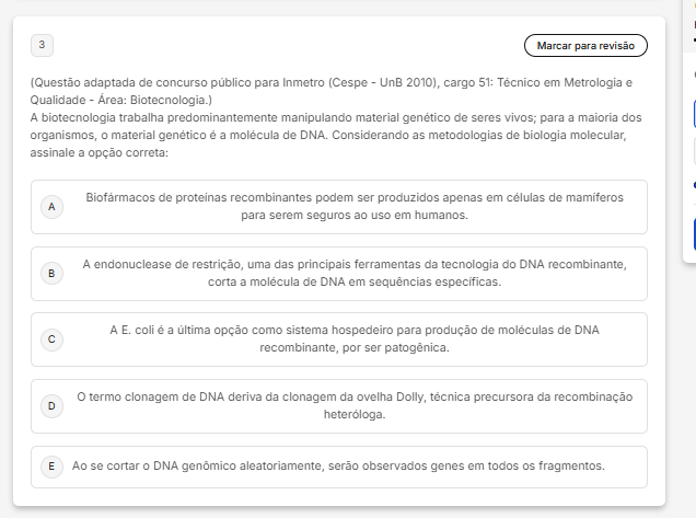 3 Marcar para revisão (Questão adaptada de concurso público para Inmetro (Cespe - UnB 2010), cargo 51: Técnico em Metrologia e Qualidade - Area: Biotecnologia.) A biotecnologia trabalha predominantemente manipulando material genético de seres vivos; para a maioria dos organismos, material genético é a de Considerando as metodologias de biologia molecular, assinale a opção correta: de proteinas recombinantes podem ser produzidos apenas em células de mamiferos A para serem seguros ao uso em A endonuclease de restrição, uma das principais ferramentas da tecnologia do DNA recombinante, B corta a de DNA em sequências específicas. A E. coli é a opção como sistema hospedeiro para produção de de DNA C recombinante, por ser patogênica. termo clonagem de DNA deriva da clonagem da ovelha Dolly, técnica precursora da recombinação D E Ao se cortar DNA genômico aleatoriamente, serão observados genes em todos os fragmentos.