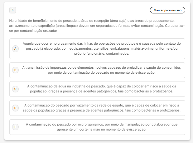 6 Marcar para revisão Na unidade de beneficiamento de pescado, a área de recepção (área suja) e as áreas de processamento, armazenamento e expedição (áreas limpas) devem ser separadas de forma a evitar contaminação. Caracteriza- se por contaminação cruzada: Aquela que ocorre no cruzamento das linhas de operações de produtos e é causada pelo contato do A pescado já elaborado, com equipamentos, utensilios, embalagens, matéria-prima, uniforme e/ou próprio funcionário, A transmissão de impurezas ou de elementos nocivos capazes de prejudicar a saúde do consumidor, B por meio da contaminação do pescado no momento da evisceração. A contaminação da água na indústria de pescado, que é capaz de colocar em risco a saúde da população, graças à presença de agentes patogênicos, tais como bactérias e protozoários. A contaminação do pescado por vazamento da rede de esgoto, que é capaz de colocar em risco a D saúde da população graças à presença de agentes patogênicos, tais como bactérias e protozoários. A contaminação do pescado por microrganismos, por meio da manipulação por colaborador que E apresente um corte na mão no momento da evisceração.