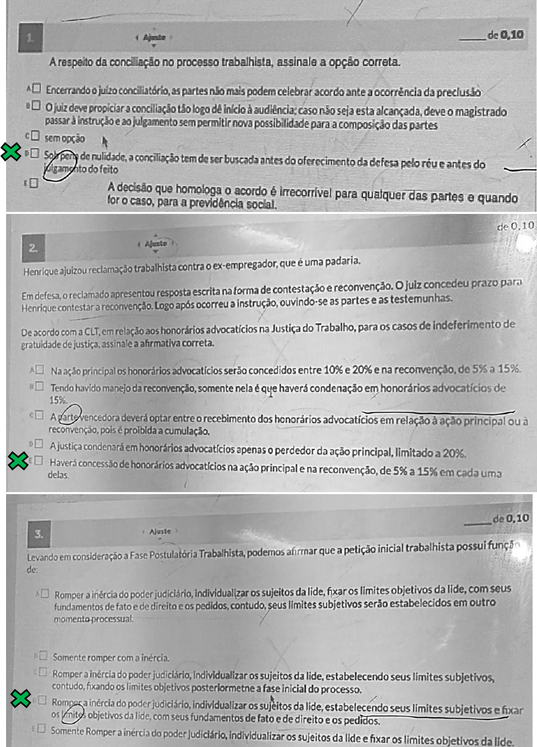 de 0,10 A respeito da conciliação no processo trabalhista, assinale a opção correta. A Encerrando 0 conciliatório, as partes não mais podem celebrar acordo ante a ocorrência da preclusão juiz deve propiciar conciliação tão logo início à audiência: caso não seja esta deve magistrado passar à instrução e 30 julgamento sem permitir nova possibilidade para a composição das partes semopção Sob de nulidade, a conciliação tem de ser buscada antes do oferecimento da defesa pelo réu e antes do do feito for o caso, para a previdência social. A decisão que homologa acordo é irrecorrivel para qualquer das partes e quando de 0,10 2. Henrique ajuizou reclamação trabalhista contra ex-empregador, que é uma padaria. Em defesa, reclamado apresentou resposta escrita na forma de contestação e reconvenção. o juiz concedeu prazo para Henrique contestar a reconvenção. Logo após ocorreu a instrução, ouvindo-se as partes e as testemunhas. De acordo com a em relação aos honorários advocatícios na Justiça do Trabalho, para os casos de indeferimento de gratuidade de justiça, assinale a afirmativa correta. Na ação principal os honorários advocatícios serão concedidos entre 10% e 20% e na reconvenção, de 5% a 15% Tendo havido manejo da reconvenção, somente nela é que haverá condenação em honorários advocatícios de 15% A deverá optar entre o recebimento dos honorários advocatícios em relação à ação principal ou à reconvenção, pois é proibida a cumulação. A justiça condenará em honorários advocatícios apenas perdedor da ação principal, limitado a Haverá concessão de honorários advocatícios na ação principal e na reconvenção, de 5% a 15% em cada uma delas de 0,10 3. Ajuste Levando em consideração a Fase Postulatória Trabalhista, podemos afirmar que a petição inicial trabalhista possui de: Romper a inércia do poder judiciário, individualizar os sujeitos da lide, fixar os limites objetivos da lide, com seus fundamentos de fato e de direito e os pedidos, contudo, seus limites subjetivos serão estabelecidos em outro momento Somente romper com a Romper a inércia do poder judiciário, individualizar os sujeitos da lide, estabelecendo seus limites subjetivos, contudo, fixando os limites objetivos posteriormetne a fase inicial do processo. a inércia do poder judiciário, individualizar os da lide, estabelecendo seus limites subjetivos e fixar os objetivos da com seus fundamentos de fato e de direito e os pedidos. Somente Romper a inércia do poder individualizar os sujeitos da lide e fixar os limites objetivos da lide.de 0,10 4. Ajuste Conforme disposto na CLT, o recurso cabível para instancia superior, das decisões definitivas ou terminativas das Varas, juízos e Regionais, em processo de sua competência originária é: Recurso Ordinário Embargos de execução Recurso de Revista Agravo a petição Agravo de instrumento de prazo para apresentação de Contestação na Justiça do Trabalho será de: 20 minutos após leitura da reclamação 15 a contar da intimação 15 dias corridos a contar da audiência de 10 dias corridos a contar da citação 120 a contar da ocorrência do fato. 6. Ajuste No processo do trabalho, o Juiz deverá propor a conciliação: A após a oitiva das partes e quando do encerramento da instrução após a apresentação da defesa e ao término da instrução D na abertura da audiência (antes da apresentação da defesa) e renovadas após as razões finais. somente quando houver requerimento das E somente quando valor da causa permitir. de 7. Ajuste No que se refere ao tema dos no Direito Processual do Trabalho, assinale a alternativa correta. Como os embargos de declaração não interrompem o prazo para interposição de outros recursos, trata-se de de exceção ao da singularidade quando da oposição destes. Cabe recurso ordinário para STF das decisões definitivas proferidas pelos Tribunais do Trabalho em processos de sua competência originária, no prazo legal, contado da publicação do acórdão ou de sua conclusão no órgão oficial o recurso cabível contra as sentenças proferidas nos dissídios de procedimento sumário, considerando que o valor da causa seja igual ou inferior a dois é agravo de petição. dele o recurso ordinário é o mais amplo dos expedientes recursais no processo de conhecimento, porquanto por meio é possível a impugnação das decisões definitivas ou terminativas proferidas em dissídios de admissibilidade do Recurso Ordinário é realizado pelo juízo ad quem, ou seja, pelo relator node 10 Ajuste Quais os elementos que devem compor a reclamação trabalhista: Designação do juízo, qualificação das partes, breve exposição dos que deverá ser certo determinado e com indiciação de valor, data e assinatura do reclamante ou de seu representante. Designação do juízo, qualificação das partes, pedido, data e assinatura do reclamante ou de seu representante. Qualificação das partes, breve exposição dos fatos, pedidos e Qualificação das partes, breve exposição dos fatos e pedidos. Breve exposição dos fatos, porque no processo do trabalho pauta-se pelo principio da de 0,10 9. Karina Bastos, conquistou seu primeiro cliente trabalhista, após obter a certificação profissional com a aprovação na prova da OAB. Ocorre que durante a Faculdade Karina nunca se empenhou em aprender Direito e Processo do Trabalho. pois dizia que seria profissional das forças policiais. Após 03 concursos sem aprovação, decidiu advogar para pagar os cursos e inscrições para tão sonhado concurso. Ao elaborar a Reclamação Trabalhista, Karina fez pedidos quanto ao pagamento de verbas rescisórias e adicional de incidente sobre todo o período laboral de 03 anos, tendo em vista que o Reclamante tinha a função de Eletricista e trabalhava com alta tensão em subestação de energia elétrica. Contudo, embora o Reclamante fizesse e recebesse em seu contracheque horas ext