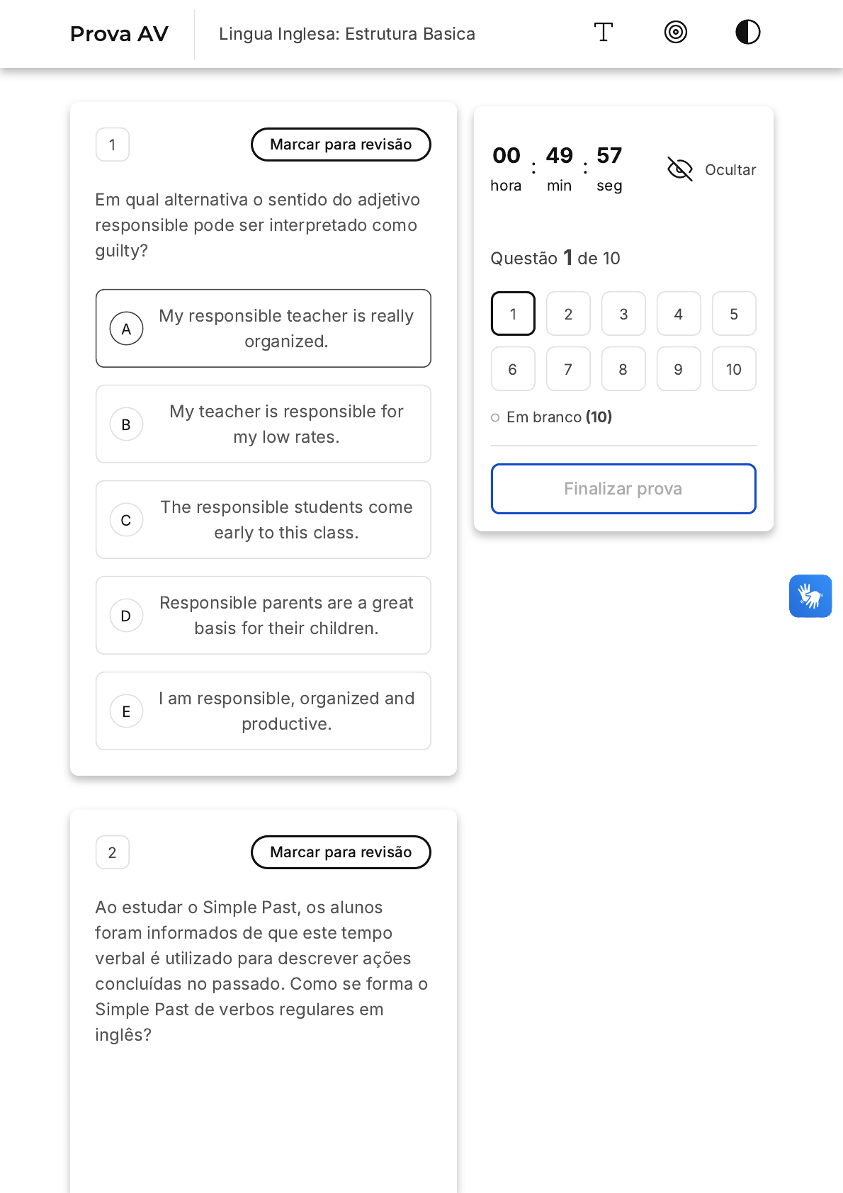 A B C D E 1 Marcar para revisão Em qual alternativa o sentido do adjetivo responsible pode ser interpretado como guilty? My responsible teacher is really organized. My teacher is responsible for my low rates. The responsible students come early to this class. Responsible parents are a great basis for their children. I am responsible, organized and productive. 2 Marcar para revisão Ao estudar o Simple Past, os alunos foram informados de que este tempo verbal é utilizado para descrever ações concluídas no passado. Como se forma o Simple Past de verbos regulares em inglês? 00 hora : 49 min : 57 seg Ocultar Questão 1 de 10 Em branco (10) Finalizar prova 1 2 3 4 5 6 7 8 9 10 Prova AV Lingua Inglesa: Estrutura Basica A B C D E A B C Adiciona-se 'ing' ao final do verbo. Mantém-se o verbo na forma base. Adiciona-se 's' ou 'es' ao final do verbo. Adiciona-se 'ed' ao final do verbo. Usa-se o verbo no infinitivo com 'to'. 3 Marcar para revisão Ao redigir um essay, devemos ter em mente: Que deve ser escrito de forma poética. A estrutura introduction- development-conclusion, conectando os parágrafos. A quem ele irá atingir e o que ele tem a oferecer para a humanidade, não se importando com a forma. D E A B C D E A gramática deve ser perfeita, não se importando tanto com o conteúdo. Que deve oferecer ao leitor uma história com personagens e um cenário. 4 Marcar para revisão There are certain tips you can resort to whenever writing/ expanding your paragraph. What is important to develop your paragraph? Use examples and explain them so that the reader understands the fact that they are there and their connection to the thesis statement The thesis statement and the topic sentence are the same Avoid evidence when giving opinions The concluding paragraph should include new information Paragraphs do not need to be connected to the Topic Sentence A B C D E A B 5 Marcar para revisão Indique qual frase está com a concordância errada: No money is needed. Nobody arrive late at my class. No one is accepted here. Nobody leaves the room. No one is needed. 6 Marcar para revisão Understanding the components of a sentence is fundamental in language comprehension. One key element is the predicate, which describes the action performed by the subject. Identifying predicates helps in analyzing sentence structure and meaning. One of the sentences below presents, in its highlighted portion, a predicate. Which sentence would that be? I go to church regularly. Regularly, the whole class was absent. C D E A B C D E The student completed the exercises at home. The student completed the exercises at home. We walked the guests to the door. 7 Marcar para revisão Qual alternativa apresenta uso correto de adjetivo com sufixo -ed: I felt so embarrassed, because my mother was telling stories about me. My mother told many embarrased stories about my childhood to my friends. I could not sleep last night, because I had watched a terrified movie. The movie was so terrified that my friends could not sleep. We are extremely happy, once we have amazed results. 8 Marcar para revisão A B C D E A B C Em relação ao emprego dos coletivos, identifique a opção que não apresenta um exemplo de coletivo: I was amazed by that choir. I love your band. I saw a mob coming down here. Lions are big animals. There is nothing more beatiful than a flock of birds. 9 Marcar para revisão Sofia está aprendendo sobre tempos verbais em inglês. Ela deseja descrever uma ação que estava ocorrendo por um período antes de um certo ponto no passado. Qual é a maneira correta de Sofia expressar no tempo correto? I had been reading the book before the lights went out. I was reading the book before the lights went out. I have been reading the book before the lights went out. D E A B C D E I read the book before the lights went out. I will have been reading the book before the lights went out. 10 Marcar para revisão Em relação ao uso do quantificador much em sentenças afirmativas, identifique a alternativa incorreta: There is so much water here. There is very much water here. There is too much water here. There is much water here. There is really too much water.