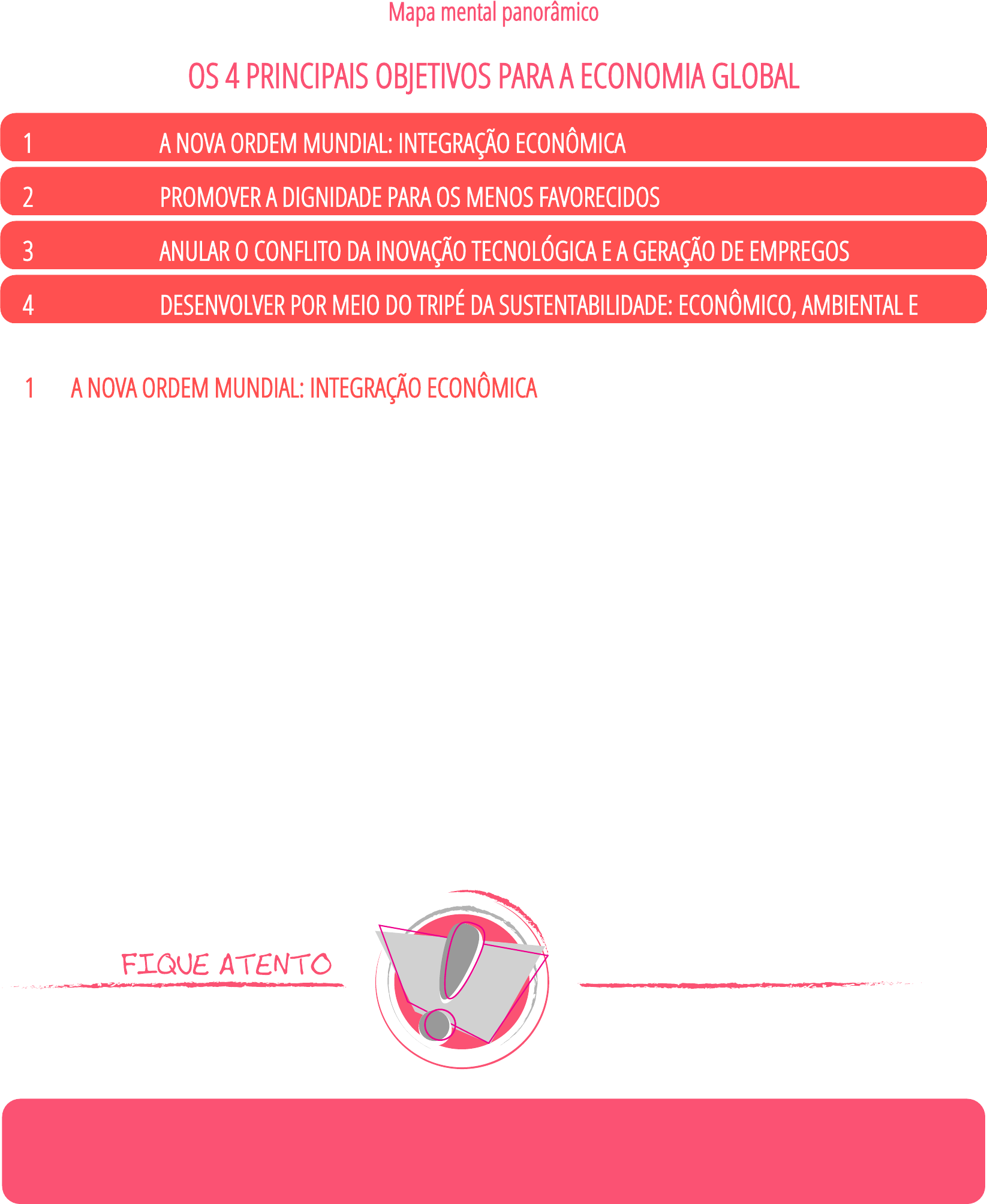 Mapa mental panorâmico OS 4 PRINCIPAIS OBJETIVOS PARA A ECONOMIA GLOBAL 1 A NOVA ORDEM MUNDIAL: INTEGRAÇÃO ECONÔMICA 2 PROMOVER A DIGNIDADE PARA OS MENOS FAVORECIDOS 3 ANULAR O CONFLITO DA INOVAÇÃO TECNOLÓGICA E A GERAÇÃO DE EMPREGOS 4 DESENVOLVER POR MEIO DO TRIPÉ DA SUSTENTABILIDADE: ECONÔMICO, AMBIENTAL E 1 A NOVA ORDEM MUNDIAL: INTEGRAÇÃO ECONÔMICA A nova ordem mundial, fundamentada na constituição de blocos econômicos, não está devidamente consolidada. Os problemas enfrentados pelas nações em constituírem parcerias, de ordem econômica, com outras, são de grande magnitude. Primeiramente, por divergências de interesses das nações e por ausência de solidariedade por parte das sociedades desenvolvidas. Segundo, por grande distinção estrutural, seja no âmbito econômico, de magnitude social ou de características políticas. Há quem interpreta a nova ordem mundial da “Geopolítica a Geoeconomia” (LUTTWAK apud VESENTINI, 2012, p. 31). Segundo o autor, as disputas ideológicas, ocorridas pela Guerra Fria, lideradas pelas superpotências, até o final dos anos 1980, alicerçadas pelo poderio bélico, deixaram de ser o principal instrumento para a hegemonia mundial. A lógica bélica dá lugar à lógica econômica. Há uma grande diferença em termos de poder de “fogo”, isto é, o poder bélico exercia, naquela época, um poder mais forte do que a Geoeconomia. Hoje, há uma pulverização do poder entre os agentes econômicos, por meio da internacionalização das organizações e a inovação tecnológica da informação. No princípio do século passado, os Estados Unidos da América detinham a hegemonia mundial. Os anos 20 foram conhecidos como os anos felizes norte-americanos. Naquela oportunidade, a ordem mundial era unipolar (ROSSETTI, 1997). Com a crise deflagrada com a quebra da Bolsa de Nova Iorque, em 29 de outubro de 1929, a situação mudou. Essa data ficou marcada na História como a Terça-feira Negra; o dia em que ocorreu o Crash da Bolsa de Nova Iorque. O pânico na Bolsa foi gigantesco. “O pânico tomou conta dos investidores e mais de 15,6 milhões de ações foram vendidas até o final do dia” (O Estado de S. Paulo) Fonte: Crash de 1929 O Crash de 1929 levou a Economia norte-americana a uma profunda crise que puxou a Economia mundial pelos anos 30: A Grande Depressão dos anos trinta. Crise profunda que foi seguida pela Segunda Guerra Mundial. De uma hegemonia econômica mundial dos EUA, a ordem mundial passou a ser, no Pós-guerra, bipolar. A Guerra Fria, orientada por ideais antagônicos e liderados pelas superpotências, EUA (Estados Unidos da América) e URSS (União das Repúblicas Socialistas Soviéticas) perdurou até o final dos anos 80, do século passado. Como as disputas ideológicas não trouxeram grandes benefícios para a sociedade mundial, o movimento perdeu força; e, no início dos anos 90, ocorreram os primeiros sinais da atual ordem mundial. Centrada na constituição de Blocos Econômicos, a nova ordem mundial estabeleceu-se, desde o início, com o fim da integralização econômica. A não consolidação, ainda, dessa nova ordem mundial estabelece como princípio o não atendimento às necessidades de proporcionar a prosperidade universal. A perda de soberania nacional, sobretudo, em momentos de crise, tem gerado insatisfação por parte das Economias desenvolvidas, por estarem atreladas às estruturas econômicas distintas; e, muitas vezes, com sérios problemas macroeconômicos. Um exemplo é a Grécia, com grandes problemas estruturais, participando da Zona do Euro com a Alemanha, a Locomotiva Produtiva Europeia. Outros fatos, não menos importantes, dizem respeito à saída da Inglaterra da União Europeia e dos Estados Unidos da América, do Acordo Transpacífico, a maior Zona de Livre Comércio constituída no planeta. As incertezas quanto ao futuro dos Blocos Econômicos têm gerado uma certa insegurança para as nações mais dependentes. As incertezas geram uma série de instabilidades no mercado mundial; e, consequentemente, não conduz a um dos objetivos propostos, com a mundialização comercial: Promover uma vida com dignidade para os menos favorecidos. O desenvolvimento econômico não tem chegado aos países pobres, sobretudo aos do Continente Africano. O mesmo não acontece com alguns países centro-americanos. Assim, um problema de ordem mundial acarreta em outro, de igual magnitude, que você verá a seguir. 2 PROMOVER A DIGNIDADE PARA OS MENOS FAVORECIDOS Um outro problema que a sociedade mundial enfrenta diz respeito, segundo o Professor Rossetti (1997), à Universalização do Desenvolvimento. Esse desafio, enumerado pelo Professor, está relacionado, diretamente, à promoção da dignidade humana; inclusive daqueles esquecidos, graças ao egoísmo das sociedades ricas. Para promover a dignidade humana, não basta gerar crescimento econômico; mas, necessário se faz viabilizar o desenvolvimento econômico e social. Essa promoção vai além do conceito tradicional de crescimento econômico, indicado em atributos quantitativos. Para agregar aos aspectos quantitativos, são necessárias algumas condicionantes de ordem qualitativa. Para atingir graus satisfatórios de desenvolvimento econômico e social, é necessário que se gere crescimento do Produto Interno Bruto. Porém, esse crescimento não, necessariamente, irá proporcionar desenvolvimento. Há nações ricas de um povo pobre. Isso leva a crer na má distribuição da riqueza, em que a concentração da renda proporciona benefícios para uma minoria em detrimento de uma grande parte da sociedade. Resultando, assim, em uma exclusão social; e, consequentemente, em perda da dignidade humana. Kuznets (citado por GREMAUD, 2004, p. 485), “conceitua crescimento econômico como o aumento contínuo do Produto Interno Bruto, em termos globais e per capita, ao longo do tempo”. Uma condição necessária para se atingir o desenvolvimento
