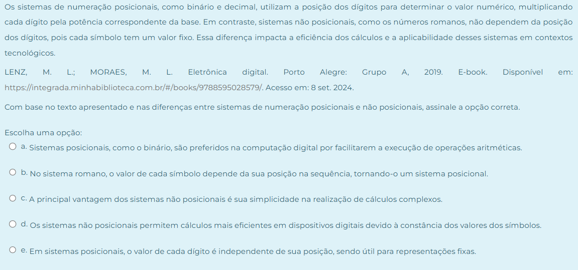 Os sistemas de numeração posicionais, como binário e decimal, utilizam a posição dos dígitos para determinar valor numérico, multiplicando cada dígito pela potência correspondente da base. Em contraste, sistemas não posicionais, como os números romanos, não dependem da posição dos dígitos, pois cada símbolo tem um valor fixo. Essa diferença impacta a eficiência dos cálculos e a aplicabilidade desses sistemas em contextos tecnológicos. LENZ, M. L.; MORAES, M. L. Eletrônica digital. Porto Alegre: Grupo A, 2019. E-book. Disponível em: Acesso em: 8 set. 2024. Com base no texto apresentado e nas diferenças entre sistemas de numeração posicionais e não posicionais, assinale a opção correta. Escolha uma opção: a. Sistemas posicionais, como binário, são preferidos na computação digital por facilitarem a execução de operações aritméticas. b. No sistema romano, valor de cada símbolo depende da sua posição na sequência, tornando-o um sistema posicional. C. A principal vantagem dos sistemas não posicionais é sua simplicidade na realização de cálculos complexos. d. Os sistemas não posicionais permitem cálculos mais eficientes em dispositivos digitais devido à constância dos valores dos e. Em sistemas posicionais, valor de cada dígito é independente de sua posição, sendo útil para representações fixas.