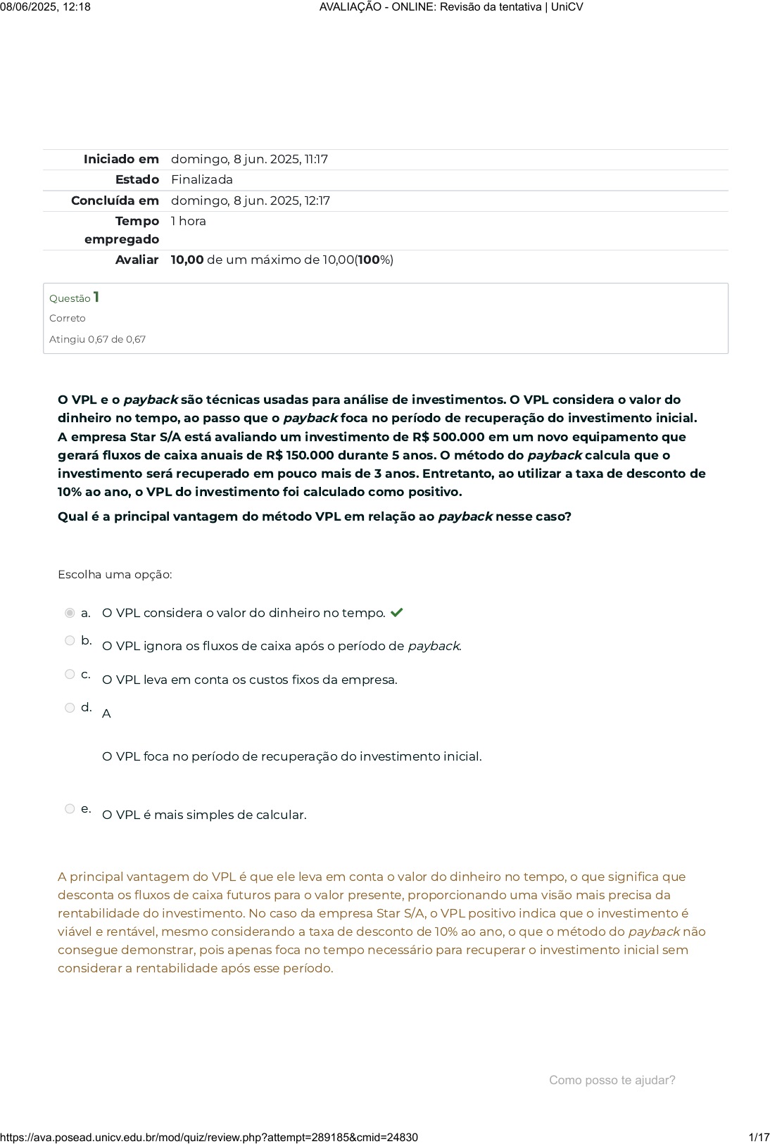 Iniciado em domingo, 8 jun. 2025, 11:17 Estado Finalizada Concluída em domingo, 8 jun. 2025, 12:17 Tempo empregado 1 hora Avaliar 10,00 de um máximo de 10,00(100%) Questão 1 Correto Atingiu 0,67 de 0,67 Escolha uma opção: O VPL e o payback são técnicas usadas para análise de investimentos. O VPL considera o valor do dinheiro no tempo, ao passo que o payback foca no período de recuperação do investimento inicial. A empresa Star S/A está avaliando um investimento de R$ 500.000 em um novo equipamento que gerará fluxos de caixa anuais de R$ 150.000 durante 5 anos. O método do payback calcula que o investimento será recuperado em pouco mais de 3 anos. Entretanto, ao utilizar a taxa de desconto de 10% ao ano, o VPL do investimento foi calculado como positivo. Qual é a principal vantagem do método VPL em relação ao payback nesse caso? a. O VPL considera o valor do dinheiro no tempo. b. O VPL ignora os fluxos de caixa após o período de payback. c. O VPL leva em conta os custos fixos da empresa. d. A O VPL foca no período de recuperação do investimento inicial. e. O VPL é mais simples de calcular. A principal vantagem do VPL é que ele leva em conta o valor do dinheiro no tempo, o que significa que desconta os fluxos de caixa futuros para o valor presente, proporcionando uma visão mais precisa da rentabilidade do investimento. No caso da empresa Star S/A, o VPL positivo indica que o investimento é viável e rentável, mesmo considerando a taxa de desconto de 10% ao ano, o que o método do payback não consegue demonstrar, pois apenas foca no tempo necessário para recuperar o investimento inicial sem considerar a rentabilidade após esse período. Como posso te ajudar? 08/06/2025, 12:18 AVALIAÇÃO - ONLINE: Revisão da tentativa | UniCV https://ava.posead.unicv.edu.br/mod/quiz/review.php?attempt=289185&cmid=24830 1/17 Questão 2 Correto Atingiu 0,66 de 0,66 Escolha uma opção: As medidas de lucratividade provavelmente são os indicadores mais conhecidos e amplamente utilizados pelos analistas e gestores. Esses indicadores são destinados a medir a eficiência de uma empresa em utilizar seu ativo e administrar suas operações. Uma dessas medidas, o ROE, tem três determinantes e eles se caracterizam pelos seguintes itens: lucros que se obtém de cada real de faturamento; vendas que são geradas com cada real de ativo aplicado; e montante de capital próprio utilizado para financiar o ativo. Assinale a alternativa que sintetiza essas características mencionadas. a. Margem de lucro, giro do ativo e fluxo de caixa. b. Margem de lucro, giro do ativo e alavancagem financeira. c. Margem de lucro, fluxo de caixa e liquidez corrente. d. Margem de lucro, liquidez corrente e alavancagem financeira. e. Fluxo de caixa, giro do ativo e alavancagem financeira. Os três determinantes são: margem de lucro (mede percentual do lucro obtido), giro do ativo (quanto a empresa vendeu em um período) e alavancagem financeira (usada para multiplicar a rentabilidade por meio de endividamento). O fluxo de caixa se refere à diferença entre a quantidade de dinheiro que entrou e a quantidade que saiu. A liquidez corrente, por sua vez, é um índice que demonstra a capacidade da empresa de pagar suas contas de curto prazo, sem grandes comprometimentos. Como posso te ajudar? 08/06/2025, 12:18 AVALIAÇÃO - ONLINE: Revisão da tentativa | UniCV https://ava.posead.unicv.edu.br/mod/quiz/review.php?attempt=289185&cmid=24830 2/17 Questão 3 Correto Atingiu 0,67 de 0,67 Escolha uma opção: O retorno sobre o capital próprio, mais conhecido pela sigla ROE (Return on Equity), mensura a taxa de retorno que é alcançada no investimento feito pelos acionistas ordinários na organização. Acionistas ordinários são titulares de ações que lhes garantem direito de voto nas assembleias de acionistas. O ROE se caracteriza por ser considerado, por investidores e gestores, a medida mais popular de desempenho financeiro existente. Com os conhecimentos adquiridos pela leitura da unidade, assinale a alternativa correta entre as que seguem. a. O ROE deve evidenciar resultado menor pois representa menos gastos aos acionistas. b. Quanto mais alto for o ROE, melhor para os acionistas. Quanto mais alto for o ROE, melhor para os acionistas. O ROE igual a zero, por conferir igualdade de oportunidade aos acionistas é inviável matematicamente. Com relação ao ROE apresentando resultado menor por significar menor custo aos acionistas, esta hipótese não é possível também, pois para estes quanto mais alto esse retorno, melhor. O ROE não é uma combinação de ROA com índice Dupont, mas este sim é uma junção de ROE e ROA. O ativo total da empresa é base para se calcular o ROA, que apresenta como fórmula: Lucro líquido/ativo = ROA. c. O ativo total da empresa analisada é a base para o cálculo do ROE. d. O ROE é uma combinação de ROA com índice Dupont. O ROE é uma combinação de ROA com índice Dupont. e. O ROE deve ser igual a zero, pois confere igualdade de oportunidade aos acionistas. Quanto mais alto for o ROE, melhor para os acionistas. O ROE igual a zero, por conferir igualdade de oportunidade aos acionistas é inviável matematicamente. Com relação ao ROE apresentando resultado menor por significar menor custo aos acionistas, esta hipótese não é possível também, pois para estes quanto mais alto esse retorno, melhor. O ROE não é uma combinação de ROA com índice Dupont, mas este sim é uma junção de ROE e ROA. O ativo total da empresa é base para se calcular o ROA, que apresenta como fórmula: Lucro líquido/ativo = ROA. Como posso te ajudar? 08/06/2025, 12:18 AVALIAÇÃO - ONLINE: Revisão da tentativa | UniCV https://ava.posead.unicv.edu.br/mod/quiz/review.php?attempt=289185&cmid=24830 3/17 Questão 4 Correto Atingiu 0,67 de 0,67 Escolha uma opção: Na avaliação da necessidade de capital de giro (NCG), é preciso levar em conta a existência de variações, e estas devem ser 