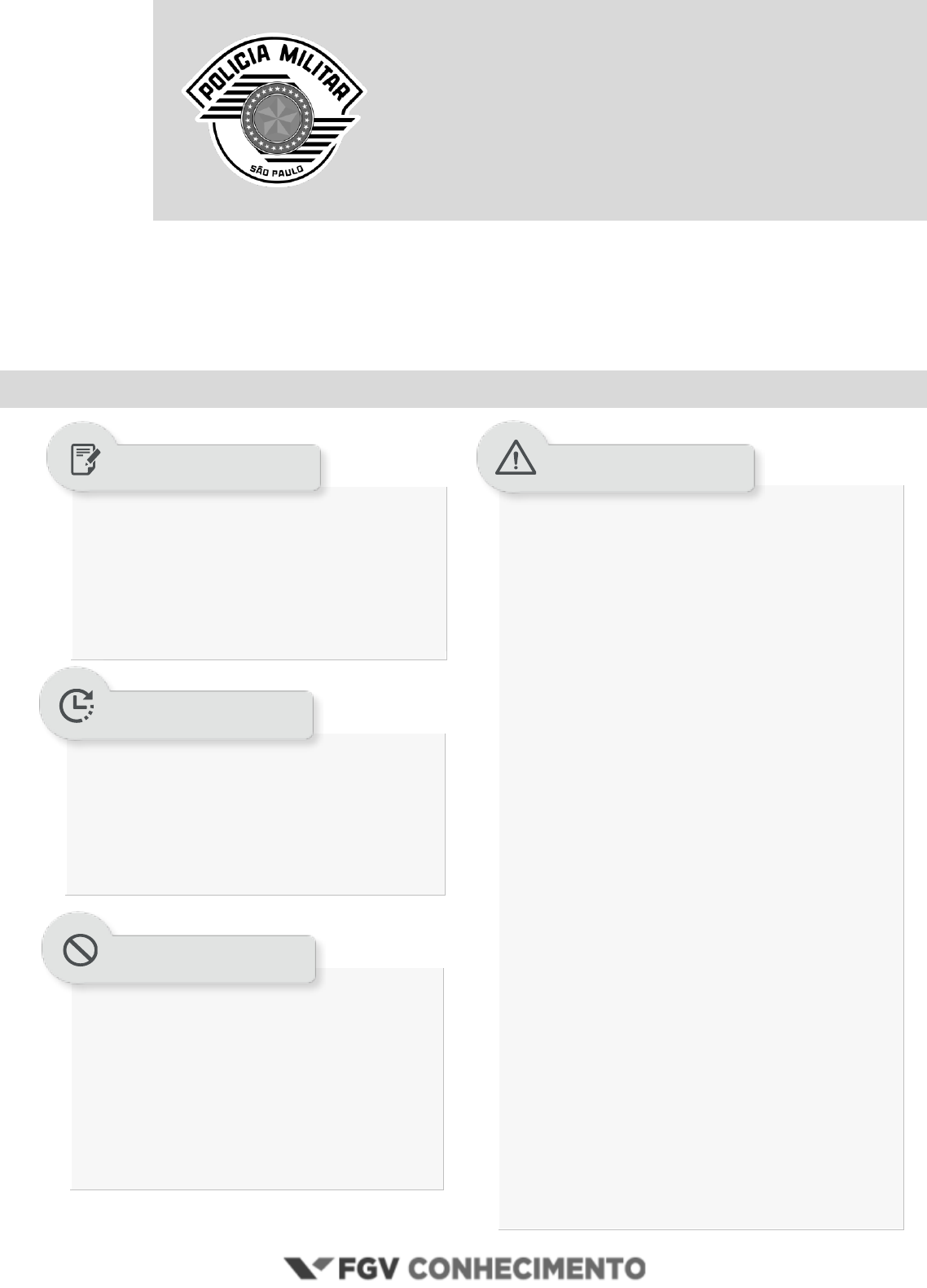 SECRETARIA DA SEGURANÇA PÚBLICA POLÍCIA MILITAR DO ESTADO DE SÃO PAULO PROVA OBJETIVA E REDAÇÃO – TARDE SOLDADO PM DE 2ª CLASSE NÍVEL MÉDIO TIPO 2 – VERDE Atenção: a frase a seguir deverá ser transcrita no espaço reservado da sua folha de respostas, com sua caligrafia usual, considerando as letras maiúsculas e minúsculas. Nenhuma forma de vida merece mais ou menos respeito do que outra. • Além deste caderno contendo 60 (sessenta) questões objetivas e 1 (uma) Redação, você receberá do fiscal de prova a folha de textos definitivos e a folha de respostas; • As questões objetivas têm 5 (cinco) opções de resposta (A, B, C, D e E) e somente uma delas está correta. • • Verifique se seu caderno de questões está completo, sem repetição de questões ou falhas. Caso contrário, notifique imediatamente o fiscal da sala, para que sejam tomadas as devidas providências; • Confira seus dados pessoais, especialmente nome, número de inscrição e documento de identidade e leia atentamente as instruções para preencher a folha de respostas e a folha de textos definitivos; • Para o preenchimento da folha de respostas e da folha de textos definitivos, use somente caneta esferográfica, fabricada em material transparente, com tinta preta ou azul; • Assine seu nome apenas no(s) espaço(s) reservado(s) na folha de respostas e na folha de textos definitivos; • Confira seu cargo, cor e tipo do caderno de questões. Caso tenha recebido caderno de cargo ou cor ou tipo diferente do impresso em sua folha de respostas, o fiscal deve ser obrigatoriamente informado para o devido registro na ata da sala; • Reserve tempo suficiente para o preenchimento da sua folha de respostas e da sua folha de textos definitivos. O preenchimento é de sua responsabilidade e não será permitida a troca da folha de respostas e da folha de textos definitivos em caso de erro cometido pelo candidato; • Para fins de avaliação, serão levadas em consideração apenas as marcações realizadas na folha de respostas e na folha de textos definitivos; • A FGV coletará as impressões digitais dos candidatos na lista de presença; • Os candidatos serão submetidos ao sistema de detecção de metais quando do ingresso e da saída de sanitários durante a realização das provas. • Boa sorte! • Você dispõe de 5 (cinco) horas para a realização da prova, já incluído o tempo para a marcação da folha de respostas e para o preenchimento da folha de textos definitivos; • 2 (duas) horas após o início da prova, é possível retirar-se da sala, sem levar o caderno de questões; • Qualquer tipo de comunicação entre os candidatos durante a aplicação da prova; • Anotar informações relativas às respostas em qualquer outro meio que não seja o caderno de questões; • Levantar da cadeira sem autorização do fiscal de sala; • Usar o sanitário ao término da prova, após deixar a sala. SUA PROVA TEMPO NÃO SERÁ PERMITIDO INFORMAÇÕES GERAIS POLÍCIA MILITAR DO ESTADO DE SÃO PAULO FGV CONHECIMENTO SOLDADO PM DE 2ª CLASSE – TARDE TIPO VERDE – PÁGINA 2 LÍNGUA PORTUGUESA E INTERPRETAÇÃO DE TEXTO 1 As frases a seguir mostram um termo sublinhado que foi substituído por outro termo de valor pejorativo. Assinale a opção em que isso não ocorre. (A) Suas roupas eram de outro país / seus trajes. (B) Seus pés tinham mau cheiro / fedor. (C) O quarto se mostrava desarrumado / bagunçado. (D) Ele não pôde escapar de suas mãos / garras. (E) A capa do livro ficou pegajosa / grudenta. 2 Assinale a frase em que o verbo preferir está corretamente utilizado. (A) Prefiro queijo do que presunto. (B) Prefiro mais queijo do que presunto. (C) Prefiro o queijo do que o presunto. (D) Prefiro queijo a presunto. (E) Mais prefiro queijo do que presunto. 3 Ele é tão ganancioso que não passaria 24 horas numa ilha habitada sem meter a mão nos bolsos dos selvagens nus. (Político britânico) Sobre o significado e a estruturação dessa frase, assinale a afirmação correta. (A) A oração precedida pela conjunção “que” tem valor de causa. (B) A abreviatura de horas está feita de forma correta. (C) O pronome “Ele” no início da frase vai se referir a alguém presente no futuro do discurso. (D) A crítica da frase se dirige aos políticos britânicos em geral. (E) Há uma contradição lógica no final da frase. 4 Creio na liberdade, esse vínculo entre o homem e a eternidade, essa condição indispensável para situar o ser à imagem e semelhança de seu criador. Sobre o significado e a estruturação dessa frase, assinale a afirmação correta. (A) A frase mostra um tom filosófico-materialista. (B) Após a palavra “liberdade”, todo o restante da frase funciona como explicação dessa palavra. (C) Todo o texto mostra a causa de o autor crer na liberdade. (D) As duas orações finais mostram paralelismo em sua construção. (E) O texto não mostra a opinião do emissor da frase, mas sim a do autor do texto religioso onde ele se fundamenta. 5 Assinale a frase em que a preposição DE tem valor de origem. (A) A caixa de papelão contém lápis. (B) O vinho de Portugal é do tipo verde. (C) Sapatos de couro são caros. (D) De real em real, ele ficou rico. (E) O depósito de bebidas estava cheio. 6 Nas frases a seguir, a forma do infinitivo foi substituída por um substantivo correspondente. Assinale a frase em que essa correspondência está correta. (A) Demolir o prédio / demolição do prédio. (B) Prevenir o desastre / previsão do desastre. (C) Ler o livro / legibilidade do livro. (D) Intervir na briga / interação na briga. (E) Observar a cena / observamento da cena. 7 Assinale a frase que mostra a presença de antônimos. (A) Em certa idade da vida, se sua casa não se encher de crianças, ela se encherá de manias e de vícios. (B) Às vezes você precisa conhecer alguém muito bem para saber que vocês não se conhecem. (C) O suicídio foi a melhor cousa que e
