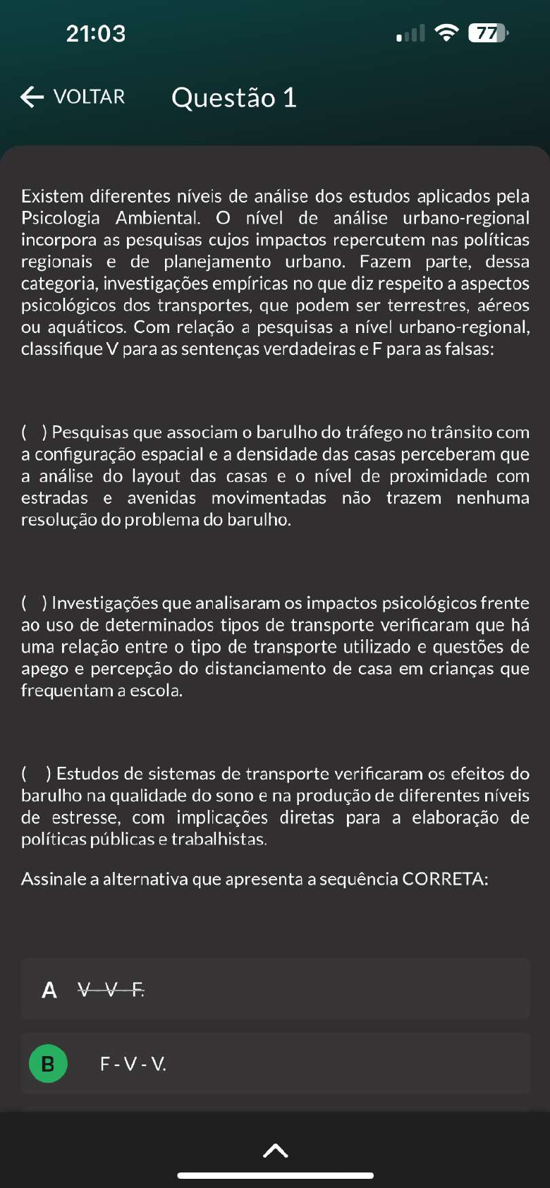 21:03 77 VOLTAR Questão 1 Existem diferentes níveis de análise dos estudos aplicados pela Psicologia Ambiental. O nível de análise urbano-regional incorpora as pesquisas cujos impactos repercutem nas políticas regionais e de planejamento urbano. Fazem parte, dessa categoria, investigações empíricas no que diz respeito a aspectos psicológicos dos transportes, que podem ser terrestres, aéreos ou aquáticos. Com relação a pesquisas a nível urbano-regional, classifique V para as sentenças verdadeiras e F para as falsas: ( ) Pesquisas que associam barulho do tráfego no trânsito com a configuração espacial e a densidade das casas perceberam que a análise do layout das casas e nível de proximidade com estradas e avenidas movimentadas não trazem nenhuma resolução do problema do barulho. ( ) Investigações que analisaram os impactos psicológicos frente ao uso de determinados tipos de transporte verificaram que há uma relação entre tipo de transporte utilizado e questões de apego e percepção do distanciamento de casa em crianças que frequentam a escola. ( ) Estudos de sistemas de transporte verificaram os efeitos do barulho na qualidade do sono e na produção de diferentes níveis de estresse, com implicações diretas para a elaboração de políticas públicas e trabalhistas. Assinale a alternativa que apresenta a sequência CORRETA: A B21:03 77 VOLTAR Questão 1 a análise do layout das casas e nível de proximidade com estradas e avenidas movimentadas não trazem nenhuma resolução do problema do barulho. ( ) Investigações que analisaram os impactos psicológicos frente ao uso de determinados tipos de transporte verificaram que há uma relação entre tipo de transporte utilizado e questões de apego e percepção do distanciamento de casa em crianças que frequentam a escola. ( ) Estudos de sistemas de transporte verificaram os efeitos do barulho na qualidade do sono e na produção de diferentes níveis de estresse, com implicações diretas para a elaboração de políticas públicas e trabalhistas. Assinale a alternativa que apresenta a sequência CORRETA: A F. B V F F. D V V V.21:03 77 VOLTAR Questão 2 O termo Psicologia Ambiental pode ser compreendido como campo de estudo da Psicologia que correlaciona os seres humanos a espaços físicos e sociais. Nessa área, busca-se elucidar as inter-relações que homem realiza com ambiente, com um grande enfoque nos processos psicológicos e sociais advindos dessa interface. Com relação ao exposto, assinale a alternativa CORRETA que descreve um dos processos psicológicos de importância para a Psicologia Ambiental: A Percepções. Alucinoses. D 1 2 3 4 5 6 7 8 9 1021:03 77 VOLTAR Questão 3 Ao longo dos anos, diversos estudos foram empreendidos no campo interdisciplinar da Psicologia Ambiental para verificar as representações mentais das pessoas em relação aos diferentes ambientes urbanos. Nesse contexto, também, foram realizados estudos no que diz respeito à representação mental da ideia de vizinhança a partir da criação de esquemas socioespaciais. Com relação ao exposto, associe os itens, utilizando código a seguir: I- Fatores simbólicos e estéticos. II- Orientação alopsíquica. III- Nível de acuidade. ( ) Processo psicológico básico de localização em relação ao tempo e ao espaço. ( ) Nível de associação espacial entre os diferentes componentes disponíveis em um ambiente físico. ( ) Elementos importantes para processo de organização mental do espaço da cidade, que possibilita que as pessoas criem um mapa mental claro de tal ambiente. Assinale a alternativa que apresenta a sequência CORRETA: A21:04 77 VOLTAR Questão 3 ( ) Processo psicológico básico de localização em relação ao tempo e ao espaço. ( ) Nível de associação espacial entre os diferentes componentes disponíveis em um ambiente físico. ( ) Elementos importantes para processo de organização mental do espaço da cidade, o que possibilita que as pessoas criem um mapa mental claro de tal ambiente. Assinale a alternativa que apresenta a sequência CORRETA: A III B H III. C II - III - I. D III II. Revisar Conteúdo do Livro21:04 77 VOLTAR Questão 4 Quando se analisa início do processo de formação do conhecimento em Psicologia Ambiental, verifica-se que os pesquisadores da área do comportamento tinham, como foco, as pesquisas que tivessem desdobramentos nas políticas governamentais. Nessa direção, as pesquisas tinham, como objetivo, propor diretrizes para a formulação de características de determinados espaços construídos. Com relação ao exposto, assinale a alternativa CORRETA que apresenta uma característica dos espaços: A Design. Materiais. Saneamento. D Personalidade. V 1 2 3 4 5 6 7 8 9 1021:04 77 VOLTAR Questão 5 O processo de educação ambiental comporta recursos e estratégias práticas que geram uma mudança de atitudes e/ou comportamentos. Com base em múltiplos métodos, adota-se uma postura ao estilo da relação professor-aluno. Com relação às diretrizes a serem incorporadas aos programas de educação ambiental, que visem ao aumento da eficácia e da efetividade, classifique V para as sentenças verdadeiras e F para as falsas: ( ) Mostrou-se relevante explicar um dos lados da questão ambiental apresentada. ( ) Mostrou-se relevante encorajar um contato mais direto com a natureza. ( ) Mostrou-se relevante incentivar um maior senso de responsabilidade e controle pessoal. Assinale a alternativa que apresenta a sequência CORRETA: A F - - V. B V V. V V. D V F F.21:04 77 VOLTAR Questão 6 Inicialmente, O termo Psicologia Ambiental passou a ser utilizado em um congresso, na década de 1970, qual tinha, como um dos temas de investigação e análise, a associação entre design das salas de atendimento de hospitais psiquiátricos e sucesso terapêutico do tratamento proposto. Com relação aos diferentes momentos históricos de construção da Psicologia Ambiental, analise as s