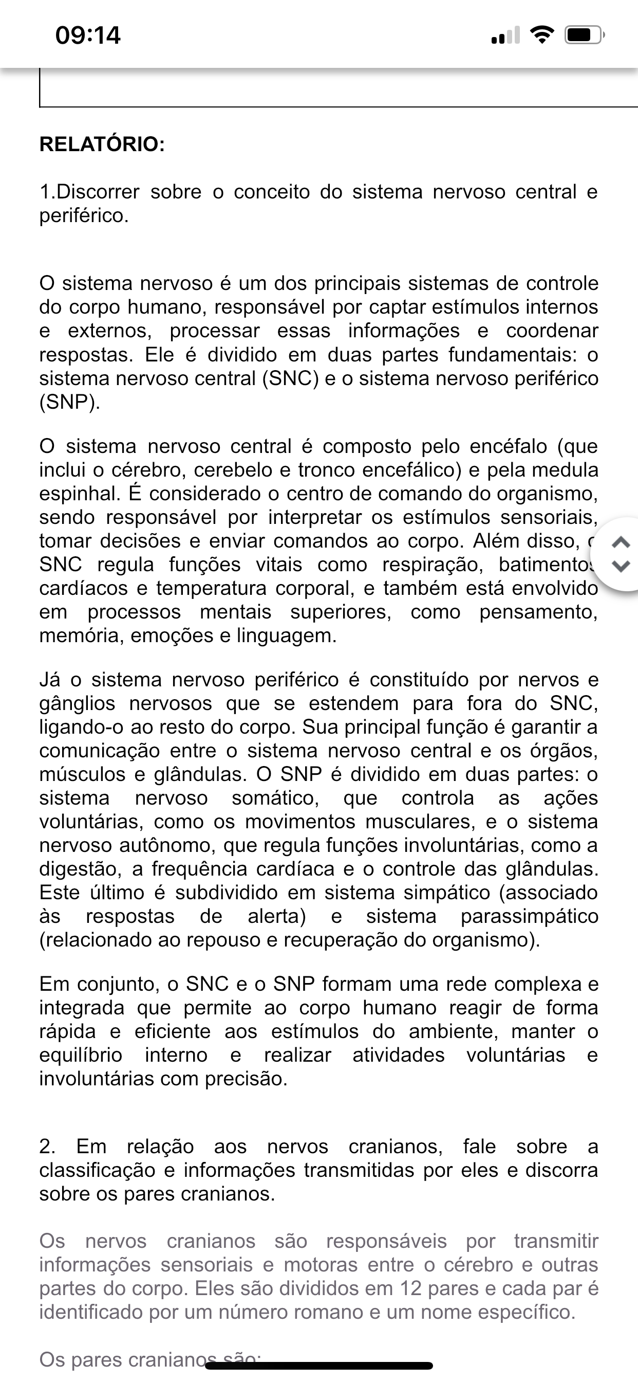 09:14 RELATÓRIO: 1.Discorrer sobre o conceito do sistema nervoso central e periférico. O sistema nervoso é um dos principais sistemas de controle do corpo humano, responsável por captar estímulos internos e externos, processar essas informações e coordenar respostas. Ele é dividido em duas partes fundamentais: o sistema nervoso central (SNC) e sistema nervoso periférico (SNP). O sistema nervoso central é composto pelo encéfalo (que inclui o cérebro, cerebelo e tronco encefálico) e pela medula espinhal. É considerado o centro de comando do organismo, sendo responsável por interpretar os estímulos sensoriais, tomar decisões e enviar comandos ao corpo. Além disso, SNC regula funções vitais como respiração, batimento cardíacos e temperatura corporal, e também está envolvido em processos mentais superiores, como pensamento, memória, emoções e linguagem. Já sistema nervoso periférico é constituído por nervos e gânglios nervosos que se estendem para fora do SNC, ligando-o ao resto do corpo. Sua principal função é garantir a comunicação entre o sistema nervoso central e os órgãos, músculos e glândulas. O SNP é dividido em duas partes: o sistema nervoso somático, que controla as ações voluntárias, como os movimentos musculares, e sistema nervoso autônomo, que regula funções involuntárias, como a digestão, a frequência cardíaca e controle das glândulas. Este último é subdividido em sistema simpático (associado às respostas de alerta) e sistema parassimpático (relacionado ao repouso e recuperação do organismo). Em conjunto, o SNC e o SNP formam uma rede complexa e integrada que permite ao corpo humano reagir de forma rápida e eficiente aos estímulos do ambiente, manter equilíbrio interno e realizar atividades voluntárias e involuntárias com precisão. 2. Em relação aos nervos cranianos, fale sobre a classificação e informações transmitidas por eles e discorra sobre os pares cranianos. Os nervos cranianos são responsáveis por transmitir informações sensoriais e motoras entre o cérebro e outras partes do corpo. Eles são divididos em 12 pares e cada par é identificado por um número romano e um nome específico. Os pares cranianos