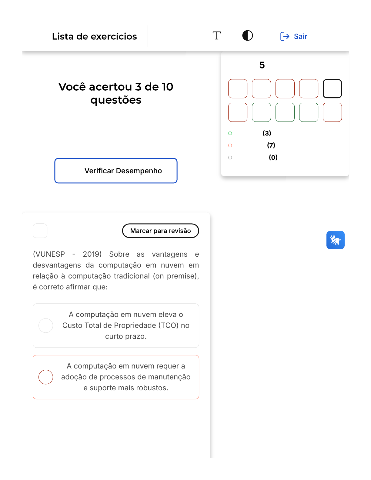 Verifique o seu desempenho e continue treinando! Você pode refazer o exercício quantas vezes quiser. A B 1 �VUNESP � 2019� Sobre as vantagens e desvantagens da computação em nuvem em relação à computação tradicional (on premise), é correto afirmar que: A computação em nuvem eleva o Custo Total de Propriedade �TCO) no curto prazo. A computação em nuvem requer a adoção de processos de manutenção e suporte mais robustos. Questão de 10 Corretas Incorretas Em branco 1 2 3 4 5 6 7 8 9 10 Fundament… Firefox https://estacio.saladeavaliacoes.com.br/exercicio/6845ff58e9ec021803b... 1 of 20 08/06/2025, 18:26 C D E Os custos iniciais de implantação de infraestruturas de software em nuvem são geralmente inferiores ao das infraestruturas tradicionais. Softwares que operam on-premises possuem um ciclo de implantação potencialmente menor do que softwares na nuvem. Na computação em nuvem, não há necessidade de instalar mecanismos de segurança ou backup para proteger os dados. Opa! A alternativa correta é a letra C. Confira o gabarito comentado! Firefox https://estacio.saladeavaliacoes.com.br/exercicio/6845ff58e9ec021803b... 2 of 20 08/06/2025, 18:26 A A alternativa correta é a letra C. A computação em nuvem tem como uma de suas principais vantagens a redução de custos iniciais de implantação de infraestruturas de software. Isso ocorre porque, ao optar pela computação em nuvem, as empresas não precisam investir em equipamentos ou softwares, pois irão utilizar a infraestrutura já existente nos provedores de computação em nuvem. Dessa forma, o modelo de serviço em nuvem permite um consumo compartilhado de recursos, o que resulta em custos iniciais geralmente inferiores aos das infraestruturas tradicionais. 2 Apesar da computação em nuvem oferecer uma série de vantagens, existem algumas desvantagens na escolha desse tipo de serviço. Dentre as opções abaixo, assinale a opção relacionada a uma desvantagem da computação em nuvem. Não há necessidade de investir em software e hardware, ou seja, não há custos iniciais com infraestrutura, pagamos pelos serviços que são consumidos. Firefox https://estacio.saladeavaliacoes.com.br/exercicio/6845ff58e9ec021803b... 3 of 20 08/06/2025, 18:26 B C D E É possível aumentar o uso de recursos de forma simples, sendo compatível com o escalonamento vertical e horizontal. É possível adaptar a disponibilidade de recursos à medida que a demanda aumenta ou diminui. Em caso de um ataque cibernético, falta de energia ou perda de conectividade com a Internet pelo provedor de nuvem, sua empresa pode sofrer períodos de inatividade indesejados. Os serviços solicitados por uma empresa podem estar em funcionamento em pouco tempo, diferente da abordagem tradicional ou convencional. Opa! A alternativa correta é a letra D. Confira o gabarito comentado! A alternativa D é a correta, pois aponta uma desvantagem real da computação em nuvem. A computação em nuvem depende fortemente da conectividade com a Internet. Portanto, qualquer problema relacionado à conectividade, seja por um ataque cibernético, falta de energia ou problemas com o provedor de nuvem, pode Firefox https://estacio.saladeavaliacoes.com.br/exercicio/6845ff58e9ec021803b... 4 of 20 08/06/2025, 18:26 A B resultar em períodos de inatividade para a empresa. Isso pode ter um impacto significativo na produtividade e nos resultados da empresa. Portanto, ao optar pela computação em nuvem, é fundamental que a empresa esteja ciente dessa vulnerabilidade e tome as medidas necessárias para mitigar os riscos. 3 Sobre Segurança na computação em nuvem, é incorreto afirmar: A Segurança na computação em nuvem é o desafio mais visível a ser enfrentado, pois a informação que antes era armazenada localmente, agora se localiza na nuvem em local físico que não se tem precisão onde é, nem que tipos de dados estão sendo armazenados juntos. Alguns exemplos de mecanismo de segurança dos dados na computação em nuvem são: criptografia, redundância e descarte ou remoção dos dados. Firefox https://estacio.saladeavaliacoes.com.br/exercicio/6845ff58e9ec021803b... 5 of 20 08/06/2025, 18:26 C D E Em relação as questões legais, como a localização dos dados é incerta, os dados podem estar distribuídos em diversos Datacenters em diferentes países e consequentemente sob jurisdições distintas. Ao adotar medidas de segurança tanto lógica como físicas eficientes, as chances de expor as aplicações e dados em risco diminuem consideravelmente. A Computação em nuvem nunca será uma alternativa segura em relação a guardar as aplicações em servidores internos. Opa! A alternativa correta é a letra E. Confira o gabarito comentado! A resposta correta é: A Computação em nuvem nunca será uma alternativa segura em relação a guardar as aplicações em servidores internos. A Computação em nuvem é uma alternativa segura para guardar as aplicações em servidores internos, pois oferece uma série de mecanismos de segurança que protegem os dados contra acessos não autorizados, perdas e danos. Alguns exemplos de mecanismos de segurança dos dados na computação em Firefox https://estacio.saladeavaliacoes.com.br/exercicio/6845ff58e9ec021803b... 6 of 20 08/06/2025, 18:26 nuvem são: criptografia, redundância e descarte ou remoção dos dados. A criptografia é uma técnica que transforma os dados em um formato ilegível para pessoas não autorizadas, dificultando o acesso aos dados. A redundância é uma técnica que cria cópias dos dados em diferentes locais, de forma que, se um dos locais for danificado ou perdido, os dados ainda estarão disponíveis em outro local. O descarte ou remoção dos dados é uma técnica que apaga os dados permanentemente, de forma que não possam ser recuperados. Ao adotar medidas de segurança tanto lógica como físicas eficientes, as chances de expor as aplicações e dados em risco diminuem consideravelment