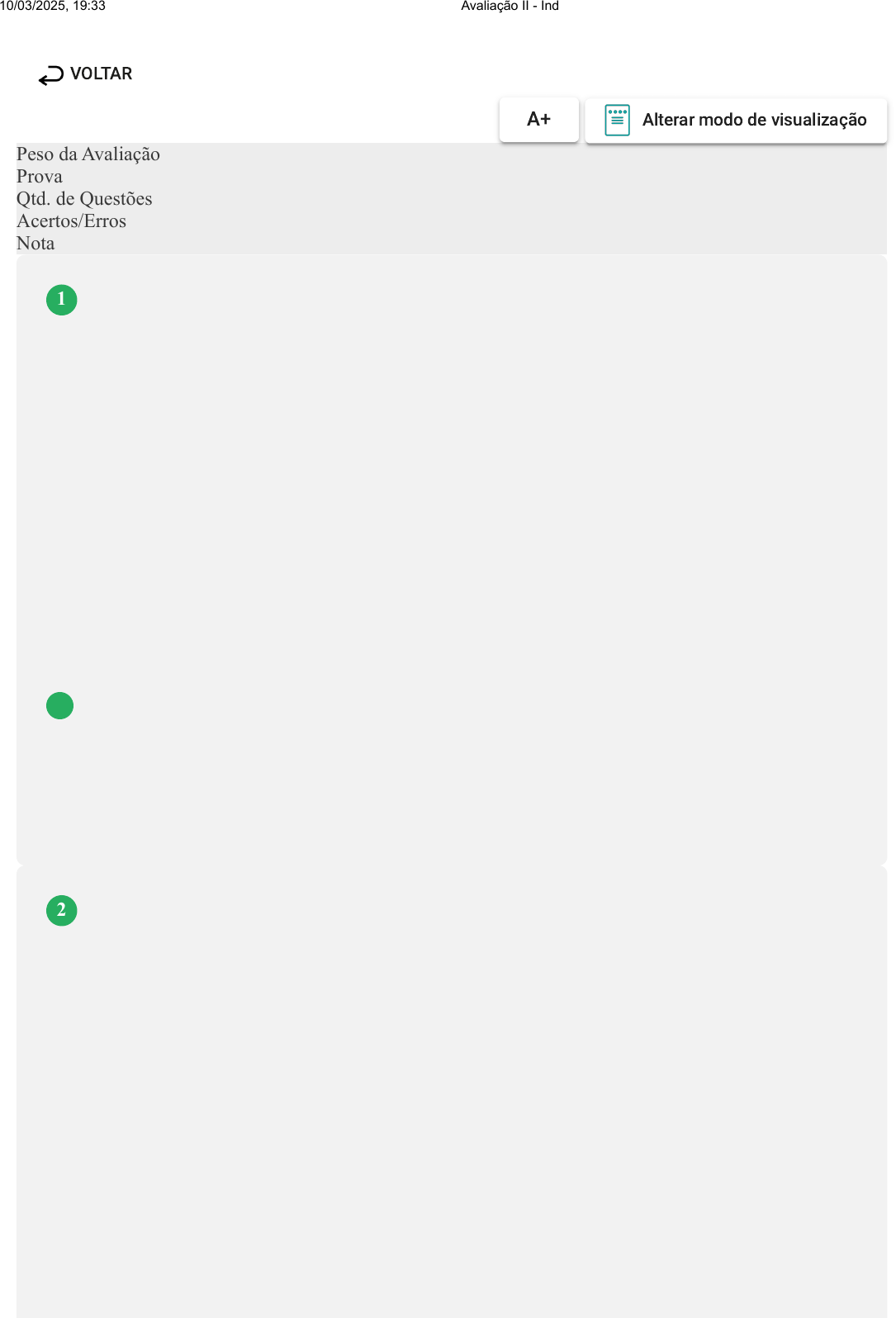 Prova Impressa GABARITO | Avaliação II - Individual (Cod.:1019708) Peso da Avaliação 2,00 Prova 94719651 Qtd. de Questões 10 Acertos/Erros 9/1 Nota 9,00 Dentro da Interação Humano-Computador (IHC), o conceito de usabilidade foi sendo reconstruído continuamente e tornou-se cada vez mais rico e problemático. A usabilidade integra, agora, qualidades como diversão, bem-estar, eficácia coletiva, estética, criatividade, suporte para o desenvolvimento humano, entre outras. A parte 11 da ISO 9241 é totalmente dedicado a esse assunto. Já na parte 10 A parte 10 da norma ISO 9241 descreve sete princípios de diálogos. Sobre o exposto, avalie as asserções a seguir e a relação proposta entre elas: I- Entre esses princípios, na parte 11 temos a adequação à tarefa, conformidade com as expectativas dos desenvolvedores e imposição ao aprendizado referentes às interfaces de software. PORQUE II- No que se refere à autodescrição, o feedback ou as explanações segundo a norma eles devem ser apresentados em uma terminologia adequadamente derivada da tecnologia do sistema e não do ambiente da tarefa. Assinale a alternativa CORRETA: A A primeira asserção é uma proposição verdadeira, e a segunda é uma proposição falsa. B As duas asserções são proposições falsas. C A primeira asserção é uma proposição falsa, e a segunda, uma proposição verdadeira. D As duas asserções são proposições verdadeiras. Usabilidade é um termo usado para definir a qualidade de uso de um software ou qualquer outro objeto a fim de realizar uma tarefa específica e importante. Ela objetiva fazer uma avaliação da qualidade de uma interface com relação à sua utilização por parte dos usuários. Através desta avaliação, são diagnosticadas características da interface que atrapalham a interação, provavelmente por não estarem em conformidade com padrões implícitos e explícitos de Usabilidade. Sobre os objetivos de uma avaliação de usabilidade, analise as seguintes afirmativas: I- Verificar o desempenho real dos sistemas face aos objetivos que foram estabelecidos pelos usuários. II- Fazer a detecção precoce de problemas de usabilidade. III- Prever potenciais dificuldades de aprendizado na operação do sistema. Assinale a alternativa CORRETA: A Somente a afirmativa II está correta. B Somente a afirmativa III está correta. VOLTAR A+ Alterar modo de visualização 1 2 10/03/2025, 19:33 Avaliação II - Individual about:blank 1/6 C As afirmativas I e III estão corretas. D As afirmativas II e III estão corretas. Usabilidade se refere à facilidade de uso de um produto físico ou digital ou mesmo um serviço, que permite com que o seu cliente tenha maior produtividade. Segundo a norma ISO 9241, usabilidade é a capacidade que um sistema interativo oferece a seu usuário, em determinado contexto de operação, para a realização de tarefas de maneira eficaz, eficiente e agradável. Segundo a norma ISO/IEC 9126, usabilidade é a facilidade com que um usuário pode aprender a operar, preparar entradas para um sistema ou componente e interpretar as saídas desse sistema. As técnicas de avaliação de usabilidade experimentais ou empíricas contam com a participação direta dos usuários e compreendem, basicamente, os testes com usuários por meio do monitoramento de sessões de uso do produto, ou protótipo, em consideração. Sobre a avaliação de usabilidade de um sistema interativo, analise as seguintes afirmativas: I- A usabilidade busca validar a eficácia da interação humano-computador face a efetiva realização das tarefas por parte dos usuários, II- A usabilidade busca verificar a eficiência desta interação, face os recursos empregados (tempo, quantidade de incidentes, passos desnecessários, busca de ajuda etc.). III- A usabilidade busca obter custos mensuráveis, através da satisfação ou insatisfação na utilização. Assinale a alternativa CORRETA: FONTE: https://www.aprovaconcursos.com.br/questoes-de-concurso/questoes/busca/usabilidade. Acesso em: 29 mar. 2019. A As afirmativas II e III estão corretas. B As afirmativas I e II estão corretas. C Somente a afirmativa III está correta. D As afirmativas I e III estão corretas. Uma das maiores dificuldades encontradas está em avaliar o quanto uma interface é adequada ao uso. A "usabilidade é uma metodologia científica aplicada na criação e remodelação de interfaces de sites, intranets, aplicativos, jogos e produtos de modo a torná-las fáceis de aprender e de usar". Podemos dizer que um problema de usabilidade ocorre quando determinada característica do sistema acaba por retardar, prejudicar ou mesmo inviabilizar a realização de uma tarefa, incomodando, constrangendo ou traumatizando o usuário que utiliza o sistema. Sobre a natureza de um problema de usabilidade, associe os itens utilizando o código a seguir: I- Barreira. II- Ruído. III- Obstáculo. ( ) Causa uma diminuição de seu desempenho na tarefa, o usuário pode desenvolver uma má impressão do sistema. ( ) Se refere a um aspecto da interface no qual o usuário esbarra sucessivas vezes e não aprende a suplantá-lo. Sua presença na interface implica em prejuízos definitivos, que dependendo da tarefa e usuário, podem inviabilizar economicamente o sistema. 3 4 10/03/2025, 19:33 Avaliação II - Individual about:blank 2/6 ( ) Se refere a um aspecto da interface no qual o usuário esbarra e aprende a suplantá-lo. Sua presença implica na acumulação de prejuízos para os que operam e para os que adquiriram o sistema. Assinale a alternativa que apresenta a sequência CORRETA: A I - III - II. B III - II - I. C II - I - III. D II - III - I. O termo usabilidade é comumente apresentado por diversos autores, possuindo um significado muito parecido entre eles. Especialmente no que se refere a como determinar o que o usuário deve fazer quando realiza tarefas, utilizando um produto interativo. Sobre o conceito referido na imagem a s