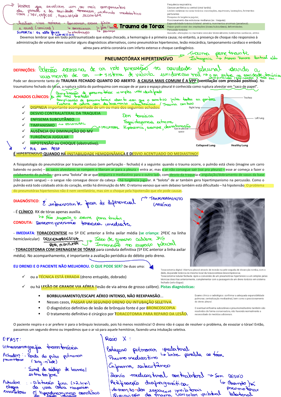 - 9. Trauma de Tórax Devemos lembrar que em todo politraumatizado que esteja chocado, a hemorragia é a primeira causa; no entanto, a presença de choque não responsivo à administração de volume deve suscitar alguns diagnósticos alternativos, como pneumotórax hipertensivo, lesão miocárdica, tamponamento cardíaco e embolia aérea para artéria coronária com infarto extenso e choque cardiogênico. PNEUMOTÓRAX HIPERTENSIVO DEFINIÇÕES: Pode ser decorrente tanto do TRAUMA FECHADO QUANTO DO ABERTO. A CAUSA MAIS COMUM É A VPP (ventilação com pressão positiva). No traumatismo fechado do tórax, a ruptura súbita do parênquima com escape de ar para o espaço pleural é conhecida como ruptura alveolar em “saco de papel”. ACHADOS CLÍNICOS: DISPNEIA importante acompanhada de um ou mais dos seguintes achados: DESVIO CONTRALATERAL DA TRAQUEIA ENFISEMA SUBCUTÂNEO TIMPANISMO AUSÊNCIA OU DIMINUIÇÃO DO MV TURGÊNCIA JUGULAR HIPOTENSÃO ou CHOQUE (obstrutivo). É HIPERTENSIVO QUANDO HÁ INSTABILIDADE HEMODINÂMICA E DESVIO ACENTUADO DO MEDIASTINO! A fisiopatologia do pneumotórax por trauma contuso (sem perfuração - fechado) é a seguinte: quando o trauma ocorre, o pulmão está cheio (imagine um carro batendo no poste) – os sacos alveolares se rompem e liberam ar para a pleura – entra ar, mas o ar não consegue sair (vai pra pleura) – esse ar começa a fazer o colabamento do pulmão – gera uma “bolota” de ar que empurra o mediastino para o outro lado, com desvio da traqueia e angulação/dobramento de vasos da base (não passam sangue) – o sangue não consegue descer da cabeça – há turgência jugular. A “bolota” de ar também gera hipertimpanismo na percussão. Como o pulmão está todo colabado atrás do coração, então há diminuição do MV. O retorno venoso que vem debaixo também está dificultado – há hipotensão. O problema do pneumotórax hipertensivo não é nem ventilatório, mas sim o choque pela hipotensão que ele pode causar. DIAGNÓSTICO: - É CLÍNICO. RX de tórax apenas auxilia. CONDUTA: - IMEDIATA: TORACOCENTESE no 5º EIC anterior a linha axilar média (se criança: 2ºEIC na linha hemiclavicular) - TORACOSTOMIA COM DRENAGEM DE TÓRAX para conduta definitiva (5º EIC anterior a linha axilar média). No acompanhamento, é importante a avaliação periódica do débito pelo dreno. EU DRENEI E O PACIENTE NÃO MELHOROU. O QUE PODE SER? De duas uma: ou a TÉCNICA ESTÁ ERRADA (dreno entupido, dobrado) ou há LESÃO DE GRANDE VIA AÉREA (lesão de via aérea de grosso calibre). Pistas diagnósticas: BORBULHAMENTO/ESCAPE AÉREO INTENSO, NÃO REEXPANSÃO... Nesses casos, PASSAR UM SEGUNDO DRENO OU INTUBAÇÃO SELETIVA. O diagnóstico definitivo de lesão de brônquio fonte é por BRONCOSCOPIA O tratamento definitivo é cirúrgico por TORACOTOMIA PARA REPARO DA LESÃO. O paciente respira e o ar prefere ir para o brônquio lesionado, pois há menos resistência! O dreno não é capaz de resolver o problema, de esvaziar o tórax! Então, passamos um segundo dreno ou impedimos que o ar vá para aquele hemitórax, fazendo uma intubação seletiva. Medicina livre, venda proibida. Twitter @livremedicina - PNEUMOTÓRAX SIMPLES DEFINIÇÕES: É todo aquele que NÃO APRESENTA DESVIO DO MEDIASTINO, podendo ser decorrente tanto de trauma penetrante (aberto) quanto fechado. É considerado um “PNEUMOTÓRAX PEQUENO” quando há menos de 1/3 do volume do pulmão e um “GRANDE PNEUMOTÓRAX” quando há colapso de quase todo o pulmão, sem a presença de desvio do mediastino e hipotensão. UM ALGO A MAIS... E-FAST: normal: SINAL DA PRAIA (areia da praia e ondas do mar); alterado: SINAL DA ESTRATOSFERA OU CÓDIGO DE BARRAS A: Sinal da praia. B: Analogia ao sinal da “areia da praia” e “ondas do mar”. Acima da linha pleural (setas), os tecidos superficiais sem movimentação são visualizados na forma de linhas paralelas à pleura, aspecto semelhante a “ondas do mar” (colchetes azuis). Abaixo da linha pleural obtém-se uma imagem artefatual do deslizamento pleural semelhante a “areia da praia” (colchetes brancos). O conjunto desses achados é conhecido como “sinal da praia”. Aqui verifica-se o “sinal da estratosfera” ou “sinal do código de barras” (representado ao lado direito da imagem), que indica ausência de deslizamento pleural. Não mais é caracterizado o “sinal da praia”. A pleura hiperecogênica é identificada pela seta. Este achado também pode estar presente em outras condições como intubação seletiva e paralisia diafragmática. OBSERVAÇÕES (MUITO) IMPORTANTES: Todo pneumotórax deve ser drenado? Se for simples (não é hipertensivo e é pequeno – 20-30% de um hemitórax), não precisa drenar – apenas avalia. Se for simples e pequeno, a única exceção para drenar este paciente é caso ele seja colocado em transporte aéreo ou ventilação mecânica. Quando você coloca no transporte aéreo ou ventilação mecânica, a pressão muda e o pneumotórax pode aumentar! Então... - PNEUMOTÓRAX HIPERTENSIVO: drena sempre! - PNEUMOTÓRAX SIMPLES E PEQUENO: DRENAR APENAS SE... TRANSPORTE AÉREO VENTILAÇÃO MECÂNICA ou SUBMETIDO A ANESTESIA GERAL (lembrar da VIDEOLAPAROSCOPIA) O aumento da pressão ocasionado nessas situações pode tornar um pneumotórax simples e pequeno em um “grande e complicado” PNEUMOTÓRAX ABERTO DEFINIÇÕES: Também chamada de FERIDA TORÁCICA ASPIRATIVA. Ocorre por lesão penetrante. Deve haver um “BURACO” MAIOR QUE 2/3 DO DIÂMETRO DA TRAQUEIA. O paciente está NORMOTENSO. O ar “entra pelo buraco”, mas também sai... Não há o desvio do mediastino, não há hipotensão. A princípio, o paciente está normotenso. CONDUTA: CURATIVO DE 3 PONTAS (válvula uniderecional). A conduta definitiva é a mesma do pneumotórax hipertensivo: TORACOSTOMIA COM DRENAGEM DE TÓRAX SOB SELO D’ÁGUA + FECHAMENTO CIRÚRGICO DA LESÃO. Se fechar as 4 pontas do curativo, pode gerar um 