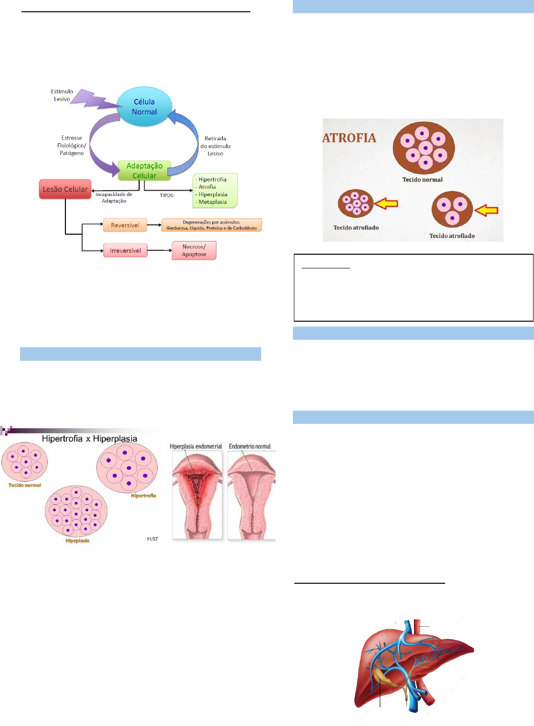 ALTERAÇÕES NO CRESCIMENTO E DIFERENCIAÇÃO CELULAR Tecido → conjunto de células idênticas entre si. − Reações aos estímulos, muda a forma e função celular. ESTIMULO LESIVO → ADAPTAÇÃO . Regeneração → ativação de uma área inativa. − Formação do tecido conjuntivo, vasos. Células troncos → indiferenciadas. HIPERTROFIA Aumento das células e com esta alteração aumento do tamanho do órgão − Fisiológica → Aumento dos seios, crescimento maciço do útero. − Patológica → Musculação, sobrecarga hemodinâmica. ATROFIA A diminuição do tamanho e da função da célula por perda de substancia celular é conhecida como atrofia. − Fisiológica → diminuição do útero pós parto, das mamas... − Patológica → perda de uso Mecanismo bioquímicos da ATROFIA • Perda do equilíbrio entre síntese e degradação das proteínas • Vacúolos autofágicos destroem componentes celulares HIPERPLASIA A hiperplasia constitui um aumento do número de células em um órgão ou tecido, que então pode ter aumentado de volume. Ocorre em células lábeis e estáveis Pode ser: − Fisiológica → hiperplasia hormonal − Patológica → estimulação hormonal excessiva. Hiperplasia compensatória → hiperplasia que ocorre quando parte do fígado é removida. TERATOMA: Tumor germinativo benigno ou maligno, composto por tecidos derivados das três camadas embrionárias (ectoderma, mesoderma e endoderma). Contendo cabelos, dentes e ossos... ALTERAÇÕES NO CRESCIMENTO E DIFERENCIAÇÃO CELULAR Hiperplasia reacional → efeito de fatores de crescimento nas células alvo. ➢ Cicatrização de feridas ➢ Verrugas ➢ Hiperplasia fibrosa inflamatória MECANISMO DE HIPERTROFIA E HIPERPLASIA Modificações do ciclo celular. • GO → Célula em repouso • G1 → Síntese de Rna para formação de proteínas envolvidas com a síntese do dna. • G2 → Síntese de Rna envolvidos com a mitose • M → Divisão celular ✓ Bloqueio no G2 – hipertrofia ✓ Boqueio após M – hipertrofia METAPLASIA Alteração reversível na qual um tipo celular adulto (epitelial ou mesenquimal) é substituído por outro tipo celular adulto. ➢ Fumantes Mecanismos: • Célula germinativa • Direta – alteração genética de células maduras • Indireta – desdiferenciação DISPLASIA/ATIPIA Proliferação celular excessiva, acompanhada de ausência ou escassez de diferenciação. • Atipias epiteliais • Progressão para o câncer • Neoplasias intraepiteliais Atípico → fora do normal ❖ Quando rompe a membrana basal, se torna câncer. Ao entrar no tecido conjuntivo pode entrar em vasos sanguíneos (metástase) ➢ Atipia discreta/ moderada/ intensa Critérios histológicos da atipia: • Estratificação anormal do epitélio • Hiperplasia da camada basal • Perda de coesão tecidual • Pleomorfismo celular • Aumento das mitoses