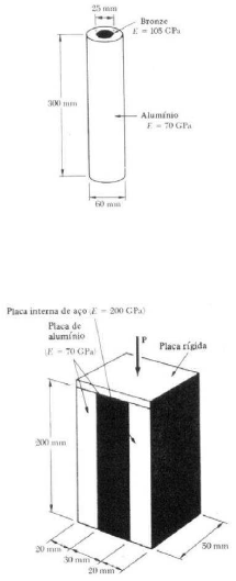 UNIDADE 3 – TRAÇÃO E COMPRESSÃO: 2ª LISTA DE EXERCÍCIOS 1) O cilindro de bronze e o cilindro oco de alumínio mostrado na figura 1 formam um conjunto que encurta de 0,4 mm quando recebe uma força axial aplicada em placas rígidas nas suas extremidades. Determinar: a) a intensidade da força aplicada e b) a tensão na barra de bronze. Respostas: a) P=286,8 kN ; b) σbronze=-140 MPa. Figura 1. 2) Uma placa rígida transmite ao bloco composto mostrado na figura 2 uma força axial centrada P=385 kN. Determinar as tensões normais: a) na placa interna de aço e b) nas placas externas de alumínio. Respostas: a) σaço=-175 MPa; b) σalumínio=-61,3 MPa. Figura 2. 3) Para o bloco composto mostrado na figura 2, determinar a redução na altura provocada por uma força axial de intensidade P=550 kN. Resposta: δ= -0,25mm. 4) Um parafuso de aço tem diâmetro de 7 mm e está instalado em uma luva de alumínio como mostrado na figura 3. A luva tem diâmetro interno de 8 mm e diâmetro externo de 10 mm. A porca em A é ajustada de modo que fica apenas apoiada contra a luva. Se o conjunto está inicialmente em uma temperatura de T1=20°C e depois é aquecido até uma temperatura T2=100°C, qual a tensão média no parafuso e na luva? Dados: Eaço=200 GPa; Eal=70 GPa; αaço=14x10 -6/°C; αal=23x10 -6/°C. Respostas: a) σparafuso=29,5 MPa; b) σluva=-40,1 MPa. Figura 3. 5) Os trilhos de uma ferrovia, feitos de aço com 40 pés de comprimento cada, foram colocados com uma pequena folga entre si para permitir expansão térmica (figura 4). Determinar a folga requerida δ de modo que os trilhos apenas se toquem quando a temperatura aumentar de T1=-20°F para T2=90°F. Considerando a mesma folga, qual seria a força axial e a tensão sobre os trilhos se a temperatura aumentasse para T3=110°F? A área de seção transversal de cada trilho é de 5,1 pol². Dados: Eaço=29000 ksi; αaço=6,6x10 -6/°F. Respostas: δ= 0,348 pol; F=19,7 kip; σtrilho=-3,86 ksi. Figura 4.