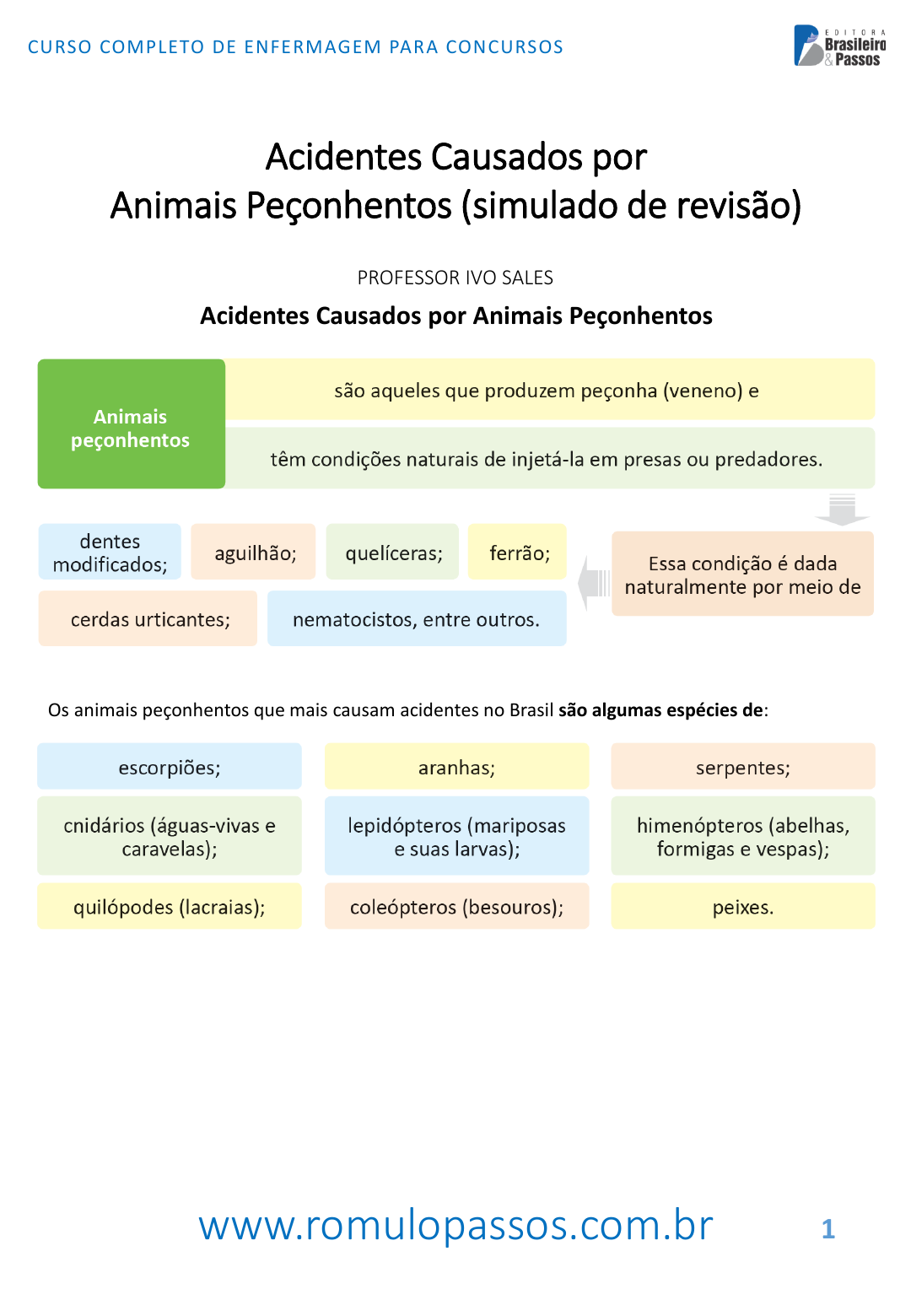 www.romulopassos.com.br CURSO COMPLETO DE ENFERMAGEM PARA CONCURSOS 1 Acidentes Causados por Animais Peçonhentos (simulado de revisão) Acidentes Causados por Animais Peçonhentos Os animais peçonhentos que mais causam acidentes no Brasil são algumas espécies de: PROFESSOR IVO SALES Déborah Alania Silva dos Santos - 70953695425 www.romulopassos.com.br CURSO COMPLETO DE ENFERMAGEM PARA CONCURSOS 2 1. (IAPEN-AC/IBADE/2020) Animais peçonhentos são aqueles cujo organismo produz veneno. Em geral, têm um ferrão com o qual injetam o veneno nas suas vítimas. É INCORRETO afirmar que representa um animal peçonhento: a) Escorpião amarelo. b) Aranha marrom. c) Jararaca. d) Besouro. e) Lonomia. 2. (UDESC/FEPESE/2022) Animais peçonhentos são reconhecidos como aqueles que produzem ou modificam algum veneno e possuem algum aparato para injetá-lo na sua presa ou predador. Sobre esse tema, é correto afirmar: a) Em caso de acidentes ofídicos, o local da picada deve ser lavado com água e sabão, podendo ser aplicado na região pomadas caseiras ou pó de café para alívio da dor, bem como tentar sucção para extração do veneno. b) O tempo decorrido entre o acidente com animal peçonhento e a instalação de soroterapia é fundamental para o prognóstico. Intervalos de tempo superiores a 6 horas estão mais associados a complicações. c) A vítima atingida por animais peçonhentos deve ser orientada a evitar andar ou correr, devendo ficar preferencialmente deitada com o membro atingido abaixado. d) Recomenda-se, dentre os primeiros socorros de acidentes ofídicos, realizar torniquete para evitar que o veneno se espalhe de forma mais acelerada pela corrente sanguínea. e) Dentre as complicações possíveis para os casos de acidentes por animais peçonhentos está a desidratação, causada por poliúria, sendo recomendandas sondagem vesical e medicações vasoconstritoras para controle da diurese e pressão arterial. 3. (UFPE/COVEST-COPSET/2019) Sobre os acidentes envolvendo picadas de animais peçonhentos, assinale a alternativa correta. a) No atendimento pré-hospitalar de acidentes por animais peçonhentos, o técnico socorrista deve, além dos cuidados à vítima, capturar o animal. b) Os acidentes com escorpião classificados como graves, apresentam, inicialmente, manifestações locais como parestesia e dor. c) Pessoas com extremos de idade (crianças e idosos) devem receber atenção especial quando sofrem acidentes com animais peçonhentos, porque são mais susceptíveis a complicações decorrentes do veneno inoculado. d) Nos acidentes com abelhas, o grau de sensibilidade da vítima não interfere na sensibilidade da reação causada, e o quadro será grave, independentemente do número de ferroadas. e) Os acidentes com formiga não causam reações graves e não necessitam de assistência médica de urgência. Déborah Alania Silva dos Santos - 70953695425 www.romulopassos.com.br CURSO COMPLETO DE ENFERMAGEM PARA CONCURSOS 3 4. (Prefeitura de Fortaleza-CE/IMPARH/2020) Animais peçonhentos são aqueles que produzem peçonha (veneno) e têm condições naturais de injetá-la em presas ou predadores. Assinale a alternativa verdadeira. a) A peçonha (veneno) é dada naturalmente por meio de dentes modificados, aguilhão, ferrão,quelíceras, cerdas urticantes, nematocistos, entre outros. b) Os animais peçonhentos que mais causam acidentes no Brasil são: serpentes, escorpiões, aranhas, lepidópteros (abelhas, formigas e vespas), himenópteros (mariposas e suas larvas), dentre outros. c) Mesmo diante do alto número de notificações, esse agravo (acidentes por animais peçonhentos) não foi incluído na Lista de Notificação Compulsória do Brasil. d) Como medida imediata após acidente por animal peçonhento, deve-se fazer torniquete ou garrote e espremer o local da picada. Quanto à classificação dos acidentes por animais peçonhentos, seguem os tipos de acidentes e seus principais agentes causais de importância no Brasil (BRASIL, 2019a): Acidentes Ofídicos • Causado por serpentes dos gêneros Bothrops e Bothrocophias (jararaca, jararacuçu, urutu, cruzeira, caissaca); • É o mais importante dentre os acidentes ofídicos no Brasil. BotrópicoJararaca Fonte: FUNED (2015) O acidente ofídico é o envenenamento causado pela inoculação de toxinas, por intermédio das presas de serpentes (aparelho inoculador), que pode determinar alterações locais (na região da picada) e sistêmicas. Déborah Alania Silva dos Santos - 70953695425 www.romulopassos.com.br CURSO COMPLETO DE ENFERMAGEM PARA CONCURSOS 4 Manifestações Clínicas de Acidente Botrópico Manifestações Locais Manifestações Sistêmicas Dor, edema e equimose na região da picada; bolhas com conteúdo seroso ou sero- hemorrágico podem surgir e originar áreas de necrose, que, juntamente com infecção secundária, são as principais complicações locais e podem levar à amputação e/ou deficit funcional do membro. Sangramentos na pele e nas mucosas são comuns(gengivorragia, equimoses a distância do local da picada); hematúria, hematêmese e hemorragia em outras cavidades; hipotensão pode ser decorrente de sequestro de líquido no membro picado ou hipovolemia consequente a sangramentos, que podem contribuir para o desenvolvimento de insuficiência renal aguda. Manifestações Clínicas de Acidente Laquético • Provocado por serpentes do gênero Lachesis (surucucu- pico-de-jaca, surucucu-de-fogo, surucutinga); • No Brasil, só é causado pela espécie Lachesis muta. Surucucu Fonte: FUNED (2015) • As manifestações locais e sistêmicas são indistinguíveis do quadro botrópico. • A diferenciação clínica se faz quando, nos acidentes laquéticos, estão presentes alterações vagais (náusea, vômito, cólicas abdominais, diarreia, hipotensão e choque). Manifestações Clínicas de Acidente Crotálico • Ocasionado por serpentes do gênero Crotalus (cascavel); • No Brasil, só é representa