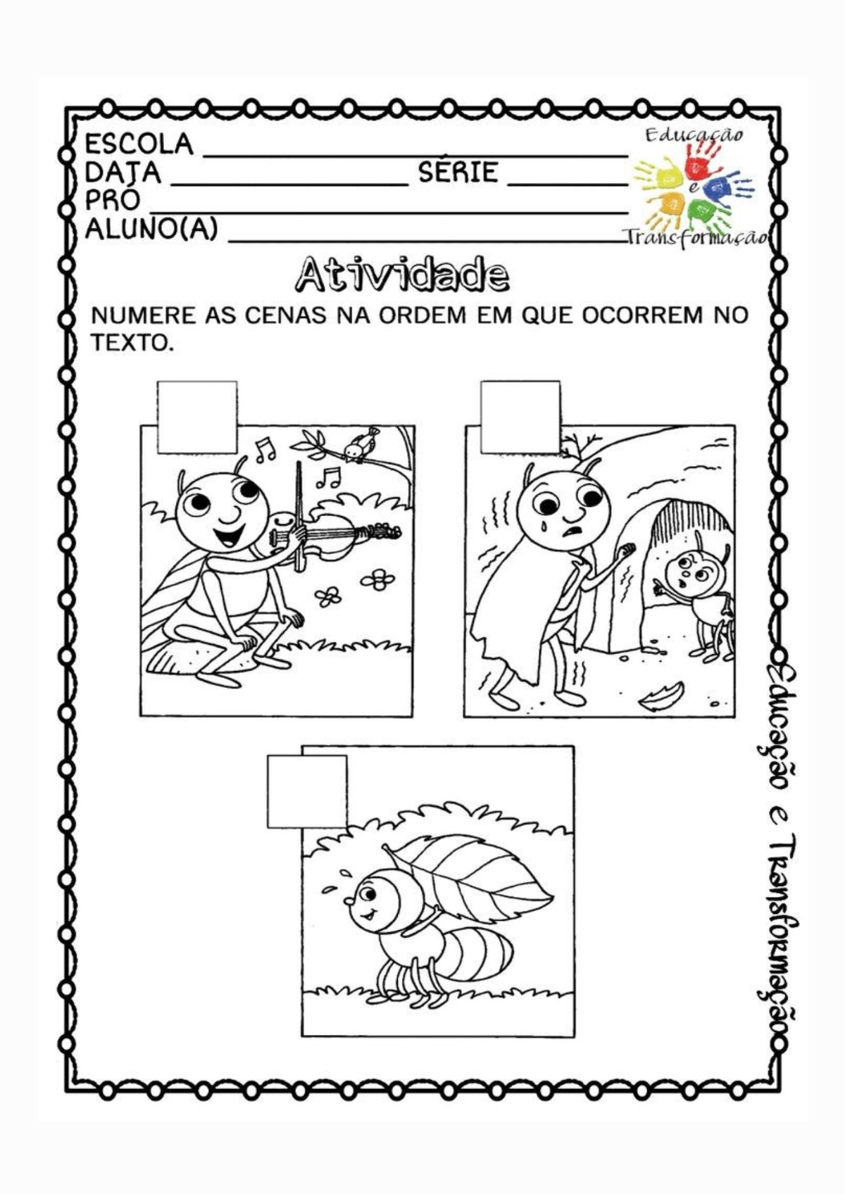 Educação ESCOLA DAJA SERIE PRO ALUNO(A) Atividade NUMERE AS CENAS NA ORDEM EM QUE OCORREM NO TEXTO.ATIVIDADE TIA DANI- A CIGARRA E A FORMIGA NOME: 1° 1. OBSERVE A PALAVRA: CIGARRA TOTAL DE LETRAS QUANTAS VOGAIS? QUAL A SÍLABA INICIAL? 2. OBSERVE A PALAVRA: FORMIGA TOTAL DE LETRAS QUANTAS VOGAIS? QUAL A SÍLABA INICIAL?