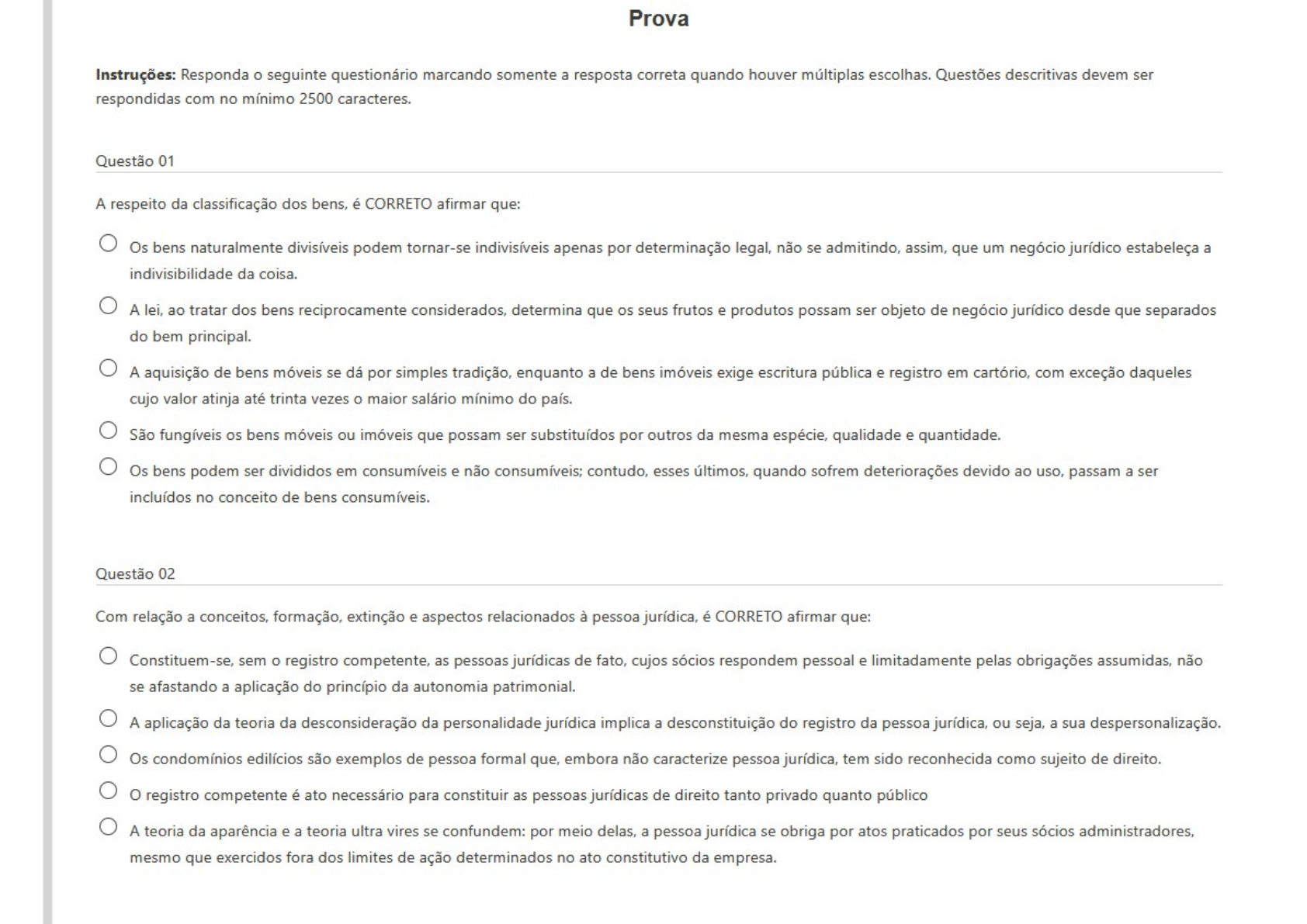 Prova Instruções: Responda o seguinte questionário marcando somente a resposta correta quando houver múltiplas escolhas. Questões descritivas devem ser respondidas com no mínimo 2500 caracteres. Questão 01 A respeito da classificação dos bens, é CORRETO afirmar que: Os bens naturalmente divisíveis podem tornar-se indivisíveis apenas por determinação legal, não se admitindo, assim, que um negócio jurídico estabeleça a indivisibilidade da coisa. A lei, ao tratar dos bens reciprocamente considerados, determina que os seus frutos e produtos possam ser objeto de negócio jurídico desde que separados do bem principal. A aquisição de bens móveis se dá por simples tradição, enquanto a de bens imóveis exige escritura pública e registro em cartório, com exceção daqueles cujo valor atinja até trinta vezes o maior salário mínimo do país. São fungíveis os bens móveis ou imóveis que possam ser substituídos por outros da mesma espécie, qualidade e quantidade. Os bens podem ser divididos em consumíveis e não consumíveis; contudo, esses últimos, quando sofrem deteriorações devido ao uso, passam a ser incluídos no conceito de bens Questão 02 Com relação a conceitos, formação, extinção e aspectos relacionados à pessoa jurídica, é CORRETO afirmar que: Constituem-se, sem o registro competente, as pessoas jurídicas de fato, cujos sócios respondem pessoal e limitadamente pelas obrigações assumidas, não se afastando a aplicação do princípio da autonomia patrimonial. A aplicação da teoria da desconsideração da personalidade jurídica implica a desconstituição do registro da pessoa jurídica, ou seja, a sua despersonalização. Os condomínios edilícios são exemplos de pessoa formal que, embora não caracterize pessoa jurídica, tem sido reconhecida como sujeito de direito. O registro competente é ato necessário para constituir as pessoas jurídicas de direito tanto privado quanto público A teoria da aparência e a teoria ultra vires se confundem: por meio delas, a pessoa jurídica se obriga por atos praticados por seus sócios administradores, mesmo que exercidos fora dos limites de ação determinados no ato constitutivo da empresa.