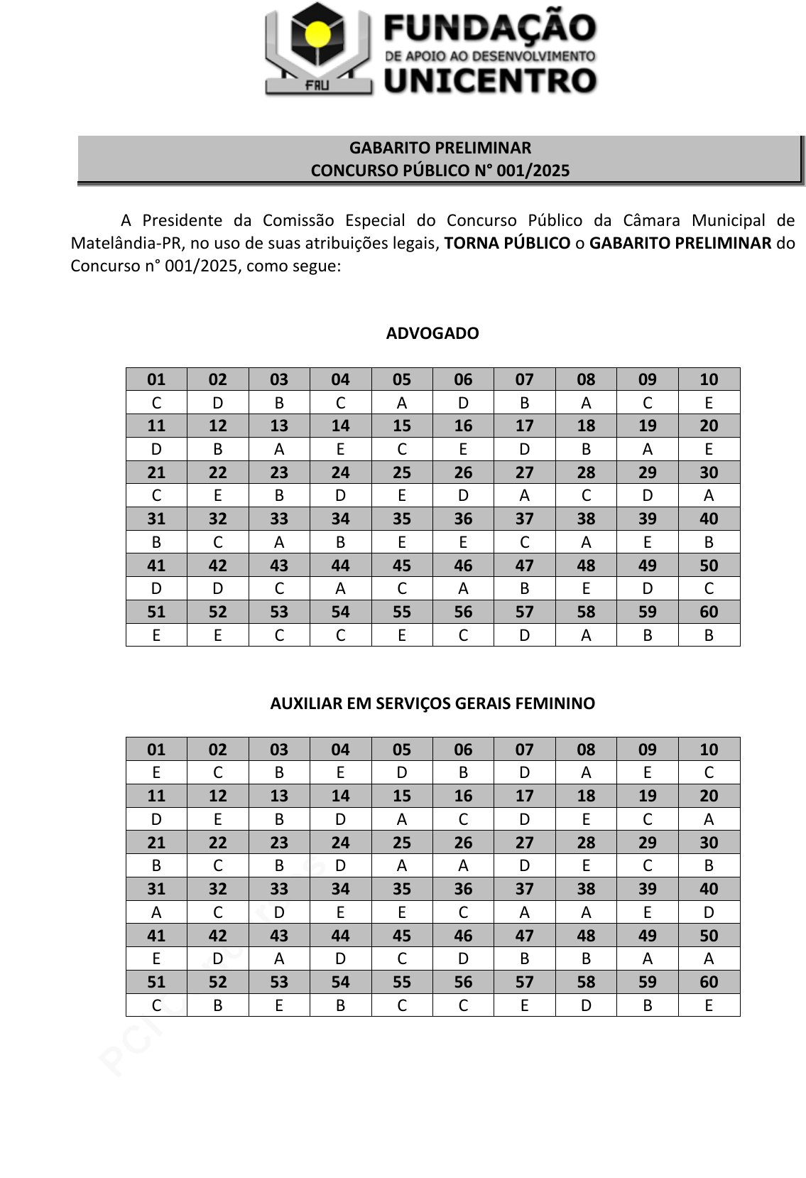 pcimarkpci MjgwNDowN2YwOmJlNDI6ZmY3ODpmYzM2OjhjMTQ6NzA4MDoxMjU1:V2VkLCAxMSBKdW4gMjAyNSAxNzo1MDozNyAtMDMwMA== www.pciconcursos.com.br GABARITO PRELIMINAR CONCURSO PÚBLICO N° 001/2025 A Presidente da Comissão Especial do Concurso Público da Câmara Municipal de Matelândia-PR, no uso de suas atribuições legais, TORNA PÚBLICO o GABARITO PRELIMINAR do Concurso n° 001/2025, como segue: ADVOGADO 01 02 03 04 05 06 07 08 09 10 C D B C A D B A C E 11 12 13 14 15 16 17 18 19 20 D B A E C E D B A E 21 22 23 24 25 26 27 28 29 30 C E B D E D A C D A 31 32 33 34 35 36 37 38 39 40 B C A B E E C A E B 41 42 43 44 45 46 47 48 49 50 D D C A C A B E D C 51 52 53 54 55 56 57 58 59 60 E E C C E C D A B B AUXILIAR EM SERVIÇOS GERAIS FEMININO 01 02 03 04 05 06 07 08 09 10 E C B E D B D A E C 11 12 13 14 15 16 17 18 19 20 D E B D A C D E C A 21 22 23 24 25 26 27 28 29 30 B C B D A A D E C B 31 32 33 34 35 36 37 38 39 40 A C D E E C A A E D 41 42 43 44 45 46 47 48 49 50 E D A D C D B B A A 51 52 53 54 55 56 57 58 59 60 C B E B C C E D B E pcimarkpci MjgwNDowN2YwOmJlNDI6ZmY3ODpmYzM2OjhjMTQ6NzA4MDoxMjU1:V2VkLCAxMSBKdW4gMjAyNSAxNzo1MDozNyAtMDMwMA== www.pciconcursos.com.br DOS RECURSOS: Caberá interposição de recursos, devidamente fundamentados, à Fundação de Apoio ao Desenvolvimento da UNICENTRO – FAU, no prazo de 02 (dois) dias úteis, assim entendidos: contra às questões da prova objetiva e o gabarito preliminar. É de exclusiva responsabilidade do candidato o acompanhamento da publicação das decisões dos recursos referentes às questões da prova objetiva no endereço eletrônico: https://www.concursosfau.com.br/novo/concurso/cmm Os recursos deverão ser protocolados de forma exclusiva em requerimento próprio disponível no endereço eletrônico: https://www.concursosfau.com.br/novo/areacandidato/ Os recursos deverão ser protocolados a partir das 09h00 do dia 29/04/2025 até às 23h59min do dia 30/04/2025. Os cadernos de prova estarão disponíveis no site até o fechamento dos recursos, e, após este período, serão retirados do ar e não serão mais fornecidos. Os recursos deverão ser individuais e devidamente fundamentados. Os recursos interpostos que não se refiram especificamente aos eventos aprazados ou interpostos fora do prazo estabelecido em Edital não serão acatados. Será admitido um único recurso por questão para cada candidato, relativamente ao gabarito preliminar, não sendo aceito recursos coletivos. Não serão aceitos recursos via e-mail, telefone ou por outro meio que não seja a área do candidato. Os recursos referentes às questões da prova objetiva serão respondidos através de Edital. Matelândia-PR, 28 de abril de 2025. SÍLVIA COLOMBO PRESIDENTE DA COMISSÃO ATO Nº 91/2023