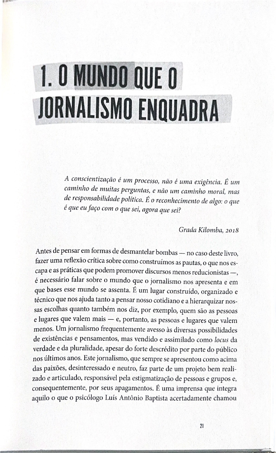 1.0 MUNDO QUE 0 JORNALISMO ENQUADRA A conscientização é um processo, não é uma exigência. É um caminho de muitas perguntas, e não um caminho moral, mas de responsabilidade política. É o reconhecimento de algo: o que é que eu faço com o que sei, agora que sei? Grada Kilomba, 2018 Antes de pensar em formas de desmantelar bombas - no caso deste livro, fazer uma reflexão crítica sobre como construímos as pautas, o que nos es- capa e as práticas que podem promover discursos menos reducionistas é necessário falar sobre o mundo que o jornalismo nos apresenta e em que bases esse mundo se assenta. É um lugar construído, organizado e técnico que nos ajuda tanto a pensar nosso cotidiano e a hierarquizar nos- sas escolhas quanto também nos diz, por exemplo, quem são as pessoas e lugares que valem mais - e, portanto, as pessoas e lugares que valem menos. Um jornalismo frequentemente avesso às diversas possibilidades de existências e pensamentos, mas vendido e assimilado como locus da verdade e da pluralidade, apesar do forte descrédito por parte do público nos últimos anos. Este jornalismo, que sempre se apresentou como acima das paixões, desinteressado e neutro, faz parte de um projeto bem reali- zado e articulado, responsável pela estigmatização de pessoas e grupos e, consequentemente, por seus apagamentos. É uma imprensa que integra aquilo o que psicólogo Luís Antônio Baptista acertadamente chamou 21de "os amoladores de facas": ela convive, produz, reproduz e compactua formas várias de racismo, misoginia e diversas termo com utilizado Alex Castro (2015) para dar conta de formas múltiplas de preconceito por ao outro e ao qual em breve retornarei aqui. Diz Baptista: Uma pista para o leitor: ligue a TV, os jornais, escute no rádio sobre temas do dia a dia. Perceba nas entrelinhas das com debates profissionais do psiquismo, com religiosos e artistas Atente para as falas sobre sexo, sobre identidades e pestes. Incorporados profissionais de prestígio, os amoladores de facas circulam dentro e fora em da mídia, produzindo a ingênua e eficaz impressão de uma fala individual e neutra (1999, p. 47). Nesse ambiente aparentemente desinteressado, os aliados daqueles que efetivamente políticas estivessem mutilam e atiram agem como se não buindo as de apagamento. No entanto, eles são os "agentes sem rostos que preparam o solo para esses sinistros atos" dem ser facilmente encontrados, como escreve o psicólogo, em para discursos. contri- e textos, falas, em modos de viver e pensar: "os facas, à semelhança dos cortadores de membros, fragmentam a da cotidianidade, remetendo-a a a casos Quero particularidades, modos de amoladores individuais" atos de chamar ainda mais atenção para o que é dito aqui: cúmplices e genocidas presentes nas falas das figuras autorizadas imprensa só ganham peso, credibilidade, amplitude e repercussão pela um processo de seleção, de escolha. É justamente por meio dessa após ção que esse discurso se naturaliza e, assim, ganha mais aliados, muitos deles não se percebendo como promotores da Não tenho menor dúvida de que um meio poderoso usado pelo jornalismo a amolar a faca foi, justamente, o discurso da objetividade, da clareza, para da transparência, da neutralidade. Ele voltou com força no contexto do que podemos chamar de "era da mas, felizmente, encon- trou não somente uma legião de adoradores e adoradoras de "fake (termo genérico demais para dar conta do ambiente da mas também uma população mais atenta aos modos de ver e enquadrar da imprensa. Falar sobre isso articulando teoria e prática nos ajuda a desnaturalizar as tantas molduras jornalísticas utilizadas como se fossem as únicas pos- síveis, como se suas bases não estivessem impregnadas de hierarquizações de gênero, de raça, de classe, de territórios etc. Isso porque essas imagens 22e textos, que consumimos de maneira mais fragmentada que nunca, nas- cem não apenas de um aparato técnico formado por jornais, sites, podcasts, rádio, mas de uma maneira ainda presente, também no ambiente acadêmico, de pensar e ensinar evitando a complexidade de um mundo assentado sobre sofrimentos e se apoiando em reducionismos e Isso não é afirmar necessário dizer que a sociedade e a academia não estão produzindo, há tempos, massa sobre si mesmas ou que estão avessas às dinâmicas e tensões impostas por modelos econômicos, pelo ambiente geopolítico e pelas mudanças Pelo contrário: é forte, principalmente a partir da popularização de discussões como, por exemplo, raça, gênero e um movimento de inflexão e de reconfiguração de epistemologias e práticas provocadas não só de fora para dentro, mas também de dentro para fora. Na academia, isso acontece tanto entre docentes e pesquisadoras quanto entre estudantes já atentas às relações de poder no campo do É, neste caso, um re- flexo de uma universidade brasileira que começou, felizmente, embora tardiamente, a de fato Por isso é interessante pensar, nesse sentido, na enorme ironia que se coloca: se, no ambiente acadêmico, discute-se há tanto tempo sobre o jornalismo e as construções midiáticas redutoras e violentas, por qual razão esses questionamentos não se refletem efetivamente na produção das notícias? Por que boa parte dos e das jornalistas se recusa a pensar sobre a própria produção? Ainda: o que levou uma parcela imensa da população a optar por um conteúdo desinformativo ao autodenominado "jornalismo profissional"? O que tudo isso diz da nossa imprensa? E das bibliografias e práticas das universidades? Podemos culpabilizar somente o mercado e o campo profissional, enquanto não evidenciarmos como a universidade também guarda, a despeito das mudanças recentes, fortes desigualdades e, no caso do jornalismo, ainda oferece uma perspectiva que coloca a técnica acima da reflexividade? 2 Segundo 0 Censo de Educação Superior (Ministério da divulgado em 2020, 0 país tinha 6