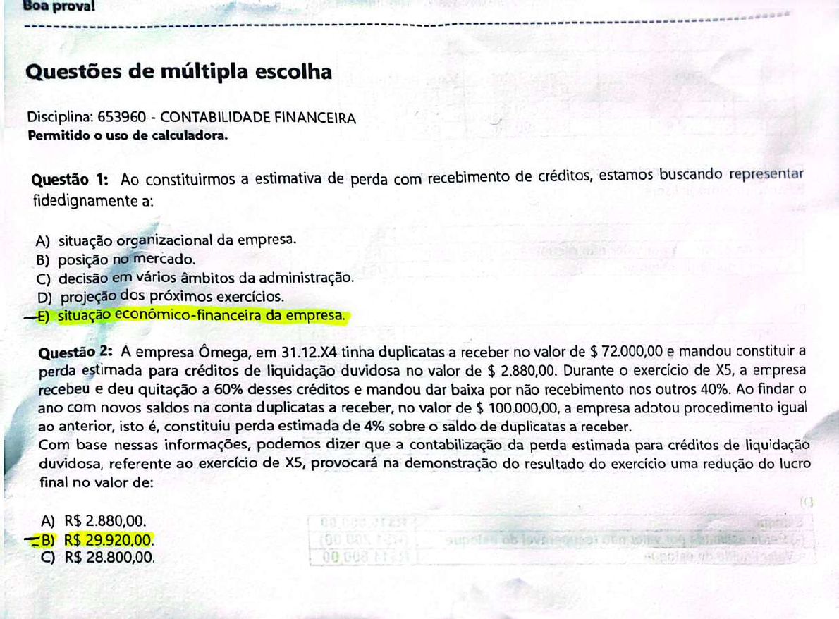 Boa prova! Questões de múltipla escolha Disciplina: 653960 - CONTABILIDADE FINANCEIRA Permitido o uso de calculadora. Questão 1: Ao constituirmos a estimativa de perda com recebimento de créditos, estamos buscando representar fidedignamente a: A) situação organizacional da empresa. B) posição no mercado. C) decisão em vários âmbitos da administração. D) projeção dos próximos exercícios. E) situação da empresa. Questão 2: A empresa em 31.12.X4 tinha duplicatas a receber no valor de $ 72.000,00 e mandou constituir a perda estimada para créditos de liquidação duvidosa no valor de $ 2.880,00. Durante exercício de X5, a empresa recebeu e deu quitação a 60% desses créditos e mandou dar baixa por não recebimento nos outros 40%. Ao findar o ano com novos saldos na conta duplicatas a receber, no valor de $ 100.000,00, a empresa adotou procedimento igual ao anterior, isto é, constituiu perda estimada de 4% sobre saldo de duplicatas a receber. Com base nessas informações, podemos dizer que a contabilização da perda estimada para créditos de liquidação duvidosa, referente ao exercício de X5, provocará na demonstração do resultado do exercício uma redução do lucro final no valor de: A) R$ 2.880,00. B) R$ 29.920,00. C) R$ 28.800,00.D) R$ 4.000,00. E) R$ Questão 3: A Companhia ABC possui um Ativo Imobilizado com valor inicial de R$ 500.000,00 e depreciação acumulada de R$ 200.000,00. Em razão do desempenho econômico abaixo do esperado, a empresa decidiu realizar teste de recuperabilidade do ativo. valor de venda foi estimado em R$ 250.000,00. Para realização da venda, a empresa incorreria em um custo de R$ Os fluxos de caixa futuros apontam para um valor em uso de R$ 215.000,00. Desta forma, após o registro da Perda por Redução ao Valor Recuperável, o valor contábil do ativo é de: A) R$ 235.000,00. B) R$ 300.000,00. C) D) E) Questão 4: o texto a seguir apresenta um único erro em um dos trechos grifados. Faça a identificação deste mediante a escolha da alternativa que contém o texto correto: "O valor adicionado demonstra a efetiva contribuição da empresa, dentro de uma visão global de desempenho, para a geração de riqueza da economia na qual está inserida, sendo a busca de todos os seus fatores de produção." A) "demonstra a solidez" B) "da situação" C) "em D) "se atenta aos excessos" E) "resultado do esforço Questão 5: Em 31.12.X1, a Cia. apresentava os seguintes dados relativos aos estoques finais de matéria- prima: MP Quantidade Custo Total Valor de Mercado A 1.000 R$2.000,00 R$1.800,00 B 1.500 R$6.000,00 R$7.500,00 C 2.000 R$8.000,00 R$7.000,00 Com base exclusivamente nesses dados, o valor total do estoque de matéria-prima que deve ser evidenciado no Balanço patrimonial será: A) Estoque (-) Perda estimada por valor não recuperável do estoque (R$1.500,00) = Valor líquido do estoque R$14.500,00 B) Estoque (-) Perda estimada por valor não recuperável do estoque = Valor líquido do estoque R$15.800,00 C) Estoque (-) Perda estimada por valor não recuperável do estoque (R$300,00) = Valor líquido do estoque D) Estoque (-) Perda estimada por valor não recuperável do estoque = Valor do estoqueE) Estoque (-) Perda estimada por valor não recuperável do estoque = Valor do estoque Questão 6: o ativo deve ser mensurado pelo direito de uso ao custo. o custo do ativo de direito de uso, conforme Item 24 do referido CPC, deve compreender, exceto: A) o valor da mensuração inicial do passivo de B) Quaisquer pagamentos de arrendamento efetuados até a data de menos quaisquer incentivos de arrendamentos recebidos. C) Quaisquer custos indiretos secundários incorridos pelo D) Estimativa de custos a serem incorridos pelo arrendatário na desmontagem e remoção do ativo subjacente. E) Quaisquer custos diretos iniciais incorridos pelo arrendatário. Questão 7: A demonstração do valor adicionado é um demonstrativo contábil que auxilia na medição e demonstração da capacidade da empresa: A) administrar seus B) gerar os tributos adequadamente. C) apresentar o desempenho positivo. gerar e distribuir a riqueza de uma E) testar sua imagem no mercado. Questão 8: Analise cautelosamente os itens apresentados sobre estimativa para ajuste a valor de mercado dos estoques e escolha a alternativa incorreta: Conforme citado na legislação, e pelos conceitos contábeis, a regra básica de avaliação na data do balanço é a do custo ou mercado, dos dois menor. Quando houver a perda de utilidade ou a redução no preço de venda ou de reposição de um item que diminua seu valor recuperável, ou seja, de mercado, a um nível abaixo do custo, deve-se então assumir como base de cálculo a título de transferência de posse, tal preço de mercado inferior ao custo, mediante uma estimativa, mantendo-se os controles de estoques ao valor original de custo. III método do custo ou mercado, dos dois o menor, tem como finalidade, portanto, eliminar dos estoques a parcela dos custos que provavelmente não seja recuperável. IV A aplicação desse critério deve ser na avaliação dos inventários de final de cada ano, para que as perdas resultantes de estragos, deterioração, obsolescência, redução na estrutura de preços de venda ou de reposição sejam reconhecidas nos resultados do exercício em que tais perdas ocorrerem e não no exercício em que a mercadoria é vendida, reposta ou transformada em sucata. A) é B) Os itens I e III são verdadeiros. Apenas o item é falso. D) o item IV é verdadeiro. E) Os itens III e IV são verdadeiros. Questão 9: Observe o texto a seguir e escolha a alternativa que preencha as lacunas corretamente: "As estimativas que reduzem o ativo são, ( visto que corrigem o saldo do ativo que tem ( ). A contrapartida na constituição de uma estimativa ativa será sempre uma conta de ( ), indedutível para fins de cálculo do resultado tributável de imposto de renda e contribuição social". A) "geralmente contas 