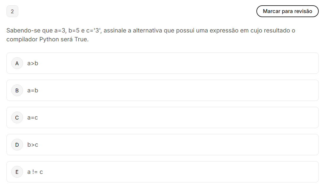 2 Marcar para revisão Sabendo-se que a=3, b=5 e c='3', assinale a alternativa que possui uma expressão em cujo resultado o compilador Python será True. A a>b B a=b C a=c D b>c E C