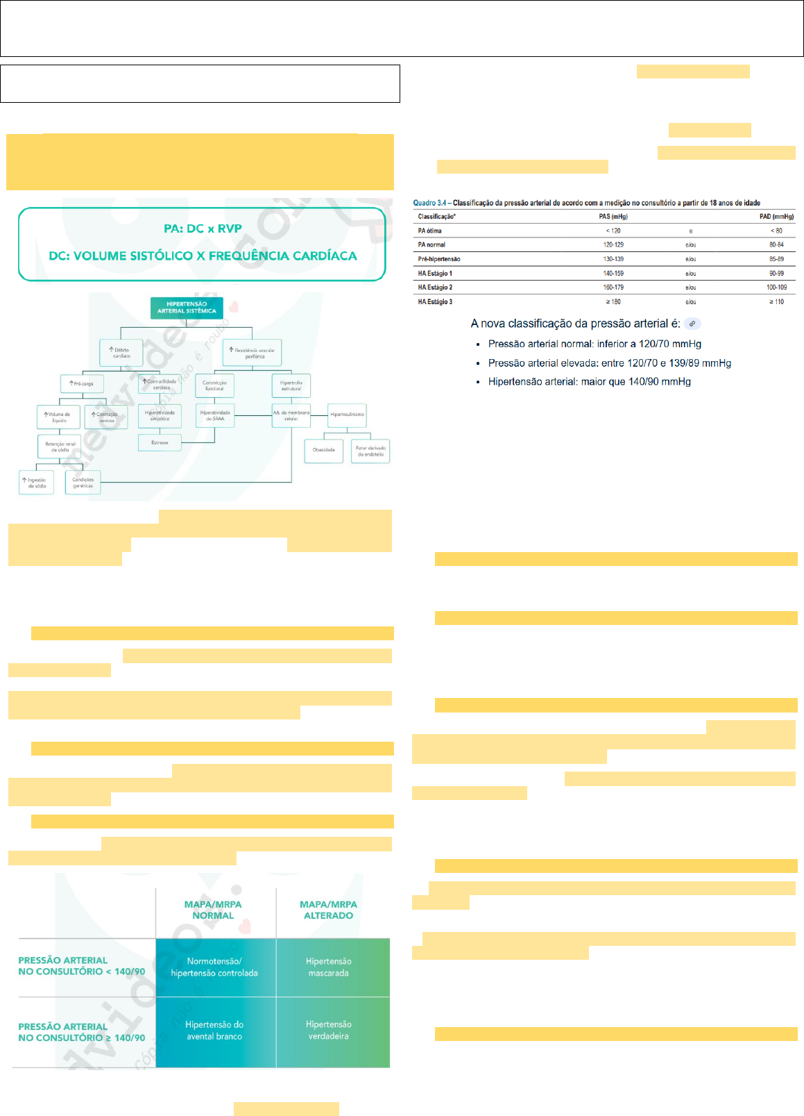Hipertensão Arterial Sistêmica DEFINIR E CLASSIFICAR A HIPERTENSÃO ARTERIAL (PRIMÁRIA E SECUNDÁRIA) → INTRODUÇÃO A hipertensão arterial ou pressão alta é uma doença crônica caracterizada pelos níveis elevados da pressão sanguínea nas artérias. Ela acontece quando os valores das pressões máxima e mínima são iguais ou ultrapassam os 140/90 mmHg (ou 14 por 9). - A pressão alta faz com que o coração tenha que exercer um esforço maior do que o normal para fazer com que o sangue seja distribuído corretamente no corpo. A hipertensão arterial é uma doença crônica não transmissível (DCNT) de origem multifatorial, envolvendo fatores genéticos e epigenéticos, além de influências ambientais e sociais → CLASSIFICAÇÃO Quanto ao tipo 1) Jaleco branco - Caracteriza-se pela elevação da pressão arterial apenas durante as consultas médicas, enquanto os valores fora do consultório permanecem normais. Pode levar a um diagnóstico incorreto de hipertensão e, por isso, a Monitorização Ambulatorial da Pressão Arterial (MAPA) ou a Monitorização Residencial da Pressão Arterial (MRPA) são recomendadas para confirmação 2) Sustentada - Neste caso, a pressão arterial permanece elevada tanto no consultório quanto em medições realizadas fora dele, confirmando o diagnóstico de hipertensão arterial e exigindo tratamento adequado 3) Mascarada - Ocorre quando a pressão arterial é normal durante as consultas médicas, mas se mantém elevada fora do consultório. Quanto ao estágio - PAS ≥ 140 mmHg e PAD 1,5 cm 3) Apneia obstrutiva do sono - Maior frequência em homens ou mulheres pós menopausa, ronco na maioria das noites, fragmentação do sono com pausas ou engasgos, sonole ̂ncia excessiva diurna, sono não reparador, fadiga, nicturia, cefaleia matinal, SM - Os mecanismos são aumento da atividade simpática, inflamação e disfunção endotelial - Determinada pela presença de 15 episódios/hora de hipopneia e apneia. De 15 a 30 episódios é apneia moderada e acima de 30 episódios, apneia grave, acompanhados de insaturação arterial 4) Coarctação da aorta - Fraqueza em MMII, pulsos em MMII ausentes ou de amplitude diminuída, HA com PAS 10 mmHg > em MMSS com relação aos MMSS, sopro sistólico interescapular e no tórax - Estreitamento congênito, geralmente localizado na região do arco aórtico, próximo ao ducto arterial. - Deve ser suspeita em crianças com hipertensão arterial, hipertrofia miocárdica e com insuficiência cardíaca # Causas endócrinas 1) Hiperaldosteronismo primário - HA resistente ou HA refratária e/ou com hipopotassemia (não obrigatória) e/ou com nódulo adrenal. O hiperaldosteronismo primário causa hipertensão secundária devido à produção excessiva de aldosterona pelas glândulas adrenais, causando retenção de sódio e água - Dx: Dosar aldosterona plasmática e atividade plasmática da renina; relação aldosterona plasmática/atividade plasmática da renina 2) Feocromocitoma - HA paroxística com a tríade composta por cefaleia, sudorese e palpitaço ̃es - Dx: Metanefrinas urinárias totais, catecolaminas plasmáticas 3) Hipotireoidismo - A redução dos hormônios tireoidianos causa diminuição da liberação de óxido nítrico e aumento da resistência vascular periférica → hipertensão diastólica predominante. 4) Hipertireoidismo - O excesso de hormônios tireoidianos leva a aumento do débito cardíaco e ativação do sistema renina-angiotensina-aldosterona (SRAA), resultando em hipertensão sistólica predominante. 5) Hiperparatireoidismo - O excesso de paratormônio (PTH) causa aumento do cálcio plasmático, que leva a vasoconstrição, estímulo ao SRAA, rigidez arterial 6) Síndrome de Cushing - O excesso de cortisol ativa receptores de mineralocorticoides, promovendo retenção de sódio e água → aumento do volume circulante 7) Obesidade: Aumento da gordura central ou generalizada 8) Acromegalia - HA em até 30% dos casos, além de diabetes, hipertrofia ventricular esquerda e apneia obstrutiva do sono. Outros sintomas: defeitos visuais, paralisia de nervos cranianos, cefaleia, macrognatia, crescimento de pés e mãos, hipertrofia de tecidos moles, macroglossia, complicações musculoesqueléticas DIAGNOSTICO → ANAMNESE - A anamnese deve incluir uma história clínica detalhada, com questionamento sobre o tempo de diagnóstico da hipertensão, tratamentos prévios e sintomas indicativos de lesão de órgãos-alvo (LOA). Também é essencial considerar antecedentes pessoais e familiares, fatores de risco cardiovascular e renal, comorbidades e aspectos biopsicossociais. - Deve-se investigar o uso de medicamentos e substâncias que possam interferir na pressão arterial, além de possíveis causas secundárias de hipertensão. → EXAME FÍSICO - O exame físico deve ser minucioso, incluindo a medida correta e repetida da pressão arterial e frequência cardíaca. Devem ser avaliados sinais de LOA, peso, altura, índice de massa corporal (IMC) e circunferência abdominal. - A palpação e ausculta cardíaca e de carótidas, além da verificação de pulsos, são recomendadas. O índice tornozelo-braquial (ITB) deve ser medido para detectar doença arterial obstrutiva periférica e avaliar o risco cardiovascular. - Em alguns casos, pode ser útil a medida da pressão arterial sistólica central (PASc) para diagnóstico da hipertensão sistólica isolada em jovens. - São considerados hipertensos → PAS ≥ 140 mmHg e/ou PAD ≥ 90 mmHg - Quando utilizadas as medidas de consultório, o diagnóstico de HA devera ́ ser sempre validado por MEDIÇÕES REPETIDAS, em condições ideais, em DUAS OU MAIS visitas médicas em intervalo de dias ou semanas; ou de maneira mais assertiva, realizando-se o diagnóstico com medidas fora do consultório (MAPA ou MRPA), EXCETUANDO-se aqueles pacientes que já apresentem LESÃO DE ÓRGÃO-ALVO ou DOENÇA CARDIOVASCULAR → EXAMES COMPLEMENTARES DE ROTINA → EX